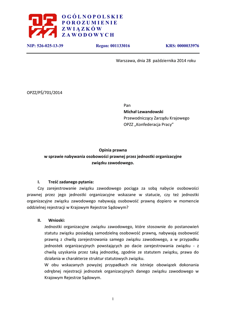 OGÓLNOPOLSKIE POROZUMIENIE ZWIĄZKÓW ZAWODOWYCH NIP: 526-025-13-39 Regon: 001133016 KRS: 0000033976 Warszawa, dnia 28 października 2014 roku OPZZ/PŚ/701/2014 Pan Michał Lewandowski Przewodniczący Zarządu Krajowego OPZZ „Konfederacja Pracy” Opinia prawna w sprawie nabywania osobowości prawnej przez jednostki organizacyjne związku zawodowego. I. Treść zadanego pytania: Czy zarejestrowanie związku zawodowego pociąga za sobą nabycie osobowości prawnej przez jego jednostki organizacyjne wskazane w statucie, czy też jednostki organizacyjne związku zawodowego nabywają osobowość prawną dopiero w momencie oddzielnej rejestracji w Krajowym Rejestrze Sądowym? II. Wnioski: Jednostki organizacyjne związku zawodowego, które stosownie do postanowień statutu związku posiadają samodzielną osobowość prawną, nabywają osobowość prawną z chwilą zarejestrowania samego związku zawodowego, a w przypadku jednostek organizacyjnych powstających po dacie zarejestrowania związku - z chwilą uzyskania przez taką jednostkę, zgodnie ze statutem związku, prawa do działania w charakterze struktur statutowych związku. W obu wskazanych powyżej przypadkach nie istnieje obowiązek dokonania odrębnej rejestracji jednostek organizacyjnych danego związku zawodowego w Krajowym Rejestrze Sądowym. 1 Formułowana przez niektóre podmioty teza o konieczności rejestracji w Krajowym Rejestrze Sądowym również jednostek organizacyjnych związku zawodowego jest nie do przyjęcia w świetle całokształtu uregulowań ustawy z dnia 23 maja 1991 roku o związkach zawodowych (tekst jednolity: Dz. U. z 2014 roku, poz. 167) - dalej zwana Ustawą oraz utrwalonej linii orzeczniczej Sądu Najwyższego. III. Uzasadnienie Rozstrzygając zagadnienie należy posłużyć się stosownymi przepisami Ustawy, wskazującymi na zasadność wniosków wyrażonych w niniejszej opinii. Zgodnie z art. 15 ust. 1 Ustawy, związek zawodowy oraz jego jednostki organizacyjne wskazane w statucie nabywają osobowość prawną z dniem zarejestrowania. Przepis ten należy interpretować w taki sposób, że postanowienia statutu mają decydujące znaczenie dla ustalenia osobowości prawnej jednostek organizacyjnych. Przepis ten rozstrzyga jedynie o tym, od jakiego momentu nabywają osobowość prawną jednostki organizacyjne wskazane w statucie jako posiadające odrębną od samego związku osobowość prawną, a nie o tym, że wszystkie jednostki organizacyjne związku podlegają rejestracji przez sąd. Niezmiernie istotnym w tej kwestii jest art. 14 ust. 1 Ustawy, zgodnie z którym związek zawodowy podlega obowiązkowi rejestracji w Krajowym Rejestrze Sądowym. Z jego treści jasno wynika, iż obowiązkowi rejestracji w Krajowym Rejestrze Sądowym podlega jedynie związek zawodowy, a nie jego jednostki organizacyjne. Pogląd taki wyraził Sąd Najwyższy w wyroku z dnia 16 lutego 2007 roku (II PK 196/06) dodatkowo podnosząc, że redakcja art. 15 ust. 1 Ustawy może co prawda budzić pewne wątpliwości, ale jedynie wówczas, gdy przepis ten interpretuje się samodzielnie, w oderwaniu od pozostałych unormowań ustawy oraz całego systemu prawnego. Warto bowiem zauważyć, że związek zawodowy powstaje w ściśle określony sposób, poprzez wykonanie stosownych czynności m.in. przez komitet założycielski w stosunku do sądu rejestrowego, który może odmówić rejestracji związku zawodowego, jeżeli nie zostały spełnione wymagania określone w art. 12 i 13 Ustawy lub jeżeli statut związku jest niezgodny z przepisami ustawy. Z powyższego wynika, iż w świetle przepisów Ustawy rejestracji podlega związek zawodowy, a nie jego wewnętrzne struktury organizacyjne. Przepisy Ustawy odnoszą się bowiem do komitetu założycielskiego związku zawodowego, a nie założycieli jego wewnętrznych jednostek organizacyjnych; przedmiotem oceny sądu rejestracyjnego jest statut związku zawodowego, a nie statut jego wewnętrznej jednostki (por. uchwała składu siedmiu sędziów Sądu Najwyższego z dnia 25 marca 1993 roku, I PZP 73/93). Ponadto w analizie omawianego problemu istotne znaczenie ma brzmienie art. 13 pkt 7 Ustawy, w myśl którego statut związku zawodowego ma określać strukturę organizacyjną 2 związku zawodowego ze wskazaniem, które z jednostek organizacyjnych związku mają osobowość prawną. Zgodnie z uchwałą składu siedmiu sędziów Sądu Najwyższego z dnia 25 marca 1993 roku (I PZP 73/93), zwrot "wskazanie, które jednostki organizacyjne związku zawodowego mają osobowość prawną" świadczy o tym, że wolą ustawodawcy było to, by sam statut związku zawodowego przesądzał o tym, które jego jednostki mają osobowość prawną. Dla podkreślenia tej intencji ustawodawca nie użył przy tym zwrotu "mogą mieć osobowość prawną", lecz posłużył się kategorycznym stwierdzeniem "mają osobowość prawną". Zatem sprawa posiadania lub braku osobowości prawnej jednostek organizacyjnych pozostawiona została w gestii danego związku zawodowego. Od postanowień statutu związku zależy, czy dana jego jednostka jest równocześnie osobą prawną. Jeżeli więc dany związek zawodowy decyduje się na przyznanie osobowości prawnej swoim jednostkom organizacyjnym, to o chwili nabycia osobowości przez te jednostki rozstrzyga decyzja związku znajdująca wyraz w treści statutu i jego zmianach. Na rzecz takiej wykładni przemawiają nie tylko racje logiczno-językowe i systemowe, lecz także wzgląd na zasadę wolności związkowej wynikającą - między innym - z ratyfikowanej przez Rzeczpospolitą Polską Konwencji nr 87 MOP z dnia 9 lipca 1948 roku (Dz. U. z 1958 r. Nr 29, poz. 125) dotyczącej wolności związkowej i ochrony praw związkowych. Wola związku zawodowego znajduje wyraz zwłaszcza w jego statucie, w którym jego członkowie rozstrzygają swobodnie między innymi o tym, czy i które jego jednostki organizacyjne mają osobowość prawną, zaś wprowadzenie w tym zakresie 