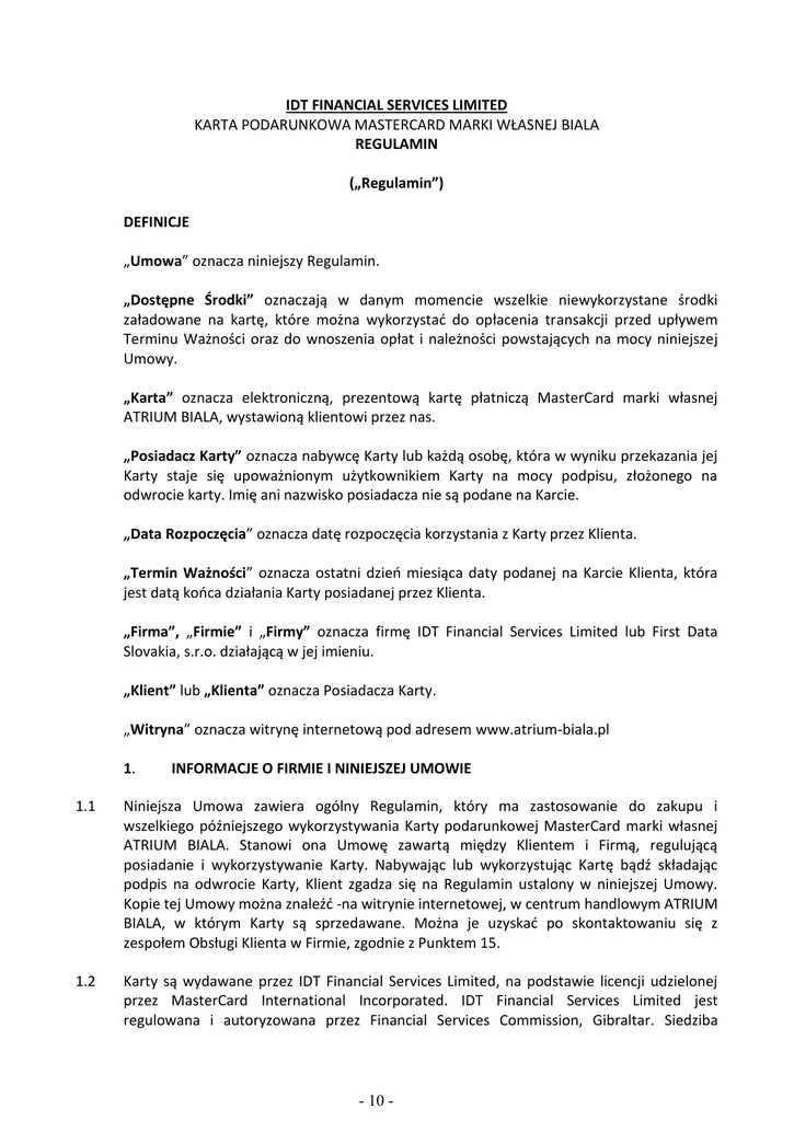 IDT FINANCIAL SERVICES LIMITED KARTA PODARUNKOWA MASTERCARD MARKI WŁASNEJ BIALA REGULAMIN („Regulamin”) DEFINICJE „Umowa” oznacza niniejszy Regulamin. „Dostępne Środki” oznaczają w danym momencie wszelkie niewykorzystane środki załadowane na kartę, które można wykorzystać do opłacenia transakcji przed upływem Terminu Ważności oraz do wnoszenia opłat i należności powstających na mocy niniejszej Umowy. „Karta” oznacza elektroniczną, prezentową kartę płatniczą MasterCard marki własnej ATRIUM BIALA, wystawioną klientowi przez nas. „Posiadacz Karty” oznacza nabywcę Karty lub każdą osobę, która w wyniku przekazania jej Karty staje się upoważnionym użytkownikiem Karty na mocy podpisu, złożonego na odwrocie karty. Imię ani nazwisko posiadacza nie są podane na Karcie. „Data Rozpoczęcia” oznacza datę rozpoczęcia korzystania z Karty przez Klienta. „Termin Ważności” oznacza ostatni dzień miesiąca daty podanej na Karcie Klienta, która jest datą końca działania Karty posiadanej przez Klienta. „Firma”, „Firmie” i „Firmy” oznacza firmę IDT Financial Services Limited lub First Data Slovakia, s.r.o. działającą w jej imieniu. „Klient” lub „Klienta” oznacza Posiadacza Karty. „Witryna” oznacza witrynę internetową pod adresem www.atrium-biala.pl 1. INFORMACJE O FIRMIE I NINIEJSZEJ UMOWIE 1.1 Niniejsza Umowa zawiera ogólny Regulamin, który ma zastosowanie do zakupu i wszelkiego późniejszego wykorzystywania Karty podarunkowej MasterCard marki własnej ATRIUM BIALA. Stanowi ona Umowę zawartą między Klientem i Firmą, regulującą posiadanie i wykorzystywanie Karty. Nabywając lub wykorzystując Kartę bądź składając podpis na odwrocie Karty, Klient zgadza się na Regulamin ustalony w niniejszej Umowy. Kopie tej Umowy można znaleźć -na witrynie internetowej, w centrum handlowym ATRIUM BIALA, w którym Karty są sprzedawane. Można je uzyskać po skontaktowaniu się z zespołem Obsługi Klienta w Firmie, zgodnie z Punktem 15. 1.2 Karty są wydawane przez IDT Financial Services Limited, na podstawie licencji udzielonej przez MasterCard International Incorporated. IDT Financial Services Limited jest regulowana i autoryzowana przez Financial Services Commission, Gibraltar. Siedziba - 10 - statutowa: 57-63 Line Wall Road, Gibraltar. Nr rejestracji 95716. Przez cały czas Karta pozostaje własnością IDT Financial Services Limited. 1.3 First Data Slovakia s.r.o. zapewnia obsługę klientów w zakresie Kart, zgodnie z postanowieniami poniższego Punktu 15, jako mianowany przez Firmę przedstawiciel obsługi klienta . 1.4 Niniejsza Umowa wchodzi w życie w Dacie Rozpoczęcia i traci ważność zgodnie z Punktem 10. Niniejsza Umowa i wszystkie informacje wymieniane między Firmą i Klientem są sporządzane w języku polskim. 2. KARTY 2.1 Karta jest kartą pre-paid (elektroniczną portmonetką), której można używać do zapłaty za towary i usługi u uczestniczących sprzedawców, akceptujących karty MasterCard, działających w centrum handlowym ATRIUM BIALA. Przeznaczona jest do wykorzystywania wyłącznie w tej ograniczonej sieci sklepów i punktów sprzedaży detalicznej, w których Klient jest fizycznie obecny. Jak w przypadku każdej karty płatniczej, Firma nie może zagwarantować, że dany sprzedawca akceptuje karty. W razie braku pewności, przed przystąpieniem do transakcji, informacje na ten temat należy sprawdzać u sprzedawcy. 2.2 Karta jest kartą pre-paid działającą w szczególnej lokalizacji i nie jest kartą kredytową oraz nie jest związana z rachunkiem bankowym Klienta. Karta przeznaczona jest do stosowania jako forma płatności, a środki załadowane na Kartę nie stanowią depozytu. Klient nie korzysta z odsetek od salda Karty. Karta traci ważność w dniu upływu Terminu Ważności i przestaje działać. Więcej informacji na ten temat podano w Punkcie 8 niniejszej Umowy. 2.3 W czasie zakupu Karty jest ona aktywowana i przekazywana Klientowi jako aktywna. Zazwyczaj Karta jest gotowa do użycia 15 minut po jej uaktywnieniu. Karta może być załadowana tylko jeden raz i nie można jej doładowywać, co oznacza, że po jej zakupie nie ma możliwości załadowania dodatkowych kwot na Kartę. 3. NABYCIE KARTY I JEJ PRZEKAZYWANIE 3.1 Kartę może otrzymać osoba, która ukończyła 15 lat. Klient może nabyć kartę tylko w wyznaczonym fizycznym punkcie sprzedaży (POS) placówek zlokalizowanych w centrum handlowym ATRIUM BIALA. Firma zastrzega sobie prawo do odmowy wydania lub sprzedaży Karty bez podawania powodów i Klient nie może składać skargi w związku z jej niewydaniem. Podczas nabywania Karty Firma może wymagać podania danych osobowych Klienta i jego adresu. Może również poprosić Klienta o przedstawienie dokumentów udowadniających takie dane. 3.2 Ponieważ Firma przeprowadza kontrole tożsamości, dane osobowe Klienta mogą być ujawniane firmom informacji kredytowej lub firmom zapobiegania oszustwom. Firmy takie mogą prowadzić rejestry tych informacji. 33 Zakup lub używanie karty wskaże Firmie, że Klient wyraża zgodę na przeprowadzanie kontroli opisanych w niniejszej Umowie. - 10 - 3.4 Klient może podpisać Kartę lub przekazać ją innej osobie, z zastrzeżeniem, że Karta nie została jeszcze podpisana. Kartę można przekazywać, o ile Klient nie podpisał jej na pasku podpisu, znajdującym się z tyłu Karty. Klient zobowiązuje się, że podczas przekazywania Karty innej osobie poinformuje ją o niniejszym Regulaminie, dotyczącym Karty. Klient zobowiązuje się nie przekazywać podpisanej Karty. Karta jest przeznaczona wyłącznie do płacenia za zakupy przez osobę, która podpisała Kartę, zgodnie z Punktem 5. 4. OPŁATY I OBCIĄŻENIA 4.1 Opłaty i obciążenia związane z tą Kartą stanowią integralną część niniejszego Regulaminu Następujące opłaty i obciążenia mają zastosowanie w związku z wystawieniem i wykorzystywaniem
