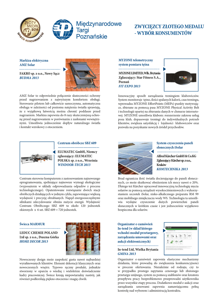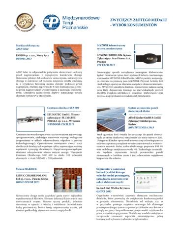 ZWYCIĘZCY ZŁOTEGO MEDALU - WYBÓR KONSUMENTÓW Markiza elektryczna AMZ Solar MYZONE telemetryczny system pomiaru tętna FAKRO sp. z o.o., Nowy Sącz BUDMA 2013 MYZONE LIMITED, Wlk. Brytania Zgłaszający: Star Fitness S.A., Poznań FIT EXPO 2013 AMZ Solar to odpowiednie połączenie skuteczności ochrony przed nagrzewaniem z najwyższym komfortem obsługi. Sterowanie pilotem lub całkowicie samoczynna, automatyczna obsługa w zależności od poziomu natężenia światła sprawiają, że z wyjątkową łatwością można chronić poddasze przed nagrzaniem. Markiza zapewnia do 8 razy skuteczniejszą ochronę przed nagrzewaniem w porównaniu z zasłonami wewnętrznymi. Umożliwia jednocześnie dopływ naturalnego światła i kontakt wzrokowy z otoczeniem. Innowacyjny sposób zarządzania treningiem klubowiczów. System monitoruje tętno, ilości spalanych kalorii, czas treningu, wprowadza MYZONE EffortPoints (MEPs)-punkty motywujące, zbierane za pomocą pasa MYZONE Physical Activity Belt i technologii opartej na zbieraniu danych w chmurze internetowej. MYZONE umożliwia klubom: rozszerzenie zakresu usług poza klub, dopasowuje treningi do indywidualnych potrzeb klientów, zwiększa satysfakcję i lojalności klubowiczów oraz pozwala na pozyskanie nowych źródeł przychodów. Centrum obróbcze SBZ 609 ELUMATEC GmbH, Niemcy zgłaszający: ELUMATEC POLSKA sp. z o.o., Września WINDOOR-TECH 2013 System czyszczenia paneli słonecznych iSolar Alfred Kärcher GmbH & Co.KG Zgłaszający: Kärcher sp. z o.o., Kraków KOMTECHNIKA 2013 Centrum sterowne komputerem z zastosowaniem najnowszego oprogramowania, spełniające najnowsze wymogi ekologiczne (wyposażenie w układy odprowadzania odpadów z procesu technologicznego). Opatentowane rozwiązanie dwóch stacji obróbczych działających w jednym cyklu, zapewniające większą wydajność i precyzję obrabianych. Napęd energooszczędnymi silnikami zdecydowanie obniża zużycie energii. Wydajność Centrum Obróbczego SBZ 609 to około 120 jednostek okiennych x 6 szt. SBZ 609 = 720 jednostek. Brud ogranicza ilość światła docierającego do paneli słonecznych, co może skutkować obniżeniem ich mocy nawet o 20%. Dlatego też Kärcher opracował innowacyjną technologię mycia solarów za pomocą urządzeń wysokociśnieniowych z wykorzystaniem szczotek iSolar, nisko-alkalicznego preparatu RM 99 oraz mobilnego zmiękczacza wody WS. Technologia ta umożliwia wydajne czyszczenie dużych powierzchni paneli słonecznych w krótkim czasie i jest jednocześnie wyjątkowo bezpieczna dla solarów. Świeca MARMUR Organizator e-zamówień In-tend (w skład którego wchodzi moduł przetargowy, zarządzania umowami oraz aukcji elektronicznych) LEDUC CHEMIE POLAND Ltd sp. z o.o., Duszna Górka HOME DECOR 2013 In-tend Ltd, Wielka Brytania GMINA 2013 Nowoczesny design może zaspokoić gusta nawet najbardziej wyrafinowanych klientów. Element dekoracji klasycznych oraz nowoczesnych wnętrz. Typowo ręczny produkt, jednakże stworzony w oparciu o wiedzę i wieloletnie doświadczenie kadry pracowniczej. Świece kreują niepowtarzalny nastrój, jak również podkreślają piękno otoczenia i magię chwili. Organizator e-zamówień zapewnia elastyczne mechanizmy działania, które prowadzą do zwiększenia konkurencyjności w procesie ofertowania. Niezależnie od rodzaju, czy to w przypadku prostego zapytania cenowego lub złożonego przetargu unijnego, system za pomocą szablonów oraz kreatora przepływu pracy bezproblemowo przeprowadzi użytkownika przez wszystkie etapy procesu. Dodatkowo moduł e-aukcji oraz zarządzania umowami zapewnia zamawiającemu pełną kontrolę nad wyborem i administracją kontraktu. ZWYCIĘZCY ZŁOTEGO MEDALU - WYBÓR KONSUMENTÓW Wózek na wąż DISCOVER 60 mb ½ ˝ DACHS SE – mikrokogenerator SenerTec Kraft –Wärme Energiesysteme GmbH, Niemcy. Zgłaszający: „IZOLACJE” sp. z o.o., sp. kom., Miszewko POLEKO 2013 CELL-FAST sp. z o.o., Stalowa Wola GARDENIA 2013 Jedyny na rynku wózek wyposażony w regulowaną rączkę spełniającą rolę blokady uniemożliwiającej przewracanie się wózka w czasie rozwijania węża. Wózek, poza swoją wyróżniającą się stylistyką, został wyposażony w gumowany uchwyt rączki z możliwością regulacji jej wysokości, składaną korbkę do nawijania i rozwijania węża, wzmocnione koła z ciekawą stylistyką kołpaka, składaną aluminiową stopkę, aluminiowe rurki, a także w kilka praktycznych uchwytów do przechowywania szybkozłączy i zraszaczy. Kogenerator DACHS to niemiecki kompaktowy blok energetyczny zasilany gazem ziemnym, LPG lub olejem napędowym. Ogrzewając obiekty DACHSEM, można jednocześnie produkować prąd ze sprawnością przewyższającą 100%. W Europie zamontowano ponad 30 tysięcy DACHSÓW, w Polsce 12. DACHSY przeznaczone są do kilkunastoletniej pracy ciągłej przy niskich kosztach serwisu. Inteligentny DACHS to rentowna alternatywa dla kotłów gazowych i OZE. To kocioł, który na siebie zarobi. Stół obrotowy typu 250 Fd Portfel damski z kryształkami Swarovskiego CV 240 Instytut Technologii Mechanicznej, Politechnika Poznańska ITM POLSKA 2013 NAUKA DLA GOSPODARKI Zakład Galanterii Skórzanej „Stefania” TARGI MODY POZNAŃ 2013 WIOSNA Napęd tarczy stołu obrotowy z przekładnią realizowane jest przez oryginalne rozwiązanie przekładni spiroidalnej typu dupleks, w której ślimak walcowy współpracuje z dwoma uzębieniami czołowymi o specjalnej geometrii. Stół obrotowy powstał w ramach projektu rozwojowego nr NR03-0107-10/2010 finansowanego przez Ministerstwo Nauki i Szkolnictwa Wyższego w latach 2010-13 i jest jednym z trzech rozwiązań. Twórcy: Piotr Frąckowiak, Adam Myszkowski, Krzysztof Netter, Jakub Olszewski, Marcin Pelic, Wojtek Ptaszyński, Andrzej Gessner, Roman Staniek. Model CV240 marki Giovani jest unikatowym połączeniem produktu wykonanego z najlepszych włoskich skór z Kryształami Swarovskiego, nadając mu niepowtar