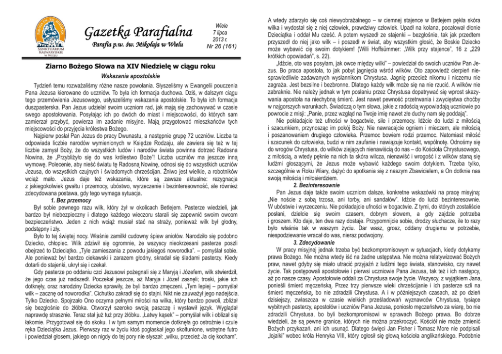 Gazetka Parafialna Parafia p.w. p.w. św. Mikołaja w Wielu Wiele 7 lipca 2013 r. Nr 26 (161) Ziarno Bożego Słowa na XIV Niedzielę w ciągu roku Wskazania apostolskie Tydzień temu rozważaliśmy różne nasze powołania. Słyszeliśmy w Ewangelii pouczenia Pana Jezusa kierowane do uczniów. To była ich formacja duchowa. Dziś, w dalszym ciągu tego przemówienia Jezusowego, usłyszeliśmy wskazania apostolskie. To była ich formacja duszpasterska. Pan Jezus udzielał swoim uczniom rad, jak mają się zachowywać w czasie swego apostołowania. Posyłając ich po dwóch do miast i miejscowości, do których sam zamierzał przybyć, powierza im zadanie misyjne. Mają przygotować mieszkańców tych miejscowości do przyjęcia królestwa Bożego. Najpierw posłał Pan Jezus do pracy Dwunastu, a następnie grupę 72 uczniów. Liczba ta odpowiada liczbie narodów wymienionych w Księdze Rodzaju, ale zawiera się też w tej liczbie zamysł Boży, że do wszystkich ludów i narodów świata powinna dotrzeć Radosna Nowina, że „Przybliżyło się do was królestwo Boże”! Liczba uczniów ma jeszcze inną wymowę. Polecenie, aby nieść światu tę Radosną Nowinę, odnosi się do wszystkich uczniów Jezusa, do wszystkich czujnych i świadomych chrześcijan. Żniwo jest wielkie, a robotników wciąż mało. Jezus daje też wskazania, które są zawsze aktualne: rezygnacja z jakiegokolwiek gwałtu i przemocy, ubóstwo, wyrzeczenie i bezinteresowność, ale również zdecydowana postawa, gdy tego wymaga sytuacja. 1. Bez przemocy Był sobie pewnego razu wilk, który żył w okolicach Betlejem. Pasterze wiedzieli, jak bardzo był niebezpieczny i dlatego każdego wieczoru starali się zapewnić swoim owcom bezpieczeństwo. Jeden z nich wciąż musiał stać na straży, ponieważ wilk był głodny, podstępny i zły. Było to tej świętej nocy. Właśnie zamilkł cudowny śpiew aniołów. Narodziło się podobno Dziecko, chłopiec. Wilk zdziwił się ogromnie, że wszyscy nieokrzesani pasterze poszli obejrzeć to Dzieciątko. „Tyle zamieszania z powodu jakiegoś noworodka”. – pomyślał sobie. Ale ponieważ był bardzo ciekawski i zarazem głodny, skradał się śladami pasterzy. Kiedy dotarli do stajenki, ukrył się i czekał. Gdy pasterze po oddaniu czci Jezusowi pożegnali się z Maryją i Józefem, wilk stwierdził, że jego czas już nadszedł. Poczekał jeszcze, aż Maryja i Józef zasnęli; troski, jakie ich dotknęły, oraz narodziny Dziecka sprawiły, że byli bardzo zmęczeni. „Tym lepiej – pomyślał wilk – zacznę od noworodka”. Cichutko zakradł się do stajni. Nikt nie zauważył jego nadejścia. Tylko Dziecko. Spojrzało Ono oczyma pełnymi miłości na wilka, który bardzo powoli, zbliżał się bezgłośnie do żłóbka. Otworzył szeroko swoją paszczę i wystawił język. Wyglądał naprawdę strasznie. Teraz stał już tuż przy żłóbku. „Łatwy kąsek” – pomyślał wilk i oblizał się łakomie. Przygotował się do skoku. I w tym samym momencie dotknęła go ostrożnie i czule ręka Dzieciątka Jezus. Pierwszy raz w życiu ktoś pogłaskał jego skołtunione, wstrętne futro i powiedział głosem, jakiego on nigdy do tej pory nie słyszał: „wilku, przecież Ja cię kocham”. A wtedy zdarzyło się coś niewyobrażalnego – w ciemnej stajence w Betlejem pękła skóra wilka i wydostał się z niej człowiek, prawdziwy człowiek. Upadł na kolana, pocałował dłonie Dzieciątka i oddał Mu cześć. A potem wyszedł ze stajenki – bezgłośnie, tak jak przedtem przyszedł do niej jako wilk – i poszedł w świat, aby wszystkim głosić, że Boskie Dziecko może wybawić cię swoim dotykiem! (Willi Hoffsümmer: „Wilk przy stajence”, 16 z „229 krótkich opowiadań”, s. 22). „Idźcie, oto was posyłam, jak owce między wilki” – powiedział do swoich uczniów Pan Jezus. Bo praca apostoła, to jak pobyt jagnięcia wśród wilków. Oto zapowiedź cierpień niesprawiedliwie zadawanych wysłannikom Chrystusa. Jagnię przecież nikomu i niczemu nie zagraża. Jest bezsilne i bezbronne. Dlatego każdy wilk może się na nie rzucić. A wilków nie zabraknie. Nie należy jednak w tym posłaniu przez Chrystusa dopatrywać się wprost skazywania apostoła na niechybną śmierć. Jest nawet pewność przetrwania i zwycięstwa choćby w najgorszych warunkach. Świadczą o tym słowa, jakie z radością wypowiadają uczniowie po powrocie z misji: „Panie, przez wzgląd na Twoje imię nawet złe duchy nam się poddają”. Nie pokładajcie też ufności w bogactwie, sile i przemocy. Idźcie do ludzi z miłością i szacunkiem, przynosząc im pokój Boży. Nie nawracajcie ogniem i mieczem, ale miłością i poszanowaniem drugiego człowieka. Przemoc bowiem rodzi przemoc. Natomiast miłość i szacunek do człowieka, budzi w nim zaufanie i nawiązuje kontakt, wspólnotę. Odnośmy się do wrogów Chrystusa, do wilków ziejących nienawiścią do nas – do Kościoła Chrystusowego, z miłością, a wtedy pęknie na nich ta skóra wilcza, nienawiść i wrogość i z wilków staną się ludźmi głoszącymi, że Jezus może wybawić każdego swoim dotykiem. Trzeba tylko, szczególnie w Roku Wiary, dążyć do spotkania się z naszym Zbawicielem, a On dotknie nas swoją miłością i miłosierdziem. 2. Bezinteresownie Pan Jezus daje także swoim uczniom dalsze, konkretne wskazówki na pracę misyjną: „Nie noście z sobą trzosa, ani torby, ani sandałów”. Idźcie do ludzi bezinteresownie. W ubóstwie i wyrzeczeniu. Nie pokładajcie ufności w bogactwie. Z tymi, do których zostaliście posłani, dzielcie się swoim czasem, dobrym słowem, a gdy zajdzie potrzeba i groszem. Kto daje, ten dwa razy dostaje. Przypomnijcie sobie, drodzy słuchacze, ile to razy było właśnie tak w waszym życiu. Dar wasz, grosz, oddany drugiemu w potrzebie, niespodziewanie wracał do was, nieraz podwojony. 3. Zdecydowanie W pracy misyjnej jednak trzeba być bezkomprom