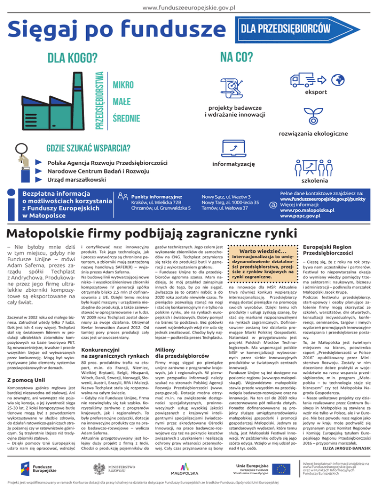 www.funduszeeuropejskie.gov.pl Sięgaj po fundusze na co? Dla kogo? przedsiębiorstwa dla przedsiębiorców Mikro eksport MaŁe projekty badawcze i wdrażanie innowacji Średnie rozwiązania ekologiczne Gdzie szukać wsparcia? Polska Agencja Rozwoju Przedsiębiorczości Narodowe Centrum Badań i Rozwoju Urząd marszałkowski Bezpłatna informacja o możliwościach korzystania z Funduszy Europejskich w Małopolsce Punkty informacyjne: Kraków, ul. Wielicka 72B Chrzanów, ul. Grunwaldzka 5 informatyzację szkolenia Nowy Sącz, ul. Wazów 3 Nowy Targ, al. 1000-lecia 35 Tarnów, ul. Wałowa 37 Pełne dane kontaktowe znajdziesz na: www.funduszeeuropejskie.gov.pl/punkty Więcej informacji: www.rpo.malopolska.pl www.popc.gov.pl Małopolskie firmy podbijają zagraniczne rynki – Nie byłoby mnie dziś w tym miejscu, gdyby nie Fundusze Unijne – mówi Adam Saferna, prezes zarządu spółki Techplast z Andrychowa. Produkowane przez jego firmę ultralekkie zbiorniki kompozytowe są eksportowane na cały świat. Zaczynał w 2002 roku od małego biznesu. Zatrudniał wtedy tylko 7 ludzi. Dziś jest ich 4 razy więcej. Techplast stał się światowym liderem w produkcji ultralekkich zbiorników kompozytowych na bazie tworzywa PET. Są nowocześniejsze, trwalsze i przede wszystkim lżejsze od wytwarzanych przez konkurencję. Mogą być wykorzystywane jako elementy systemów przeciwpożarowych w domach. Z pomocą Unii Kompozytowa gaśnica mgłowa jest bardziej niezawodna od stalowej. Ani na zewnątrz, ani wewnątrz nie pojawia się korozja, a jej żywotność sięga 25-30 lat. Z kolei kompozytowe butle tlenowe mogą być z powodzeniem wykorzystywane w służbie zdrowia, do działań ratowniczo-gaśniczych straży pożarnej czy w ratownictwie górniczym. Są trzykrotnie lżejsze niż tradycyjne zbiorniki stalowe. – Dzięki pomocy Unii Europejskiej udało nam się opracować, wdrożyć i certyfikować nasz innowacyjny produkt. Tak jego technologia, jak i proces wytwórczy są chronione patentem, a zbiorniki mają zastrzeżoną nazwę handlową SAFER(R) – wyjaśnia prezes Adam Saferna. Na budowę linii wytwarzającej nowe nisko- i wysokociśnieniowe zbiorniki kompozytowe IV generacji spółka otrzymała blisko 2,5 mln zł dofinansowania z UE. Dzięki temu można było kupić maszyny i urządzenia niezbędne do produkcji, a także zainwestować w oprogramowanie i w ludzi. W 2009 roku Techplast został doceniony za swoje działania. Otrzymał Kevlar Innovation Award 2012. Od tamtej pory proces produkcji cały czas jest unowocześniany. gazów technicznych. Jego celem jest wykonanie zbiorników do samochodów na CNG. Techplast przymierza się także do produkcji butli V generacji z wykorzystaniem grafenu. – Fundusze Unijne to dla przedsiębiorców ogromna szansa. Mam nadzieję, że mój przykład zainspiruje innych do tego, by po nie sięgać. Zwłaszcza że to ostatni nabór, a do 2020 roku zostało niewiele czasu. Te pieniądze pozwalają stanąć na nogi i stać się konkurencyjnym nie tylko na polskim rynku, ale na rynkach europejskich i światowych. Dobry pomysł na biznes to podstawa. Bez gotówki nawet najśmielszych wizji nie uda się jednak zrealizować. Choćby były najlepsze – podkreśla prezes Techplastu. Konkurencyjni na zagranicznych rynkach Miliony dla przedsiębiorców 80 proc. produktów trafia na eksport, m.in. do Francji, Niemiec, Wielkiej Brytanii, Belgii, Hiszpanii, Włoch, Danii, Szwecji, Norwegii, Słowenii, Austrii, Brazylii, RPA i Malezji. Nazwa Techplast stała się rozpoznawalna na całym świecie. – Gdyby nie Fundusze Unijne, firma nie rozwinęłaby się tak szybko. Korzystaliśmy zarówno z programów krajowych, jak i regionalnych. To były preferencyjne pożyczki, dotacje na innowacyjne produkty czy na prace badawczo-rozwojowe – wylicza Adam Saferna. Aktualnie przygotowywany jest kolejny duży projekt z firmą z Indii. Chodzi o produkcję pojemników do Firmy mogą sięgać po pieniądze unijne zarówno z programów krajowych, jak i regionalnych. W pierwszym przypadku informacji należy szukać na stronach Polskiej Agencji Rozwoju Przedsiębiorczości (www. parp.gov.pl). Dotacje można otrzymać m.in. na zwiększenie dostępności specjalistycznych, proinnowacyjnych usług wysokiej jakości powiązanych z krajowymi inteligentnymi specjalizacjami świadczonymi przez akredytowane Ośrodki Innowacji, na prace badawczo-rozwojowe czy też na pokrycie kosztów związanych z uzyskaniem i realizacją ochrony praw własności przemysłowej. Cały czas przyznawane są bony Warto wiedzieć… Internacjonalizacja to umiędzynarodowienie działalności przedsiębiorstwa, przejście z rynków krajowych na rynki zagraniczne. na innowacje dla MŚP. Aktualnie trwa również konkurs wspierający internacjonalizację. Przedsiębiorcy mogą dostać pieniądze na promocję swoich wyrobów. Dzięki temu ich produkty i usługi zyskają szansę, by stać się markami rozpoznawalnymi na rynkach zagranicznych. Dofinansowane zostaną też działania promujące Marki Polskiej Gospodarki. Natomiast w przygotowaniu jest projekt Polskich Mostów Technologicznych. Ma wspomagać polskie MŚP w komercjalizacji wytworzonych przez siebie innowacyjnych produktów w światowych centrach innowacji. Fundusze Unijne są też dostępne na poziomie regionu (www.rpo.malopolska.pl). Województwo małopolskie stawia przede wszystkim na przedsięwzięcia badawczo-rozwojowe oraz na innowacje. Na ten cel do 2020 roku zarezerwowano pół miliarda złotych. Ponadto dofinansowywane są projekty służące umiędzynarodowieniu małopolskiej gospodarki i promocji gospodarczej Małopolski. Jednym ze sztandarowych wydarzeń, które temu służą, jest Małopolski Festiwal Innowacji. W październiku odbyła się jego szósta edycja. Wzięło w niej udział ponad 4 tys. osób. Europejski Region Przedsiębiorczości – Cieszę się, że z roku na rok przybywa nam uczestników i partnerów. Festiwal to niepowtarzalna okazja