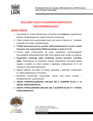 Dział Promocji i Marketingu REGULAMIN VI EDYCJI KOLOROWEGO UNIWERSYTETU ROK AKADEMICKI 20016/17 ZASADY OGÓLNE 1. Uniwersytet im. Adama Mickiewicza w Poznaniu jest jedynym organizatorem projektu edukacyjnego pod nazwą: Kolorowy Uniwersytet. 2. Celem projektu jest popularyzacja nauki oraz pomoc dzieciom w rozwijaniu potencjału twórczego i intelektualnego. 3. Projekt skierowany jest do uczniów szkół podstawowych z terenu miasta Poznania oraz województwa Wielkopolskiego w wieku 8-12 lat. 4. Tematy zajęć proponowane są przez naukowców reprezentujących poszczególne wydziały/jednostki UAM, które zgłoszą chęć udziału w projekcie. 5. Organizator zastrzega sobie możliwość zmiany terminów i tematów zajęć. Każdorazowo po dokonaniu zmiany odpowiednia informacja będzie wysłana e-mailem na adres podany w rejestracji (maksymalnie do 5 dni roboczych przed datą wydarzenia). 6. Zajęcia odbywać się będą na terenie wydziałów i jednostek Uniwersytetu im. Adama Mickiewicza w Poznaniu. 7. Studentów Kolorowego Uniwersytetu tworzą dwie grupy uczniów – przedpołudniowa i popołudniowa. 8. GRUPA PRZEDPOŁUDNIOWA SKŁADA SIĘ Z UCZNIÓW KLAS II I III SZKÓŁ PODSTAWOWYCH. 9. GRUPA POPOŁUDNIOWA SKŁADA SIĘ Z UCZNIÓW KLAS IV I V SZKÓŁ PODSTAWOWYCH. ul. Św. Marcin 90, 61-809 Poznań NIP 777 00 06 350, REGON 000001293 tel. +48 61 829 4399 [email protected] www.amu.edu.pl 1 10. Każda z grup ma swój, odrębny plan zajęć. 11. Harmonogram roku akademickiego 2016/17 będzie umieszczony na stronie internetowej www.kolorowyuniwersytet.amu.edu.pl w zakładce Kolorowy Uniwersytet -> I Grupa lub II Grupa 12. STUDENCI, KTÓRYCH OPIEKUNOWIE/RODZICE NIE POTWIERDZĄ OBECNOŚCI, TRACĄ MIEJSCE NA DANYCH ZAJĘCIACH. W takiej sytuacji miejsca będą proponowane studentom z listy rezerwowej. 13. Zapisanie dzieci na Kolorowy Uniwersytet 2016/17 oznacza jednocześnie zgodę opiekunów prawnych na publikowanie zdjęć z ich wizerunkiem na stronie internetowej www.kolorowyuniwersytet.amu.edu.pl, funpage’u na portalu facebook.com, materiałach promocyjnych, prasowych projektu oraz uczelni itp. 14. NAUCZYCIELE, RODZICE, OPIEKUNOWIE NIE UCZESTNICZĄ W ZAJĘCIACH!!! Powinni czekać poza salą wykładową. W trakcie zajęć dzieci są pod opieką organizatora, który dba o ich bezpieczeństwo. ZASADY REJESTRACJI W ROKU AKADEMICKIM 2016/17 1. Udział w zajęciach organizowanych w ramach projektu Kolorowy Uniwersytet jest BEZPŁATNY. 2. Każde dziecko zarejestrowane jako student Kolorowego Uniwersytetu ma zarezerwowane miejsce na zajęciach. Obecność należy potwierdzać każdorazowo przed zajęciami. 3. Rejestracja obowiązuje uczniów szkół podstawowych z terenu miasta Poznania oraz województwa Wielkopolskiego w wieku 8-12 lat (uczniowie klas II, III, IV, V). 4. Jeśli dziecko ma ukończone 7 lat, a uczęszcza do szkoły podstawowej od 6 roku życia i jest aktualnie uczniem II klasy – KWALIFIKUJE SIĘ DO UDZIAŁU W PROJEKCIE. 5. PIERWSZEŃSTWO UCZESTNICTWA W VI EDYCJI PROJEKTU MAJĄ GRUPY ZORGANIZOWANE Z WIELKOPOLSKI ORAZ TERENU MIASTA POZNANIA, KTÓRE JESZCZE NIE BRAŁY UDZIAŁU W PROJEKCIE. 6. GRUPA ZORGANIZOWANA OZNACZA CO NAJMNIEJ 10 DZIECI WRAZ Z JEDNYM OPIEKUNEM/NAUCZYCIELEM/RODZICEM. 2 (Nie musi to być klasa. Może to być grupa np. kilka dzieci z różnych szkół, których rodzice/opiekuni się znają i przyjeżdżają razem). 7. REJESTRACJA DO GRUPY PRZEDPOŁUDNIOWEJ OBOWIĄZUJE TYLKO I WYŁĄCZNIE UCZNIÓW KLAS II i III SP. 8. REJESTRACJA DO GRUPY POPOŁUDNIOWEJ OBOWIĄZUJE TYLKO I WYŁĄCZNIE UCZNIÓW KLAS IV i V SP. 9. LIMIT STUDENTÓW W JEDNEJ GRUPIE TO MAKSYMALNIE 200 OSÓB. 10. ZE WZGLĘDU NA OGROMNE ZAINTERESOWANIE PROJEKTEM, OD ROKU AKADEMICKIEGO 2015/16, STUDENTEM KOLOROWEGO UNIWERSYTETU MOŻNA BYĆ TYLKO JEDEN RAZ! 11. PROSIMY NIE REJESTROWAĆ DZIECI, GRUP, KTÓRE UCZESTNICZYŁY W PROJEKCIE W POPRZEDNICH EDYCJACH PONIEWAŻ POWTARZAJĄCE SIĘ NAZWISKA SYSTEM BĘDZIE AUTOMATYCZNIE ODRZUCAŁ I TAKA REJESTRACJA NIE ZOSTANIE EKSPORTOWANA DO BAZY ZGŁOSZEŃ! 12. Warunkiem uczestnictwa w projekcie jest zarejestrowanie dziecka przez nauczyciela lub opiekuna grupy za pośrednictwem strony: www.kolorowyuniw ersytet.amu.edu.pl/rejestracja. 13. Osoba dokonująca rejestracji staje się jednocześnie kontaktem dla koordynatora projektu. 14. Zgłoszenia po zamknięciu list studentów zostaną wpisane na listę rezerwową. MŁODZI WYKŁADOWCY 1. W trakcie każdego spotkania drugim wykładowcą może być każdy student KU, który przygotuje swoje wystąpienie. 2. Wykład młodego naukowca powinien nawiązywać do tematu zajęć, który będzie prezentował wykładowca dorosły. Młody naukowiec może również opowiedzieć publiczności o swoich zainteresowaniach, hobby czy pasjach, nawet wtedy, gdy temat wystąpienia nie będzie bezpośrednio związany z głównym przedmiotem zajęć. 3. Zgłoszeń młodych wykładowców dokonują nauczyciele/opiekunowie/rodzice przesyłając taką informację na adres: [email protected]. PRAWA I OBOWIĄZKI 3 1. Studentem Kolorowego Uniwersytetu może zostać dziecko w wieku 8 – 12 lat. 2. Studentem grupy przedpołudniowej może zostać każde dziecko z klasy II i III szkoły podstawowej z terenu miasta Poznania oraz województwa Wielkopolskiego. 3. Studentem grupy popołudniowej może zostać każde dziecko z klasy IV i V szkoły podstawowej z terenu miasta Poznania oraz województwa Wielkopolskiego. 4. Studenci winni przybywać na zajęcia na czas (ok. 15 min. przed planowanym rozpoczęciem) i zachowywać się zgodnie z zasadami obowiązującymi w szkole. 5. Na zajęciach Kolorowego Uniwersytetu zabrania się spożywania posiłków! 6. Każdy student otrzyma koszulkę oraz indeks, do którego na zajęciach będzie otrzymywał specjalną pieczątkę potwierdzającą obecność. 7. Co najmniej 4 obecności w trakcie całego roku akademickiego gratyfikują do otrzymania dyplomu podczas Absolutorium. 8. Dyplom jest potwierdzeniem uczestnictwa w