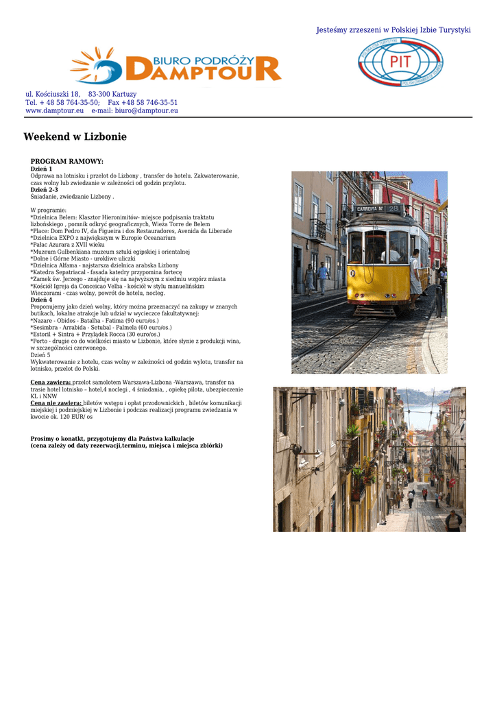 Jesteśmy zrzeszeni w Polskiej Izbie Turystyki ul. Kościuszki 18, 83-300 Kartuzy Tel. + 48 58 764-35-50; Fax +48 58 746-35-51 www.damptour.eu e-mail: [email protected] Weekend w Lizbonie PROGRAM RAMOWY: Dzień 1 Odprawa na lotnisku i przelot do Lizbony , transfer do hotelu. Zakwaterowanie, czas wolny lub zwiedzanie w zależności od godzin przylotu. Dzień 2-3 Śniadanie, zwiedzanie Lizbony . W programie: *Dzielnica Belem: Klasztor Hieronimitów- miejsce podpisania traktatu lizbońskiego , pomnik odkryć geograficznych, Wieża Torre de Belem *Place: Dom Pedro IV, da Figueira i dos Restauradores, Avenida da Liberade *Dzielnica EXPO z największym w Europie Oceanarium *Pałac Azurara z XVII wieku *Muzeum Gulbenkiana muzeum sztuki egipskiej i orientalnej *Dolne i Górne Miasto - urokliwe uliczki *Dzielnica Alfama - najstarsza dzielnica arabska Lizbony *Katedra Sepatriacal - fasada katedry przypomina fortecę *Zamek św. Jerzego - znajduje się na najwyższym z siedmiu wzgórz miasta *Kościół Igreja da Conceicao Velha - kościół w stylu manuelińskim Wieczorami - czas wolny, powrót do hotelu, nocleg. Dzień 4 Proponujemy jako dzień wolny, który można przeznaczyć na zakupy w znanych butikach, lokalne atrakcje lub udział w wycieczce fakultatywnej: *Nazare - Obidos - Batalha - Fatima (90 euro/os.) *Sesimbra - Arrabida - Setubal - Palmela (60 euro/os.) *Estoril + Sintra + Przylądek Rocca (30 euro/os.) *Porto - drugie co do wielkości miasto w Lizbonie, które słynie z produkcji wina, w szczególności czerwonego. Dzień 5 Wykwaterowanie z hotelu, czas wolny w zależności od godzin wylotu, transfer na lotnisko, przelot do Polski. Cena zawiera: przelot samolotem Warszawa-Lizbona -Warszawa, transfer na trasie hotel lotnisko – hotel,4 noclegi , 4 śniadania, , opiekę pilota, ubezpieczenie KL i NNW Cena nie zawiera: biletów wstępu i opłat przodownickich , biletów komunikacji miejskiej i podmiejskiej w Lizbonie i podczas realizacji programu zwiedzania w kwocie ok. 120 EUR/ os Prosimy o konatkt, przygotujemy dla Państwa kalkulacje (cena zależy od daty rezerwacji,terminu, miejsca i miejsca zbiórki)