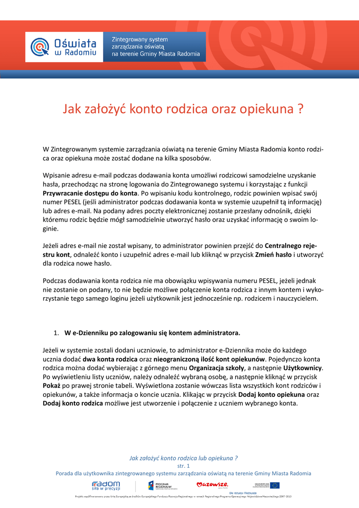 Jak założyć konto rodzica oraz opiekuna ? W Zintegrowanym systemie zarządzania oświatą na terenie Gminy Miasta Radomia konto rodzica oraz opiekuna może zostać dodane na kilka sposobów. Wpisanie adresu e-mail podczas dodawania konta umożliwi rodzicowi samodzielne uzyskanie hasła, przechodząc na stronę logowania do Zintegrowanego systemu i korzystając z funkcji Przywracanie dostępu do konta. Po wpisaniu kodu kontrolnego, rodzic powinien wpisać swój numer PESEL (jeśli administrator podczas dodawania konta w systemie uzupełnił tą informację) lub adres e-mail. Na podany adres poczty elektronicznej zostanie przesłany odnośnik, dzięki któremu rodzic będzie mógł samodzielnie utworzyć hasło oraz uzyskać informację o swoim loginie. Jeżeli adres e-mail nie został wpisany, to administrator powinien przejść do Centralnego rejestru kont, odnaleźć konto i uzupełnić adres e-mail lub kliknąć w przycisk Zmień hasło i utworzyć dla rodzica nowe hasło. Podczas dodawania konta rodzica nie ma obowiązku wpisywania numeru PESEL, jeżeli jednak nie zostanie on podany, to nie będzie możliwe połączenie konta rodzica z innym kontem i wykorzystanie tego samego loginu jeżeli użytkownik jest jednocześnie np. rodzicem i nauczycielem. 1. W e-Dzienniku po zalogowaniu się kontem administratora. Jeżeli w systemie zostali dodani uczniowie, to administrator e-Dziennika może do każdego ucznia dodać dwa konta rodzica oraz nieograniczoną ilość kont opiekunów. Pojedynczo konta rodzica można dodać wybierając z górnego menu Organizacja szkoły, a następnie Użytkownicy. Po wyświetleniu listy uczniów, należy odnaleźć wybraną osobę, a następnie kliknąć w przycisk Pokaż po prawej stronie tabeli. Wyświetlona zostanie wówczas lista wszystkich kont rodziców i opiekunów, a także informacja o koncie ucznia. Klikając w przycisk Dodaj konto opiekuna oraz Dodaj konto rodzica możliwe jest utworzenie i połączenie z uczniem wybranego konta. Jak założyć konto rodzica lub opiekuna ? str. 1 Porada dla użytkownika zintegrowanego systemu zarządzania oświatą na terenie Gminy Miasta Radomia Aby szybko utworzyć konta rodziców dla wielu uczniów tej samej klasy, należy skorzystać z przycisku Dodaj konta rodziców, zlokalizowanego w prawym górnym rogu tabeli. Po kliknięciu w niego, wyświetlony zostanie widok seryjnego dodawania kont rodziców. Po wybraniu klasy, wyświetlone zostaną nazwiska wszystkich uczniów znajdujących się w tej klasie. W głównej części tabeli należy wprowadzić imię, nazwisko, numer PESEL (w przypadku jego braku należy zaznaczyć pozycję Brak nr PESEL) oraz adres e-mail rodzica. Po wprowadzeniu informacji dla wszystkich rodziców, należy zapisać zmiany, klikając w przycisk Zapisz na dole tabeli. 2. W e-Dzienniku po zalogowaniu się kontem wychowawcy klasy Wychowawca klasy może także dodawać w systemie konta rodziców, ale zasięg takiego dodawania ograniczony jest tylko do uczniów klasy, w której nauczyciel jest wychowawcą. Konta rodziców można dodać w widoku: Organizacja szkoły → Konta rodziców. Wychowawca nie może jednak tworzyć kont rodziców dla uczniów spoza klasy, w której jest on wychowawcą. Po wyświetleniu listy uczniów, należy odnaleźć wybraną osobę, a następnie kliknąć w przycisk Pokaż po prawej stronie tabeli. Wyświetlona zostanie wówczas lista wszystkich kont rodziców i opiekunów, a także informacja o koncie ucznia. Klikając w przycisk Dodaj konto opiekuna oraz Dodaj konto rodzica możliwe jest utworzenie i połączenie z uczniem wybranego konta. Aby szybko utworzyć konta rodziców dla wielu uczniów tej samej klasy, należy skorzystać z przycisku Dodaj konta rodziców, zlokalizowanego w prawym górnym rogu tabeli. Po kliknięciu w niego, wyświetlony zostanie widok seryjnego dodawania kont rodziców. Po wybraniu klasy, wyświetlone zostaną nazwiska wszystkich uczniów znajdujących się w tej klasie. W głównej części tabeli należy wprowadzić imię, nazwisko, numer PESEL (w przypadku jego braku należy zaznaczyć pozycję Brak nr PESEL) oraz adres e-mail rodzica. Po wprowadzeniu informacji dla wszystkich rodziców, należy zapisać zmiany, klikając w przycisk Zapisz na dole tabeli. Jak założyć konto rodzica lub opiekuna ? str. 2 Porada dla użytkownika zintegrowanego systemu zarządzania oświatą na terenie Gminy Miasta Radomia 3. W e-Sekretariacie kontem administratora/dyrektora/sekretarza Użytkownik uprawniony do pracy w aplikacji e-Sekretariat (administrator, dyrektor, sekretarz) może dodać do systemu konta rodziców, wybierając w lewym dolnym rogu nazwę jednostki, a następnie rozwijając listę Użytkownicy i wybierając pozycję Lista kont rodziców/uczniów. W głównym oknie e-Sekretariatu zostaną wyświetlone konta wszystkich uczniów w jednostce. Ilość wyświetlanych pozycji można zawęzić przy pomocy filtrów w górnej części okna, np. Wybierz klasę. Po odnalezieniu ucznia, należy kliknąć w przycisk Szczegóły po prawej stronie tabeli, a następnie w nowym oknie w przycisk Dodaj konto opiekuna lub Dodaj konto rodzica. W przeciwieństwie do e-Dziennika, poprzez e-Sekretariat nie ma możliwości seryjnego dodawania kont rodziców i opiekunów. Jak założyć konto rodzica lub opiekuna ? str. 3 Porada dla użytkownika zintegrowanego systemu zarządzania oświatą na terenie Gminy Miasta Radomia