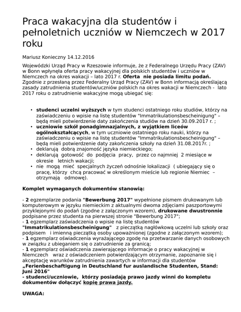 Praca wakacyjna dla studentów i pełnoletnich uczniów w Niemczech w 2017 roku Mariusz Konieczny 14.12.2016 Wojewódzki Urząd Pracy w Rzeszowie informuje, że z Federalnego Urzędu Pracy (ZAV) w Bonn wpłynęła oferta pracy wakacyjnej dla polskich studentów i uczniów w Niemczech na okres wakacji – lato 2017 r. Oferta nie posiada limitu podań. Zgodnie z przesłaną przez Federalny Urząd Pracy (ZAV) w Bonn informacją określającą zasady zatrudnienia studentów/uczniów polskich na okres wakacji w Niemczech - lato 2017 roku o zatrudnienie wakacyjne mogą ubiegać się: • studenci uczelni wyższych w tym studenci ostatniego roku studiów, którzy na zaświadczeniu o wpisie na listę studentów "Immatrikulationsbescheinigung" – będą mieli potwierdzenie daty zakończenia studiów na dzień 30.09.2017 r. ; • uczniowie szkół ponadgimnazjalnych, z wyjątkiem liceów ogólnokształcących, w tym uczniowie ostatniego roku nauki, którzy na zaświadczeniu o wpisie na listę studentów "Immatrikulationsbescheinigung" – będą mieli potwierdzenie daty zakończenia szkoły na dzień 31.08.2017r. ; • deklarują dobrą znajomość języka niemieckiego; • deklarują gotowość do podjęcia pracy, przez co najmniej 2 miesiące w okresie letnich wakacji; • nie mogą mieć specjalnych życzeń odnośnie lokalizacji ( ubiegający się o pracę, którzy chcą pracować w określonym mieście lub regionie Niemiec – otrzymają odmowę). Komplet wymaganych dokumentów stanowią: - 2 egzemplarze podania "Bewerbung 2017" wypełnione pismem drukowanym lub komputerowym w języku niemieckim z aktualnymi dwoma zdjęciami paszportowymi przyklejonymi do podań (zgodne z załączonym wzorem), drukowane dwustronnie podpisane przez studenta na pierwszej stronie "Bewerbung 2017"; - 1 egzemplarz zaświadczenia o wpisie na listę studentów "Immatrikulationsbescheinigung" z pieczątką nagłówkową uczelni lub szkoły oraz podpisem i imienną pieczątką osoby upoważnionej (zgodne z załączonym wzorem); - 1 egzemplarz oświadczenia wyrażającego zgodę na przetwarzanie danych osobowych w związku z ubieganiem się o zatrudnienie za granicą; - 1 egzemplarz oświadczenia zawierającego informacje o pracy wakacyjnej w Niemczech wraz z oświadczeniem potwierdzającym otrzymanie, zapoznanie się i akceptację warunków zatrudnienia zawartych w informacji dla studentów „Ferienbeschaftigung in Deutschland fur auslandische Studenten, Stand: Juni 2016" - studenci/uczniowie, którzy posiadają prawo jazdy winni do kompletu dokumentów dołączyć kopię prawa jazdy. UWAGA: • Student/uczeń zobowiązany jest posiadać drugi egzemplarz zaświadczenia o wpisie na listę studentów „Immatrikulationsbescheinigung", który będzie niezbędny dla pracodawcy niemieckiego; • ZAV akceptuje tylko dokumenty zgodne z w/w wzorami z oryginalnymi pieczęciami uczelni; • Podanie "Bewerbung 2017" należy obowiązkowo wydrukować na 1 kartce dwustronnie (wydrukowane na 2 kartkach jednostronnie zostaną odrzucone); • Studenci/uczniowie, którzy ubiegają się o pracę przez WUP nie mogą jednocześnie ubiegać się o nią bezpośrednio u pracodawcy a także bezpośrednio przez ZAV. W takich przypadkach ZAV zastrzega sobie, że podania studentów/uczniów ubiegających się o pracę bezpośrednio przez ZAV jak i przez pracodawcę zostaną odrzucone; • Oferty pracy obejmują głównie zatrudnienie w gospodarstwach rolnych. Większość studentów/uczniów powinna nastawić się na zatrudnienie w rolnictwie, co znacznie zwiększy ich szansę zatrudnienia; • Każdy student/uczeń musi obowiązkowo potwierdzić podpisem otrzymanie, zapoznanie się i akceptację warunków zatrudnienia sezonowego w Niemczech zawartych w informacji dla studentów „Ferienbeschaftigung in Deutschland fur auslandische Studenten, Stand: Dezember 2014". Nie będą akceptowane: • dokumenty bez stempla uczelni • dokumenty z zeskanowanym / skopiowanym stemplem uczelni • dokumenty, w których zmieniono dane i zmian tych nie potwierdzono stemplem uczelni • dokumenty, które zawierają zmiany/ poprawki dokonane korektorem • dokumenty bez podpisu osoby uprawnionej oraz bez pieczęci imiennej. Dodatkowe informacje dotyczące pracy wakacyjnej w Niemczech dla polskich studentów/uczniów: 1. Oferowana praca wakacyjna to najczęściej prace pomocnicze w rolnictwie, przy sprzątaniu budynków, w hotelarstwie i gastronomii, w sieci gastronomicznej (np. Mc Donalds), jak również w niewielkim stopniu w przemyśle. 2. Czas pracy, wynagrodzenie oraz pozostałe warunki pracy odpowiadają uregulowaniom taryfowym lub normom przyjętym na danym obszarze. Wynagrodzenie płatne jest przeważnie na koniec miesiąca, dlatego w pierwszych tygodniach studenci/uczniowie powinni mieć wystarczającą ilość pieniędzy na utrzymanie. 3. Student/uczeń powinien zabrać drugi egzemplarz zaświadczenia o wpisie na listę studentów dla pracodawcy, gdyż będzie on niezbędny przy zatrudnieniu i naliczeniu wynagrodzenia. 4. Po przyjeździe do Niemiec student/uczeń ma obowiązek zameldowania się w ciągu 8 dni w administracji gminy lub miasta. 5. Ponieważ studenci/uczniowie nie mają w Niemczech ustawowego ubezpieczenia chorobowego, powinni koniecznie zawrzeć umowę ubezpieczeniową w Polsce, w ramach której pokryte zostaną koszty ewentualnej choroby. 6. Koszty dojazdu do miejsca pracy ponosi student/uczeń. Pracodawca nie ma obowiązku zapewnienia studentowi/uczniowi zakwaterowania, ale często pomaga w jego znalezieniu. W branżach takich jak rolnictwo, gastronomia pracodawca z reguły zapewnia zakwaterowanie (odpłatne lub nieodpłatne ). 7. Studenci/uczniowie podejmujący zatrudnienie w gastronomii, przemyśle spożywczym itp. muszą liczyć się z koniecznością poddania się w Niemczech badaniom lekarskim na własny koszt. Pragniemy zwrócić uwagę, że partner niemiecki Zentralstelle für Arbeitsvermittlung (ZAV) w Bonn nie przedstawia ko