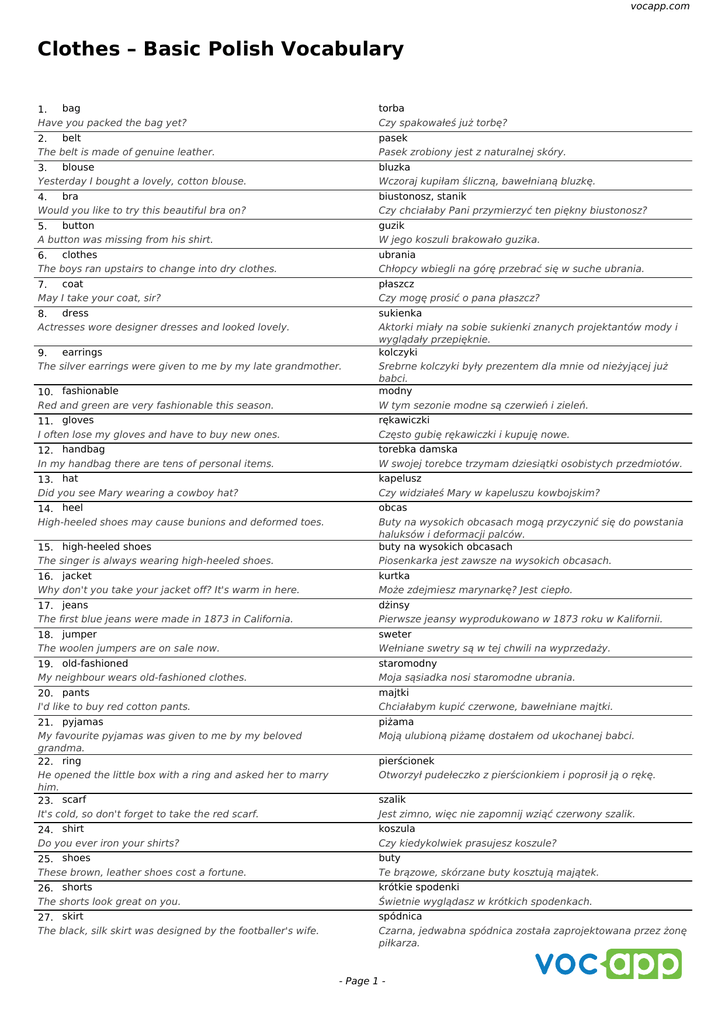 vocapp.com Clothes – Basic Polish Vocabulary bag 1. Have you packed the bag yet? torba Czy spakowałeś już torbę? belt 2. The belt is made of genuine leather. pasek Pasek zrobiony jest z naturalnej skóry. blouse 3. Yesterday I bought a lovely, cotton blouse. bluzka Wczoraj kupiłam śliczną, bawełnianą bluzkę. bra 4. Would you like to try this beautiful bra on? biustonosz, stanik Czy chciałaby Pani przymierzyć ten piękny biustonosz? button 5. A button was missing from his shirt. guzik W jego koszuli brakowało guzika. clothes 6. The boys ran upstairs to change into dry clothes. ubrania Chłopcy wbiegli na górę przebrać się w suche ubrania. coat 7. May I take your coat, sir? płaszcz Czy mogę prosić o pana płaszcz? dress 8. Actresses wore designer dresses and looked lovely. 10. fashionable Red and green are very fashionable this season. sukienka Aktorki miały na sobie sukienki znanych projektantów mody i wyglądały przepięknie. kolczyki Srebrne kolczyki były prezentem dla mnie od nieżyjącej już babci. modny W tym sezonie modne są czerwień i zieleń. 11. gloves I often lose my gloves and have to buy new ones. rękawiczki Często gubię rękawiczki i kupuję nowe. 12. handbag In my handbag there are tens of personal items. torebka damska W swojej torebce trzymam dziesiątki osobistych przedmiotów. 13. hat Did you see Mary wearing a cowboy hat? kapelusz Czy widziałeś Mary w kapeluszu kowbojskim? 14. heel High-heeled shoes may cause bunions and deformed toes. 15. high-heeled shoes The singer is always wearing high-heeled shoes. obcas Buty na wysokich obcasach mogą przyczynić się do powstania haluksów i deformacji palców. buty na wysokich obcasach Piosenkarka jest zawsze na wysokich obcasach. 16. jacket Why don't you take your jacket off? It's warm in here. kurtka Może zdejmiesz marynarkę? Jest ciepło. 17. jeans The first blue jeans were made in 1873 in California. dżinsy Pierwsze jeansy wyprodukowano w 1873 roku w Kalifornii. 18. jumper The woolen jumpers are on sale now. sweter Wełniane swetry są w tej chwili na wyprzedaży. 19. old-fashioned My neighbour wears old-fashioned clothes. staromodny Moja sąsiadka nosi staromodne ubrania. 20. pants I'd like to buy red cotton pants. majtki Chciałabym kupić czerwone, bawełniane majtki. 21. pyjamas My favourite pyjamas was given to me by my beloved grandma. 22. ring He opened the little box with a ring and asked her to marry him. 23. scarf It's cold, so don't forget to take the red scarf. piżama Moją ulubioną piżamę dostałem od ukochanej babci. 24. shirt Do you ever iron your shirts? koszula Czy kiedykolwiek prasujesz koszule? 25. shoes These brown, leather shoes cost a fortune. buty Te brązowe, skórzane buty kosztują majątek. 26. shorts The shorts look great on you. krótkie spodenki Świetnie wyglądasz w krótkich spodenkach. 27. skirt The black, silk skirt was designed by the footballer's wife. spódnica Czarna, jedwabna spódnica została zaprojektowana przez żonę piłkarza. earrings 9. The silver earrings were given to me by my late grandmother. pierścionek Otworzył pudełeczko z pierścionkiem i poprosił ją o rękę. szalik Jest zimno, więc nie zapomnij wziąć czerwony szalik. - Page 1 - vocapp.com 28. slippers My children never wear slippers at home. kapcie Moje dzieci nigdy nie noszą kapci w domu. 29. socks My daughter loses her socks all the time. skarpety Moja córka ciągle gubi skarpetki. 30. suitcase I always travel with one suitcase only. walizka Zawsze podróżuję z jedną walizką. 31. swimsuit The girl in the blue swimsuit won the beauty contest. 32. T-shirt How many T-shirts have you got? kostium kąpielowy Dziewczyna w niebieskim kostiumie kąpielowym wygrała konkurs piękności. koszulka z krótkim rękawem Ile masz koszulek z krótkim rękawem? 33. tie The blue tie doesn't go with the brown shirt. krawat Niebieski krawat nie pasuje do brązowej koszuli. 34. tights I couldn't find the tights in my size. rajstopy Nie mogłam znależć rajstop w moim rozmiarze. 35. to dress It takes my son a minute to dress in the morning. ubrać się Mojemu synowi zajmuje minutę ubranie się rano. 36. to undress The doctor asked the patient to undress. rozebrać się Lekarz poprosił pacjentkę, żeby się rozebrała. 37. to wear I usually wear short skirts. nosić Zazwyczaj noszę krótkie spódnice. 38. trainers Most students wear trainers at school. tenisówki, buty sportowe Większość uczniów nosi w szkole tenisówki. 39. trousers The trousers are too long and too tight. spodnie Spodnie są za długie i za ciasne. 40. umbrella It's going to rain, so take an umbrella. parasol Będzie padać. Weź parasol. 41. underwear You cannot try on the underwear in this shop. bielizna W tym sklepie nie można przymierzać bielizny. 42. vest That vest looks great on you! podkoszulek, kamizelka Ta kamizelka wygląda świetnie na tobie! 43. wedding dress Kate's wedding dress was designed by a well-known designer. suknia ślubna Suknię ślubną Kate zaprojektował znany projektant mody. 44. zip, zipper Girls are learning how to make zipper bags. zamek błyskawiczny, suwak Dziewczynki uczą się robić torby na suwak. 45. clothes I usually buy new clothes at the beginning of a new season. ubrania Zazwyczaj kupuję nowe ubrania na początku każdego sezonu. - Page 2 - Powered by TCPDF (www.tcpdf.org)