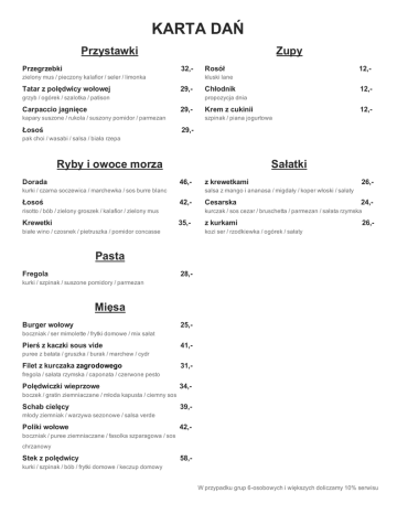 KARTA DAŃ Przystawki Zupy Przegrzebki 32, Rosół 12, zielony mus / pieczony kalafior / seler / limonka kluski lane Tatar z polędwicy wołowej 29, Chłodnik 12, grzyb / ogórek / szalotka / patison propozycja dnia Carpaccio jagnięce 29, Krem z cukinii 12, kapary suszone / rukola / suszony pomidor / parmezan szpinak / piana jogurtowa Łosoś 29, pak choi / wasabi / salsa / biała rzepa Ryby i owoce morza Sałatki Dorada 46, z krewetkami 26, kurki / czarna soczewica / marchewka / sos burre blanc salsa z mango i ananasa / migdały / koper włoski / sałaty Łosoś 42, risotto / bób / zielony groszek / kalafior / zielony mus Cesarska 24, Krewetki 35, z kurkami 26, białe wino / czosnek / pietruszka / pomidor concasse kozi ser / rzodkiewka / ogórek / sałaty kurczak / sos cezar / bruschetta / parmezan / sałata rzymska Pasta Fregola 28, kurki / szpinak / suszone pomidory / parmezan Mięsa Burger wołowy 25, boczniak / ser mimolette / frytki domowe / mix sałat Pierś z kaczki sous vide 41, puree z batata / gruszka / burak / marchew / cydr Filet z kurczaka zagrodowego 31, fregola / sałata rzymska / caponata / czerwone pesto Polędwiczki wieprzowe 34, boczek / gratin ziemniaczane / młoda kapusta / ciemny sos Schab cielęcy 39, młody ziemniak / warzywa sezonowe / salsa verde Poliki wołowe 42, boczniak / puree ziemniaczane / fasolka szparagowa / sos chrzanowy Stek z polędwicy 58, kurki / szpinak / bób / frytki domowe / keczup domowy W przypadku grup 6osobowych i większych doliczamy 10% serwisu Desery Kawa i herbata Panna cotta 13, espresso 6, marakuja / kokos / lody czekoladowe podwójne espresso 8, Torcik bezowy 15, cappuccino 8, owoce / mus orzechowy / sorbet truskawkowy americano 8, Mille feuille 15, latte 10, ciasto francuskie / krem z białej czekolady / owoce kawa mrożona 12, Deser lodowy 15, herbata w imbryczku 7, owoce / bita śmietana herbata mrożona 12, Koktajle 10, / 14, Lemoniady 12, 200 ml / 375 ml 250 ml arbuz / mięta 1 arbuz / limonka 2 arbuz / truskawka 3 melon / mango 4 melon / mango / jagoda 5 melon / banan / limonka 6 truskawka / mleko kokosowe / banan 7 truskawka / pomarańcza / banan 8 ananas / pomarańcza / banan 9 ananas / grejpfrut / imbir 10 ananas / malina 11 pomarańcza / wiśnie / limonka 12 pomarańcza / liczi / mango / malina 13 pomarańcza / trawa cytrynowa / chili / limonka 14 jabłko / arbuz 15 jabłko / melon / spirulina / mięta 16 jabłko / goji / jagody / maliny / jeżyny 17 limoniada tajska limoniada cytrynada Świeże soki 12, 250 ml sok pomarańczowy sok grejpfrutowy sok pomarańcz / grejpfrut sok pomarańcz / mięta sok jabłko / mięta sok jabłkowy Napoje zimne Piwa pepsi, pepsi light, 7up, mirinda 6, orkiszowe z miodem 10, 200 ml Jasne 5,1% 500ml sok yoga 7, pomarańczowy, gruszkowy, ananasowy, 200 ml warmińskie rewolucje 11, Lager jasny 5,2% 500ml brzoskwiniowy, pomidorowy wiśnia w piwie 10, woda surgiva 7, Piwo o smaku wiśniowym 5,2% 500ml gazowana, niegazowana 250 ml kormoran ciemny 10, woda surgiva 14, gazowana, niegazowana 750 ml Ciemne 4,5% 500ml żywiec 8, Jasne 5,5% 500ml
