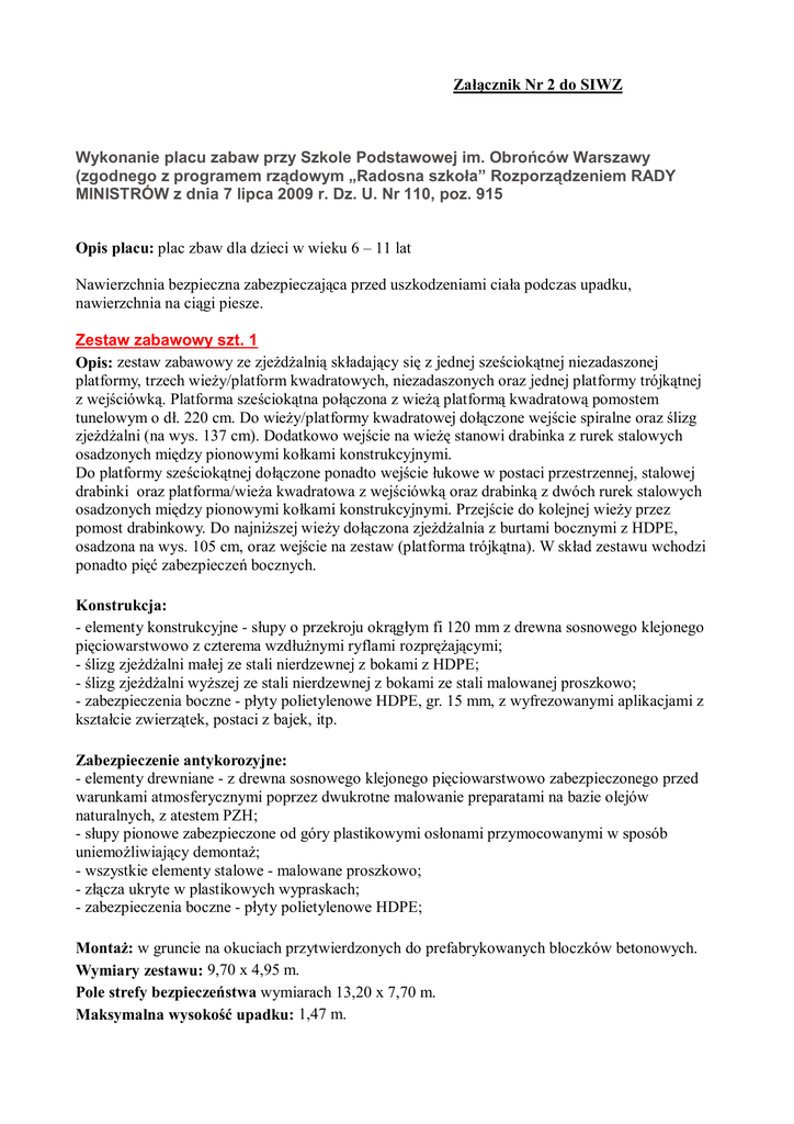 Załącznik Nr 2 do SIWZ Wykonanie placu zabaw przy Szkole Podstawowej im. Obrońców Warszawy (zgodnego z programem rządowym „Radosna szkoła” Rozporządzeniem RADY MINISTRÓW z dnia 7 lipca 2009 r. Dz. U. Nr 110, poz. 915 Opis placu: plac zbaw dla dzieci w wieku 6 – 11 lat Nawierzchnia bezpieczna zabezpieczająca przed uszkodzeniami ciała podczas upadku, nawierzchnia na ciągi piesze. Zestaw zabawowy szt. 1 Opis: zestaw zabawowy ze zjeżdżalnią składający się z jednej sześciokątnej niezadaszonej platformy, trzech wieży/platform kwadratowych, niezadaszonych oraz jednej platformy trójkątnej z wejściówką. Platforma sześciokątna połączona z wieżą platformą kwadratową pomostem tunelowym o dł. 220 cm. Do wieży/platformy kwadratowej dołączone wejście spiralne oraz ślizg zjeżdżalni (na wys. 137 cm). Dodatkowo wejście na wieżę stanowi drabinka z rurek stalowych osadzonych między pionowymi kołkami konstrukcyjnymi. Do platformy sześciokątnej dołączone ponadto wejście łukowe w postaci przestrzennej, stalowej drabinki oraz platforma/wieża kwadratowa z wejściówką oraz drabinką z dwóch rurek stalowych osadzonych między pionowymi kołkami konstrukcyjnymi. Przejście do kolejnej wieży przez pomost drabinkowy. Do najniższej wieży dołączona zjeżdżalnia z burtami bocznymi z HDPE, osadzona na wys. 105 cm, oraz wejście na zestaw (platforma trójkątna). W skład zestawu wchodzi ponadto pięć zabezpieczeń bocznych. Konstrukcja: - elementy konstrukcyjne - słupy o przekroju okrągłym fi 120 mm z drewna sosnowego klejonego pięciowarstwowo z czterema wzdłużnymi ryflami rozprężającymi; - ślizg zjeżdżalni małej ze stali nierdzewnej z bokami z HDPE; - ślizg zjeżdżalni wyższej ze stali nierdzewnej z bokami ze stali malowanej proszkowo; - zabezpieczenia boczne - płyty polietylenowe HDPE, gr. 15 mm, z wyfrezowanymi aplikacjami z kształcie zwierzątek, postaci z bajek, itp. Zabezpieczenie antykorozyjne: - elementy drewniane - z drewna sosnowego klejonego pięciowarstwowo zabezpieczonego przed warunkami atmosferycznymi poprzez dwukrotne malowanie preparatami na bazie olejów naturalnych, z atestem PZH; - słupy pionowe zabezpieczone od góry plastikowymi osłonami przymocowanymi w sposób uniemożliwiający demontaż; - wszystkie elementy stalowe - malowane proszkowo; - złącza ukryte w plastikowych wypraskach; - zabezpieczenia boczne - płyty polietylenowe HDPE; Montaż: w gruncie na okuciach przytwierdzonych do prefabrykowanych bloczków betonowych. Wymiary zestawu: 9,70 x 4,95 m. Pole strefy bezpieczeństwa wymiarach 13,20 x 7,70 m. Maksymalna wysokość upadku: 1,47 m. Pomost z belką z dwoma trapami szt. 1 Opis: urządzenie sprawnościowe o konstrukcji drewnianej do przechodzenia, ćwiczące równowagę. Konstrukcja: - podpory - słupy z drewna sosnowego klejonego pięciowarstwowo ryflowanego wzdłużnie - łańcuchy ocynkowane Zabezpieczenie antykorozyjne: - elementy konstrukcyjne - słupy o przekroju okrągłym fi 120 mm z drewna sosnowego klejonego pięciowarstwowo zabezpieczonego przed warunkami atmosferycznymi poprzez dwukrotne malowanie preparatami na bazie olejów naturalnych, z atestem PZH; - okucia - stal malowana proszkowo; - łańcuchy i elementy złączne ocynkowane osłonięte plastikowymi korkami zaślepkami Montaż: Montaż w gruncie na stalowych okuciach; zabetonowane lub przytwierdzone do prefabrykowanych bloczków betonowych. Wymiary: wys. 124 cm, szer. 100 cm. Huśtawka podwójna z belką metalową Szt. 1 Opis: huśtawka wahadłowa dwuosobowa z belką metalową z dwoma siedziskami gumowymi bez oparcia; Konstrukcja: - podpory - słupy z drewna sosnowego klejonego pięciowarstwowo ryflowanego wzdłużnie; - belka górna - stal malowana proszkowo; - zawiesia łożyskowane - łańcuchy ocynkowane; - siedziska gumowe bez oparcia - szt. 2; Zabezpieczenie antykorozyjne: -drewno konstrukcyjne zabezpieczonego przed działaniem warunków atmosferycznych przez dwukrotne malowanie preparatami na bazie olejów naturalnych, z atestem PZH; - elementy stalowe - malowane proszkowo; - okucia - stal malowana proszkowo; Montaż: Montaż w gruncie na stalowych okuciach; zabetonowane lub przytwierdzone do prefabrykowanych bloczków betonowych. Wymiary: wys. 228 cm, szer. 350 cm. Pole strefy bezpieczeństwa o wymiarach: 760 x 450 cm Równoważnia na sprężynach Szt. 1 Urządzenie sprawnościowe, w postaci grubej drewnianej belki osadzonej na dwóch solidnych sprężynach zakotwionych w betonowych fundamentach ok. 60 cm w gruncie. W celu uzyskania najwyższych parametrów wytrzymałościowych, belka o długości 300 cm wykonana z drewna sosnowego, klejonego z 6 warstw, o wymiarach 14 x 14 cm . Belka zabezpieczona przed szkodliwym wpływem warunków atmosferycznych przez impregnację środkami na bazie naturalnych olejów i wosków posiadających wymagane atesty higieniczne. Sprężyny wykonane z pręta fi 18 mm ze stali jakościowej, zabezpieczone farbami proszkowymi poliestrowymi odpornymi na ciągłe działanie warunków atmosferycznych. Stożek linarium szt. 1 Opis: Urządzenie sprawnościowe, trwale posadowione Konstrukcja: - 1 stalowy maszt , stal nierdzewna malowana proszkowo; wys: 3,00 m. - zestaw lin z rdzeniem stalowym w oprzędzie polipropylowym Zabezpieczenie antykorozyjne: stal nierdzewna malowana proszkowo Montaż: w gruncie Wymiary: szer. 180 cm, wys. 300 cm Pole strefy bezpieczeństwa o średnicy 580 cm. Huśtawka ważka na sprężynie szt. 1 Opis: Huśtawka dwuosobowa typu ważka na sprężynie Konstrukcja: - belka konstrukcyjna – drewno sosnowe klejone pięciowarstwowo o przekroju kwadratowym - sprężyna fi 180 mm malowana proszkowo - prefabrykowany bloczek fundamentowy - rączki I podpory nóg – plastikowe - elementy kolorowe – formatki z płyt polietylenowych HDPE Zabezpieczenie antykorozyjne: wszystkie elementy stalowe cynkowane ogniowo I malowane proszkowo, elementy drewniane dwukrotnie malowane preparatami n