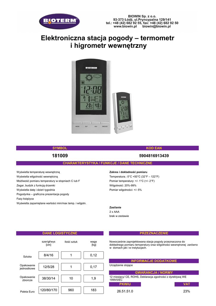 Elektroniczna stacja pogody – termometr i higrometr wewnętrzny SYMBOL KOD EAN 181009 5904816913439 CHARAKTERYSTYKA / FUNKCJE / DANE TECHNICZNE Wyświetla temperaturę wewnętrzną Zakres i dokładność pomiaru Wyświetla wilgotność wewnętrzną Temperatura.: 0°C +50°C (32°F – 122°F) Możliwość pomiaru temperatury w stopniach C lub F Pomiar temperatury: +/- 1°C (+/- 2°F) Zegar, budzik z funkcją drzemki Wilgotność: 20%-99% Wyświetla datę i dzień tygodnia Pomiar wilgotności: +/- 5% Pogodynka – graficzna prezentacja pogody Fazy księżyca Wyświetla zapamiętane wartości min/max temp. i wilgotn. Zasilanie 2 x AAA brak w zestawie DANE LOGISTYCZNE Sztuka PRZEZNACZENIE szer/gł/wys [cm] Ilość sztuk waga [kg] 8/4/16 1 0,12 Nowocześnie zaprojektowana stacja pogody przeznaczona do dokładnego pomiaru temperatury oraz wilgotności wewnętrznej zarówno w domach jak i w instytucjach. INFORMACJE DODATKOWE Opakowanie jednostkowe 12/5/28 1 0,17 Urządzenie stojące GWARANCJA / NORMY Opakowanie zbiorcze Paleta Euro 38/30/14 120/80/170 10 960 1,9 183 12 miesięcy/ CE, ROHS, Deklaracja zgodności z dyrektywą WE 1999/5/EC PKWiU VAT 26.51.51.0 23%