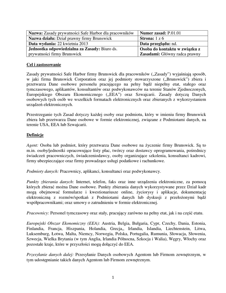 Nazwa: Zasady prywatności Safe Harbor dla pracowników Nazwa działu: Dział prawny firmy Brunswick Data wydania: 22 kwietnia 2013 Jednostka odpowiedzialna za Zasady: Biuro ds. prywatności firmy Brunswick Numer zasad: P.01.01 Strona: 1 z 6 Data przeglądu: nd. Osoba do kontaktu w związku z Zasadami: Główny radca prawny Cel i zastosowanie Zasady prywatności Safe Harbor firmy Brunswick dla pracowników („Zasady”) wyjaśniają sposób, w jaki firma Brunswick Corporation oraz jej podmioty stowarzyszone („Brunswick”) zbiera i przetwarza Dane osobowe personelu pracującego na pełny bądź niepełny etat, stałego oraz tymczasowego, aplikantów, konsultantów oraz podwykonawców na terenie Stanów Zjednoczonych, Europejskiego Obszaru Ekonomicznego („EEA”) oraz Szwajcarii. Zasady dotyczą Danych osobowych tych osób we wszelkich formatach elektronicznych oraz zbieranych z wykorzystaniem urządzeń elektronicznych. Przestrzeganie tych Zasad dotyczy każdej osoby oraz podmiotu, który w imieniu firmy Brunswick zbiera lub przetwarza Dane osobowe w formie elektronicznej, związane z Podmiotami danych, na terenie USA, EEA lub Szwajcarii. Definicje Agent: Osoba lub podmiot, który przetwarza Dane osobowe na życzenie firmy Brunswick. Są to m.in. osoby/jednostki opracowujące listy płac, twórcy oraz dostawcy oprogramowania, pośrednicy świadczeń pracowniczych, świadczeniodawcy, osoby organizujące szkolenia, konsultanci kadrowi, firmy ubezpieczające oraz firmy prowadzące usługi podatkowe i rachunkowe. Podmioty danych: Pracownicy, aplikanci, konsultanci oraz podwykonawcy. Punkty zbierania danych: Internet, telefon, faks oraz inne urządzenia elektroniczne, za pomocą których zbierać można Dane osobowe. Punkty zbierania danych wykorzystywane przez Dział kadr mogą obejmować formularze i kwestionariusze online, życiorysy i aplikacje, dokumentację elektroniczną z rozmów/spotkań z Podmiotami danych lub dyskusji z przełożonymi bądź współpracownikami; oraz umowy o zatrudnieniu w formie elektronicznej. Pracownicy: Personel tymczasowy oraz stały, pracujący zarówno na pełny etat, jak i na część etatu. Europejski Obszar Ekonomiczny (EEA): Austria, Belgia, Bułgaria, Cypr, Czechy, Dania, Estonia, Finlandia, Francja, Hiszpania, Holandia, Grecja,, Irlandia, Islandia, Liechtenstein, Litwa, Luksemburg, Łotwa, Malta, Niemcy, Norwegia, Polska, Portugalia, Rumunia, Słowacja, Słowenia, Szwecja, Wielka Brytania (w tym Anglia, Irlandia Północna, Szkocja i Walia), Węgry, Włochy oraz pozostałe kraje, które w przyszłości mogą dołączyć do EEA. Przesyłanie danych dalej: Przesyłanie Danych osobowych Agentom lub Firmom zewnętrznym, w tym udostępnianie takich danych Agentom lub Firmom zewnętrznym. 1 Dane osobowe: Dane elektroniczne zidentyfikowanej lub możliwej do zidentyfikowania osoby otrzymywane, pozyskiwane oraz przechowywane przez firmę Brunswick. Dane osobowe to między innymi: imię i nazwisko, data urodzenia, numer paszportu, informacje kontaktowe prywatne oraz firmowe, stan cywilny, informacje dot. członków rodziny, informacje dotyczące osoby kontaktowej w razie wypadku, kwalifikacje i historia zatrudnienia, warunki zatrudnienia, stan zatrudnienia, godziny pracy, kategoria zatrudnienia, wynagrodzenie, programy świadczeń pracowniczych, dokumentacja obecności, przeglądy wyników, struktura raportowania, informacje z weryfikacji danych (jeśli dozwolona przez przepisy prawa), informacje związane z zeznaniami podatkowymi, informacje dotyczące zażaleń oraz działań dyscyplinarnych, zdjęcia oraz informacje związane ze sprzętem wydawanym przez firmę Brunswick, w tym z telefonami, pojazdami, kartami kredytowymi, oraz inne podobne informacje. Przetwarzanie danych: Wszelkie operacje lub zestawy operacji — automatycznych i ręcznych — przeprowadzanych na Danych osobowych. Obejmuje to między innymi: zbieranie, przechowywanie, rejestrowanie, organizowanie, składowanie, adaptowanie i zmienianie, odzyskiwanie, konsultowanie, wykorzystywanie, ujawnianie, rozpowszechnianie lub udostępnianie na inne sposoby, blokowanie, usuwanie i niszczenie Danych osobowych. Przetwarzanie obejmuje również takie działania jak kopiowanie, przesyłanie i zapisywanie Danych osobowych w bazie danych. Safe Harbor: Stany Zjednoczone Departament Handlu Stanów Zjednoczonych („DoC”) i Komisja Europejska oraz DoC i Federalny Komisarz ds. Ochrony Danych i Informacji w Szwajcarii osiągnęli oddzielne porozumienia dotyczące najważniejszych zasad ochrony danych (zbiorczo nazywane „Zasadami Safe Harbor”), aby umożliwić firmom działającym na terenie USA przesyłanie Danych osobowych z EEA oraz ze Szwajcarii do USA w sposób zgodny z prawem europejskim i szwajcarskim. Uczestnictwo w programach Safe Harbor pozwala firmie Brunswick legalnie przesyłać dane osobowe w uzasadnionych celach z Europejskiego Obszaru Gospodarczego oraz ze Szwajcarii do Stanów Zjednoczonych. Dane osobowe szczególnie chronione: Dane osobowe w formie elektronicznej, które wiążą się ze stanem zdrowotnym Podmiotów danych, rasą, narodowością, poglądami politycznymi oraz przynależnością do organizacji politycznych, poglądami filozoficznymi i religijnymi, członkostwem w związkach zawodowych oraz seksualnością. Firma zewnętrzna: Osoba lub podmiot nie będący Agentem, nie związany z firmą Brunswick oraz nie działający w imieniu firmy Brunswick ani na jej życzenie. Safe Harbor Działając w zgodzie ze swoim zobowiązaniem dotyczącym ochrony prywatności, firma Brunswick zachowuje zgodność z zasadami Safe Harbor obowiązującymi pomiędzy USA a UE oraz USA a Szwajcarią oraz przestrzega obu zbiorów zasad Safe Harbor. Więcej informacji na temat zasad Safe Harbor znaleźć można na stronie internetowej Departamentu Handlu Stanów Zjednoczonych pod adresem http://export.gov/safeharbor/. Wskazówki dotyczące zasad 2 A. Bezpieczeństwo firmy. Zgodnie z niniejszymi Zasa