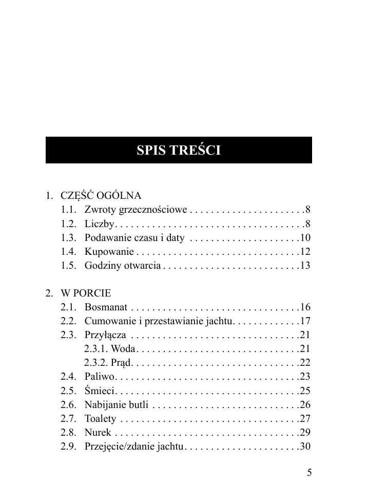 spis treści 1. CZĘŚĆ OGÓLNA 1.1. Zwroty grzecznościowe. . . . . . . . . . . . . . . . . . . . . . 8 1.2. Liczby. . . . . . . . . . . . . . . . . . . . . . . . . . . . . . . . . . . . 8 1.3. Podawanie czasu i daty . . . . . . . . . . . . . . . . . . . . . 10 1.4. Kupowanie. . . . . . . . . . . . . . . . . . . . . . . . . . . . . . . 12 1.5. Godziny otwarcia. . . . . . . . . . . . . . . . . . . . . . . . . . 13 2. W PORCIE 2.1. Bosmanat. . . . . . . . . . . . . . . . . . . . . . . . . . . . . . . . 2.2. Cumowanie i przestawianie jachtu. . . . . . . . . . . . . 2.3. Przyłącza . . . . . . . . . . . . . . . . . . . . . . . . . . . . . . . . 2.3.1. Woda. . . . . . . . . . . . . . . . . . . . . . . . . . . . . . . 2.3.2. Prąd. . . . . . . . . . . . . . . . . . . . . . . . . . . . . . . . 2.4. Paliwo. . . . . . . . . . . . . . . . . . . . . . . . . . . . . . . . . . . 2.5. Śmieci. . . . . . . . . . . . . . . . . . . . . . . . . . . . . . . . . . . 2.6. Nabijanie butli . . . . . . . . . . . . . . . . . . . . . . . . . . . . 2.7. Toalety . . . . . . . . . . . . . . . . . . . . . . . . . . . . . . . . . . 2.8. Nurek. . . . . . . . . . . . . . . . . . . . . . . . . . . . . . . . . . . 2.9. Przejęcie/zdanie jachtu. . . . . . . . . . . . . . . . . . . . . . 16 17 21 21 22 23 25 26 27 29 30 5 2.10. Wyjęcie jachtu z wody. . . . . . . . . . . . . . . . . . . . . . 2.11. Naprawy żaglomistrzowskie . . . . . . . . . . . . . . . . . 2.12. Naprawy mechaniczne. . . . . . . . . . . . . . . . . . . . . . 2.13. Naprawy takielarskie. . . . . . . . . . . . . . . . . . . . . . . 2.14. Naprawy szkutnicze. . . . . . . . . . . . . . . . . . . . . . . . 2.15. Pożyczanie. . . . . . . . . . . . . . . . . . . . . . . . . . . . . . . 2.16. Przyjmowanie gości na jachcie . . . . . . . . . . . . . . . 2.17. Prognoza pogody. . . . . . . . . . . . . . . . . . . . . . . . . . 2.18. Uzgodnienie otwarcia mostu/śluzy . . . . . . . . . . . . 32 34 36 40 42 45 46 47 48 3. W MIEŚCIE 3.1. Kantor. . . . . . . . . . . . . . . . . . . . . . . . . . . . . . . . . . . 3.2. Pytanie o drogę. . . . . . . . . . . . . . . . . . . . . . . . . . . . 3.3. Bank. . . . . . . . . . . . . . . . . . . . . . . . . . . . . . . . . . . . 3.4. Poczta. . . . . . . . . . . . . . . . . . . . . . . . . . . . . . . . . . . 3.5. Wypożyczenie samochodu. . . . . . . . . . . . . . . . . . . 3.6. Wynajęcie roweru. . . . . . . . . . . . . . . . . . . . . . . . . . 3.7. Taxi. . . . . . . . . . . . . . . . . . . . . . . . . . . . . . . . . . . . . 3.8. Komunikacja miejska. . . . . . . . . . . . . . . . . . . . . . . 3.9. Apteka. . . . . . . . . . . . . . . . . . . . . . . . . . . . . . . . . . . 3.10. Lekarz. . . . . . . . . . . . . . . . . . . . . . . . . . . . . . . . . . . 3.11. Restauracja. . . . . . . . . . . . . . . . . . . . . . . . . . . . . . . 3.12. Zakupy spożywcze. . . . . . . . . . . . . . . . . . . . . . . . . 3.13. Sklep odzieżowy . . . . . . . . . . . . . . . . . . . . . . . . . . 3.14. Informacja turystyczna/zwiedzanie. . . . . . . . . . . . 3.15. Policja. . . . . . . . . . . . . . . . . . . . . . . . . . . . . . . . . . . 3.16. Hotel. . . . . . . . . . . . . . . . . . . . . . . . . . . . . . . . . . . . 3.17. Internet. . . . . . . . . . . . . . . . . . . . . . . . . . . . . . . . . . 50 51 52 53 54 56 56 57 59 61 64 66 71 72 74 75 75