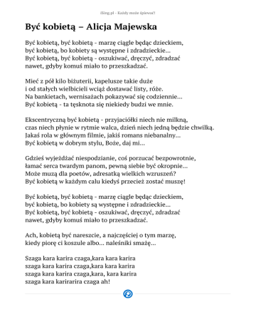 iSing.pl - Każdy może śpiewać! Być kobietą – Alicja Majewska Być kobietą, być kobietą - marzę ciągle będąc dzieckiem, być kobietą, bo kobiety są występne i zdradzieckie... Być kobietą, być kobietą - oszukiwać, dręczyć, zdradzać nawet, gdyby komuś miało to przeszkadzać. Mieć z pół kilo biżuterii, kapelusze takie duże i od stałych wielbicieli wciąż dostawać listy, róże. Na bankietach, wernisażach pokazywać się codziennie... Być kobietą - ta tęsknota się niekiedy budzi we mnie. Ekscentryczną być kobietą - przyjaciółki niech nie milkną, czas niech płynie w rytmie walca, dzień niech jedną będzie chwilką. Jakaś rola w głównym filmie, jakiś romans niebanalny... Być kobietą w dobrym stylu, Boże, daj mi... Gdzieś wyjeżdżać niespodzianie, coś porzucać bezpowrotnie, łamać serca twardym panom, pewną siebie być okropnie... Może muzą dla poetów, adresatką wielkich wzruszeń? Być kobietą w każdym calu kiedyś przecież zostać muszę! Być kobietą, być kobietą - marzę ciągle będąc dzieckiem, być kobietą, bo kobiety są występne i zdradzieckie... Być kobietą, być kobietą - oszukiwać, dręczyć, zdradzać nawet, gdyby komuś miało to przeszkadzać. Ach, kobietą być nareszcie, a najczęściej o tym marzę, kiedy piorę ci koszule albo... naleśniki smażę... Szaga kara karira czaga,kara kara karira szaga kara karira czaga,kara kara karira szaga kara karira czaga,kara, kara karira szaga kara karirarira czaga ah! Słowa: W. Młynarski Muzyka: Włodzimierz Korcz Rok wydania: brak danych Płyta: brak danych