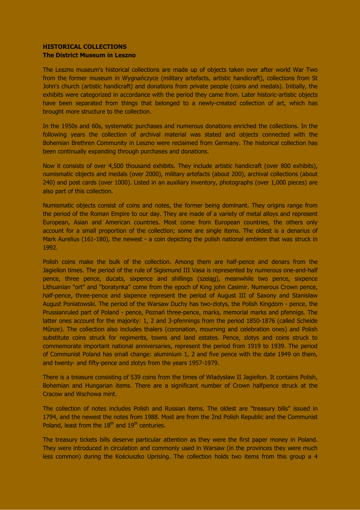 HISTORICAL COLLECTIONS The District Museum in Leszno The Leszno museum's historical collections are made up of objects taken over after world War Two from the former museum in Wygnańczyce (military artefacts, artistic handicraft), collections from St John's church (artistic handicraft) and donations from private people (coins and medals). Initially, the exhibits were categorized in accordance with the period they came from. Later historic-artistic objects have been separated from things that belonged to a newly-created collection of art, which has brought more structure to the collection. In the 1950s and 60s, systematic purchases and numerous donations enriched the collections. In the following years the collection of archival material was stated and objects connected with the Bohemian Brethren Community in Leszno were reclaimed from Germany. The historical collection has been continually expanding through purchases and donations. Now it consists of over 4,500 thousand exhibits. They include artistic handicraft (over 800 exhibits), numismatic objects and medals (over 2000), military artefacts (about 200), archival collections (about 240) and post cards (over 1000). Listed in an auxiliary inventory, photographs (over 1,000 pieces) are also part of this collection. Numismatic objects consist of coins and notes, the former being dominant. They origins range from the period of the Roman Empire to our day. They are made of a variety of metal alloys and represent European, Asian and American countries. Most come from European countries, the others only account for a small proportion of the collection; some are single items. The oldest is a denarius of Mark Aurelius (161-180), the newest - a coin depicting the polish national emblem that was struck in 1992. Polish coins make the bulk of the collection. Among them are half-pence and denars from the Jagiellon times. The period of the rule of Sigismund III Vasa is represented by numerous one-and-half pence, three pence, ducats, sixpence and shillings (szeląg), meanwhile two pence, sixpence Lithuanian "ort" and "boratynka" come from the epoch of King john Casimir. Numerous Crown pence, half-pence, three-pence and sixpence represent the period of August III of Saxony and Stanisław August Poniatowski. The period of the Warsaw Duchy has two-zlotys, the Polish Kingdom - pence, the Prussianruled part of Poland - pence, Poznań three-pence, marks, memorial marks and pfennigs. The latter ones account for the majority: 1, 2 and 3-pfennings from the period 1850-1876 (called Scheide Mûnze). The collection also includes thalers (coronation, mourning and celebration ones) and Polish substitute coins struck for regiments, towns and land estates. Pence, zlotys and coins struck to commemorate important national anniversaries, represent the period from 1919 to 1939. The period of Communist Poland has small change: aluminium 1, 2 and five pence with the date 1949 on them, and twenty- and fifty-pence and zlotys from the years 1957-1979. There is a treasure consisting of 539 coins from the times of Władysław II Jagiellon. It contains Polish, Bohemian and Hungarian items. There are a significant number of Crown halfpence struck at the Cracow and Wschowa mint. The collection of notes includes Polish and Russian items. The oldest are "treasury bills" issued in 1794, and the newest the notes from 1988. Most are from the 2nd Polish Republic and the Communist Poland, least from the 18th and 19th centuries. The treasury tickets bills deserve particular attention as they were the first paper money in Poland. They were introduced in circulation and commonly used in Warsaw (in the provinces they were much less common) during the Kościuszko Uprising. The collection holds two items from this group a 4 zlotys and 25 zlotys note. These notes were printed in Warsaw's printing houses of Dufour and Gröll, in accordance with the resolutions of the Supreme National Council of 8 June, 13 August and 4 September 1794. The collection's medals, medallions and plaques were largely made by using striking or casting. They come from polish medallist workshops and the State Mint, and a small number were designed in Germany, France and Italy. The oldest one was made in the 16th century and the newest in the early 21st century. A few are the 18th and 19th centuries. Polish medal designers include names, such as: J. Aumiller, J. Stasiński, G. Kowalski, B. Lewiński, J. Murlewski, E. Olszewska-Borys, J. Małeta, E. Nosek, S. Repeta and Z. Łukowiak. Foreign medallists worth mentioning are the following: P. Merker, David d'Angers, C. Voigt, J. G. Junke, M. Hahn, F. Pohlmann, K. Vasut and A. Konecny. Medals account for the largest group of the collection in question. They include commemorative regional items and there is also a medal issued on the occasion of the coronation of Stanisław Leszczyński for the king of Poland. Commemorative regional medals were designed in the workshop of Z. Łukowiak, an artist from Rawicz. They predominantly reflect facts connected with the town of Leszno. They also depict people who have made outstanding contributions to Leszno and south-western Wielkopolska. A medallion depicting Adam Mickiewicz is a very interesting item. !t is the first original cast which is attested by a hallmark of a Parisian casting workshop on the reverse. Among the medal s are military honours awarded for the participation in the Second World Was and regiment emblems of the 55th infantry regiment and 17th lancer regiment. The two regiments were stationed in Leszno during the inter-war period. Other honours form a small part of the collection, such as for example Rifle Fraternity honours. They are a valuable material that documents the activities of rifle fraternities in Leszno and surrounding towns. The historic collection's military artefacts include blank weapons, firearms and military uniforms. Blank weapons are divided into edged and staff weapons. They are represented by a Poli
