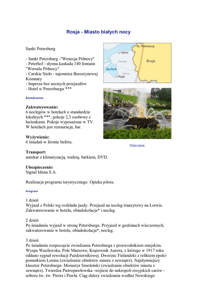Rosja - Miasto białych nocy Sankt Petersburg - Sankt Petersburg -"Wenecja Północy" - Peterhof - słynna kaskada 140 fontann "Wersalu Północy" - Carskie Sioło - tajemnica Bursztynowej Komnaty - Impreza bez nocnych przejazdów - Hotel w Petersburgu *** Świadczenia Zakwaterowanie: 6 noclegów w hotelach o standardzie lokalnych ***, pokoje 2,3 osobowe z łazienkami. Pokoje wyposażone w TV. W hotelach jest restauracja, bar. Wyżywienie: 6 śniadań w formie bufetu. Pokaż więcej Transport: autokar z klimatyzacją, toaletą, barkiem, DVD. Ubezpieczenie: Signal Iduna S.A. Realizacja programu turystycznego. Opieka pilota. Program 1 dzień Wyjazd z Polski wg rozkładu jazdy. Przejazd na nocleg tranzytowy na Łotwie. Zakwaterowanie w hotelu, obiadokolacja* i nocleg. 2 dzień Po śniadaniu wyjazd w stronę Petersburga. Przyjazd w godzinach wieczornych, zakwaterowanie w hotelu, obiadokolacja*, nocleg. 3 dzień Po śniadaniu rozpoczęcie zwiedzania Petersburga z przewodnikiem miejskim. Wyspa Wasilewska, Pole Marsowe, Krążownik Aurora, z którego w 1917 roku oddano sygnał rewolucji Październikowej. Dworzec Finlandzki z reliktem epokipomnikiem Lenina (zwiedzanie obiektów miasta z zewnątrz). Najsłynniejszy klasztor Petersburga- Monastyr Smoleński (zwiedzanie obiektów miasta z zewnątrz). Twierdza Pietropawłowska -wejście do nekropoli rosyjskich carów soboru św. św. Piotra i Pawła. Ciąg dalszy zwiedzania wzdłuż Newskiego Prospektu. Obiadokolacja*. Powrót do hotelu na nocleg. 4 dzień Po śniadaniu wyjazd do Peterhofu - letniej rezydencji Piotra I Wielkiego nazywanej "Wersalem Północy". Zwiedzanie Parku Dolnego, którego największą atrakcję stanowi kompleks 140 fontann. Kulminacją tego ogromnego pomnika/fontanny jest granitowy piedestał z odlanym w brązie Człowiekiem Słońca - Samsonem walczącym z dziką bestią. Największa fontanna wypuszcza pionowo w górę 20 metrowy słup wody. Obiadokolacja*. Wieczór folklorystyczny z pieśniami i tańcami ludowymi (fakultatywnie). Powrót do hotelu na nocleg. 5 dzień Śniadanie. Wizyta w Ermitażu - jednym z największych muzeów świata. Jego skarby mieszczą się aż w pięciu pałacach, znajdujących się nad brzegiem Newy. Nazwa muzeum pochodzi od skromnego Pałacu Zimowego Piotra I. Spacer do Soboru św. Izaaka (wejście do soboru). Obiadokolacja. Fakultatywnie - nocne zwiedzanie miasta kanałami Petersburga stateczkiem. Nocleg. 6 dzień Po śniadaniu wyjazd do Carskiego Sioła - kompleksu pałacowo-parkowego założonego w XVIII wieku - perły rosyjskiego baroku. Wejście do Pałacu i Bursztynowej Komnaty. Spacer alejkami parku. Wyjazd w stronę noclegu tranzytowego na Łotwie. Obiadokolacja. Nocleg tranzytowy. 7 dzień Po śniadaniu powrót do kraju. * dopłata za pakiet 6 obiadokolacji - 350 zł/osoby. Uwagi Do dokonania rezerwacji w biurze konieczny jest ważny paszport. Cena podstawowa nie zawiera: - kosztów biletów wstępu do zwiedzanych obiektów oraz ich rezerwacji (Petersburg: Ermitaż, Sobór św. św. Piotra i Pawła, Sobór św. Izaaka, Park Dolny Peterhofu, Pałac w Carskim Siole z Bursztynową Komnatą), opłat za miejscowych przewodników, system Alma Tour Guide, opłaty meldunkowej w Petersburgu (ok. 115 EUR - płatne na miejscu zagranicznemu kontrahentowi), - wizy do Rosji (330 PLN) płatne w biurze. Dokumenty niezbędne do otrzymania wizy: paszport ważny co najmniej 6 miesięcy od dnia powrotu z imprezy (posiadający minimum dwie wolne strony), 1 aktualne kolorowe zdjęcie (nie starsze niż 3 miesiące od daty złożenia wniosku, wykonane "na wprost", tło białe, wymiar 3,5 cm x 4,5 cm) oraz wypełniony wniosek wizowy należy dostarczyć do biura sprzedającego minimum 30 dni przed datą rozpoczęcia imprezy (wniosek wizowy do pobrania ze strony https://visa.kdmid.ru; instrukcja wypełniania wniosku w linku poniżej. Przy wypełnianiu wniosków wizowych obowiązuje rejonizacja, w zależności od miejsca stałego zamieszkania: Konsulat w Warszawie obsługuje mieszkańców województwa: mazowieckie, łódzkie, lubelskie, podlaskie; Konsulat w Poznaniu obsługuje mieszkańców województwa: wielkopolskie, dolnośląskie, opolskie, lubuskie; Konsulat w Gdańsku obsługuje mieszkańców województwa: kujawsko-pomorskie, zachodniopomorskie, pomorskie, warmińsko - mazurskie; Konsulat w Krakowie obsługuje mieszkańców województwa: małopolskie, śląskie, świętokrzyskie, podkarpackie), - imprez fakultatywnych: rejs stateczkiem po rzekach i kanałach Petersburga - 15 EUR, spektakl folklorystyczny - 20 EUR, - dopłat za dojazdy z wybranych miejscowości w Polsce, podanych w rozkładzie jazdy. Cena podstawowa dotyczy wyjazdów z Warszawy i Białegostoku. Kolejność zwiedzania może ulec zmianie. Informacje praktyczne Przejazd na trasie Warszawa - nocleg tranzytowy ok. 700 km - ok. 12 godzin. Dłuższe przerwy organizowane są mniej więcej co 4 godziny oraz na przystankach gdzie wsiadają klienci. Białe noce możliwe są do zobaczenia pomiędzy 25.0516.07. Terminy i ceny Hotel *** Nr grupy Data Cena ORAS01 07.06 - 13.06 2265 zł 2065 zł Promocja 7 dni ORAS02 27.07 - 02.08 2115 zł 1915 zł Promocja 7 dni ORAS03 14.09 - 20.09 1950 zł 1750 zł Promocja 7 dni (skrót: HOTEL)