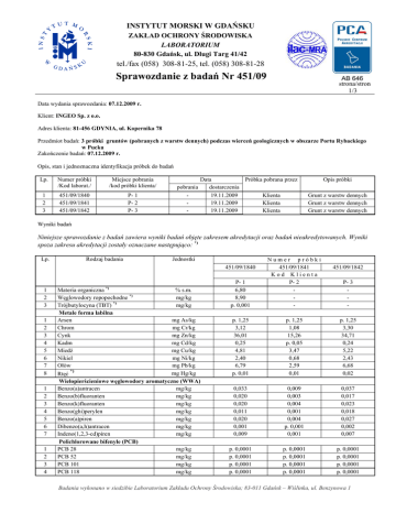 INSTYTUT MORSKI W GDAŃSKU ZAKŁAD OCHRONY ŚRODOWISKA LABORATORIUM 80-830 Gdańsk, ul. Długi Targ 41/42 tel./fax (058) 308-81-25, tel. (058) 308-81-28 Sprawozdanie z badań Nr 451/09 strona/stron 1/3 Data wydania sprawozdania: 07.12.2009 r. Klient: INGEO Sp. z o.o. Adres klienta: 81-456 GDYNIA, ul. Kopernika 78 Przedmiot badań: 3 próbki gruntów (pobranych z warstw dennych) podczas wierceń geologicznych w obszarze Portu Rybackiego w Pucku Zakończenie badań: 07.12.2009 r. Opis, stan i jednoznaczna identyfikacja próbek do badań Lp. 1 2 3 Numer próbki /Kod laborat./ Miejsce pobrania /kod próbki klienta/ pobrania 451/09/1840 451/09/1841 451/09/1842 P- 1 P- 2 P- 3 - Data dostarczenia Próbka pobrana przez Opis próbki Klienta Klienta Klienta Grunt z warstw dennych Grunt z warstw dennych Grunt z warstw dennych 19.11.2009 19.11.2009 19.11.2009 Wyniki badań Niniejsze sprawozdanie z badań zawiera wyniki badań objęte zakresem akredytacji oraz badań nieakredytowanych. Wyniki spoza zakresu akredytacji zostały oznaczane następująco: *) Lp. Rodzaj badania Jednostki P- 1 6,80 8,90 p. 0,001 Numer próbki 451/09/1841 Kod Klienta P- 2 - p. 1,25 3,12 36,01 0,25 4,81 2,40 6,79 p. 0,01 p. 1,25 1,08 15,26 p. 0,05 3,47 0,68 2,59 0,01 p. 1,25 3,30 34,71 0,24 5,22 2,43 6,68 0,02 0,033 0,020 0,020 0,011 0,020 0,001 0,009 0,009 0,003 0,004 0,001 0,004 p. 0,001 0,001 0,037 0,017 0,023 0,018 0,027 0,002 0,007 p. 0,0001 p. 0,0001 p. 0,0001 p. 0,0001 p. 0,0001 p. 0,0001 p. 0,0001 p. 0,0001 p. 0,0001 p. 0,0001 p. 0,0001 p. 0,0001 451/09/1840 1 2 3 1 2 3 4 5 6 7 8 1 2 3 4 5 6 7 1 2 3 4 Materia organiczna *) Węglowodory ropopochodne *) Trójbutylocyna (TBT) *) Metale forma labilna Arsen Chrom Cynk Kadm Miedź Nikiel Ołów % s.m. mg/kg mg/kg mg As/kg mg Cr/kg mg Zn/kg mg Cd/kg mg Cu/kg mg Ni/kg mg Pb/kg *) mg Hg/kg Rtęć Wielopierścieniowe węglowodory aromatyczne (WWA) Benzo(a)antracen mg/kg Benzo(b)fluoranten mg/kg Benzo(k)fluoranten mg/kg Benzo(ghi)perylen mg/kg Benzo(a)piren mg/kg Dibenzo(a,h)antracen mg/kg Indeno(1,2,3-cd)piren mg/kg Polichlorowane bifenyle (PCB) PCB 28 mg/kg PCB 52 mg/kg PCB 101 mg/kg PCB 118 mg/kg 451/09/1842 P- 3 - Badania wykonano w siedzibie Laboratorium Zakładu Ochrony Środowiska; 83-011 Gdańsk – Wiślinka, ul. Benzynowa 1 INSTYTUT MORSKI W GDAŃSKU ZAKŁAD OCHRONY ŚRODOWISKA LABORATORIUM 80-830 Gdańsk, ul. Długi Targ 41/42 tel./fax (058) 308-81-25, tel. (058) 308-81-28 Sprawozdanie z badań Nr 451/09 strona/stron 2/3 Wyniki badań c.d. Lp. Rodzaj badania Jednostki mg/kg mg/kg mg/kg mg/kg P- 1 p. 0,0001 p. 0,0001 p. 0,0001 p. 0,0001 Numer próbki 451/09/1841 Kod Klienta P- 2 p. 0,0001 p. 0,0001 p. 0,0001 p. 0,0001 mg As/kg mg Cr/kg mg Zn/kg mg Cd/kg mg Cu/kg mg Ni/kg mg Pb/kg mg Hg/kg 4,34 11,41 47,43 0,25 11,46 4,95 9,53 0,05 - 451/09/1840 5 6 7 8 1 2 3 4 5 6 7 8 PCB 138 PCB 153 PCB 180 PCB suma Metale zawartość całkowita Arsen Chrom Cynk Kadm Miedź Nikiel Ołów *) 451/09/1842 P- 3 p. 0,0001 p. 0,0001 0,0001 0,0001 - 1 Rtęć Pestycydy chloroorganiczne α−HCH *) mg/kg 0,002 - - 2 β−HCH *) mg/kg 0,001 - - 3 γ−HCH *) mg/kg 0,001 - - 4 5 6 7 8 9 10 11 12 δ−HCH *) Aldryna *) Dieldryna *) Endryna *) Izodryna *) p,p'-DDT *) p,p'-DDD *) p,p'-DDE*) Heksachlorobenzen (HCB) *) mg/kg mg/kg mg/kg mg/kg mg/kg mg/kg mg/kg mg/kg mg/kg 0,001 p. 0,001 0,001 0,002 p. 0,001 p. 0,001 0,001 p. 0,001 0,001 - - 1 2 3 Pestycydy karbaminowe Propoksur Karbaryl Karbofuran mg/kg mg/kg mg/kg p. 0,01 p. 0,01 p. 0,01 - - 1 2 3 4 5 6 Pestycydy fosforoorganiczne Chlorfenwinfos *) Dichlorfos *) Fenitrotion *) Malation *) Paration metylowy *) Paration etylowy *) mg/kg mg/kg mg/kg mg/kg mg/kg mg/kg p. 0,01 p. 0,01 p. 0,01 p. 0,01 p. 0,01 p. 0,01 - - Objaśnienia do tabel: p. - poniżej granicy oznaczalności Wyniki badań podano w przeliczeniu na suchą masę osadu Badania wykonano w siedzibie Laboratorium Zakładu Ochrony Środowiska; 83-011 Gdańsk – Wiślinka, ul. Benzynowa 1 INSTYTUT MORSKI W GDAŃSKU ZAKŁAD OCHRONY ŚRODOWISKA LABORATORIUM 80-830 Gdańsk, ul. Długi Targ 41/42 tel./fax (058) 308-81-25, tel. (058) 308-81-28 Sprawozdanie z badań Nr 451/09 strona/stron 3/3 Identyfikacja zastosowanych metod Lp. Rodzaj badania 1 2 Materia organiczna Węglowodory ropopochodne 3 Trójbutylocyna (TBT) 4 Metale forma labilna: arsen, chrom, cynk, kadm, miedź, nikiel i ołów 5 Rtęć forma labilna 6 Wielopierścieniowe węglowodory aromatyczne (WWA) 7 Polichlorowane bifenyle (PCB) 8 Metale zawartość całkowita: arsen, chrom, cynk, kadm, miedź, nikiel i ołów 9 Rtęć zawartość całkowita 10 Pestycydy chloroorganiczne 11 Pestycydy fosforoorganiczne, i karbaminowe Metoda badań Prażenie w temperaturze 550°C i ważenie wg PN-EN 12879:2004 Ekstrakcja analitów z badanej próbki osadu eterem naftowym, adsorpcja substancji polarnych na Florisilu wg PN-EN 14345:2008. Oznaczenie końcowe zawartości węglowodorów w zakresie od C10 do C40 za pomocą chromatografii gazowej GC/FID (chromatografia gazowa z detektorem płomieniowo – jonizacyjnym FID) wg PN-EN 14039:2008 Ekstrakcja próbek suchych osadów metanolem z dodatkiem tropolonu w łaźni ultradźwiękowej, derywatyzacja tetraetyloboranem sodu w środowisku kwaśnym, wytrząsanie z heksanem. Końcowe oznaczenie na chromatografie gazowym sprzężonym ze spektrometrem mas GC-MS. Roztworzenie rozdrobnionych próbek osadu roztworem kwasu solnego (1 ÷ 4). Oznaczanie zawartości metali metodą atomowej spektrometrii emisyjnej z plazmą wzbudzoną indukcyjnie (ICP- AES), na spektrometrze emisyjnym OPTIMA 2000 DV firmy PERKIN ELMER. Procedura PB – 10. Wydanie 3 z dnia 10.05.2007 r. Roztworzenie rozdrobnionych próbek osadu roztworem kwasu solnego (1 ÷ 4). Zawartość rtęci oznaczano metodą absorpcji atomowej, techniką zimnych par. Oznaczanie wykonano na analizatorze rtęci MA-2 firmy Nippon. Ekstrakcja analitów z próbek osadów dichlorometanem. Oznaczanie wielopierścieniowych węglowodorów aromatycznych metodą GC – MSD (c