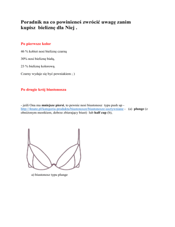Poradnik na co powinieneś zwrócić uwagę zanim kupisz bieliznę dla Niej . Po pierwsze kolor 46 % kobiet nosi bieliznę czarną 30% nosi bieliznę białą, 23 % bieliznę kolorową. Czarny wydaje się być pewniakiem ; ) Po drugie krój biustonosza - jeśli Ona ma mniejsze piersi, to pewnie nosi biustonosz typu push up http://4mate.pl/kategoria-produktu/biustonosze/biustonosze-usztywniane - (a) plunge (z obniżonym mostkiem, dobrze zbierający biust) lub half cup (b), a) biustonosz typu plunge b) biustonosz typu half cup - jeśli Ona ma większe piersi to zapewne jest to biustonosz typu balkonetka http://4mate.pl/kategoria-produktu/biustonosze/biustonosze-pol-usztwniane - ( c) lub full cup (d) c) biustonosz typu balkonetka biustonosz typu full cup Po trzecie wykonanie biustonosza Biustonosze typu push-up są ulubionymi dla co drugiej kobiety Push-up (http://4mate.pl/kategoria-produktu/biustonosze/biustonosze-usztywniane ) - to biustonosz z rodzaju usztywnianych ( padded), wyposażone w różnego rodzaju wkładki powiększające, mające za zadanie optycznie powiększać i eksponować biust . Możecie się spotkać także z określeniami miękkie ( soft ) lub pół usztywniane ( semi soft ) . - biustonosz soft (http://4mate.pl/kategoria-produktu/biustonosze/biustonosze-usztywniane ) wykonany jest z materiału, który swobodnie dopasowuje się do kształtu piersi. Miseczka nie jest wyściełana żadnym wypełnieniem, jedynym usztywnieniem są fiszbiny utrzymujące kształt stanika. Dzięki temu biustonosz jest przewiewny, co jest doceniane przez panie szczególnie w upalne dni. biustonosz typu soft - biustonosze pół usztywniane - http://4mate.pl/kategoria-produktu/biustonosze/biustonoszepol-usztwniane - mają dolną część miseczki usztywnioną , a górna pozostaje miękka. Na średnim i dużym biuście szczególnie dobrze będą leżeć full-cupy i balkonetki, biustonosz typu semi soft - biustonosze usztywniane (padded) - http://4mate.pl/kategoriaproduktu/biustonosze/biustonosze-usztywniane - dzielą się na dwie kategorie: z miseczkami bezszwowymi, tłoczonymi maszynowo (tak zwana kopa) oraz z miseczkami szytymi w klasyczny sposób. Staniki padded występują w wielu krojach, najpopularniejszy to plunge, polecany paniom o mniejszym i średnim biuście oraz o blisko osadzonych piersiach. biustonosz usztywniany Możecie jeszcze spotkać się z następującymi określeniami rodzajów biustonoszy a ) biustonosze typu bardotka - to staniki bez ramiączek lub z odpinanymi całkowicie ramiączkami biustonosz typu bardotka b ) biustonoszach na fiszbinach to jest biustonoszach , które mają wszyte w swój dolny obrys druty ( z tworzywa ) o półkolistym kształcie – tzw . fiszbiny. Większość biustonoszy posiada fiszbiny. c ) t-shirt bra – to biustonosz o gładkim wykończeniu nie odznaczający się pod bluzką lub tshirtem. Majtki Po czwarte krój majtek 1. Figi - http://4mate.pl/kategoria-produktu/figi - to najpopularniejsze majtki wśród pań. Ich różnorodność doprowadziła do podziału na kilka kategorii : - Figi rio charakteryzuje podwyższony stan i głębokie wcięcia na udach. figi rio - Figi spaghetti w talii posiadają cienką nitkę (stąd nazwa), z tyłu są zabudowane. Pozbawione są tradycyjnego paska gumowego. figi spagetti - Figi pełne są mocno zabudowane, zasłaniają praktycznie całe pośladki i mają umiarkowane wcięcia. Wyglądają dobrze właściwie na każdej pupie. Najpopularniejsze wśród fig. figi pełne - Figi tanga nieco przypominają stringi, aczkolwiek nie są aż tak bardzo skąpe. Cechują się szerokim elastycznym pasem. figi tanga 2. Stringi Stringi - http://4mate.pl/kategoria-produktu/stringi - i wszystko jasne : ) . Są to majteczki , w których kobiety są najchętniej widywane przez mężczyzn. Niestety większość kobiet (70%) ich nie nosi . Przynajmniej na co dzień ; ) stringi 3. Biodrówki zwane często hipsterami ( angielskie hip – biodro ) , to majtki z obniżonym stanem są bardzo wygodne w noszeniu, zasłaniają praktycznie całe biodra Biodrówki 4. Szorty Szorty - http://4mate.pl/kategoria-produktu/szorty - to zabudowane majtki zasłaniające praktycznie całe biodra. Posiadają krótkie nogawki czym odróżniają się od biodrówek. szorty Oczywiście ważne są materiały, z których wykonana jest bielizna. Jeżeli chodzi o biustonosze to oczywiście bawełna , jedwab , poliester , elastan. Tworzyw sztucznych nie da się uniknąć szczególnie jeśli biustonosze są wykończone koronką lub są wyposażone we wkładki ( push-up ). Podobnie jest w przypadku majteczek , jednak w nich udział bawełny powinien być większy.