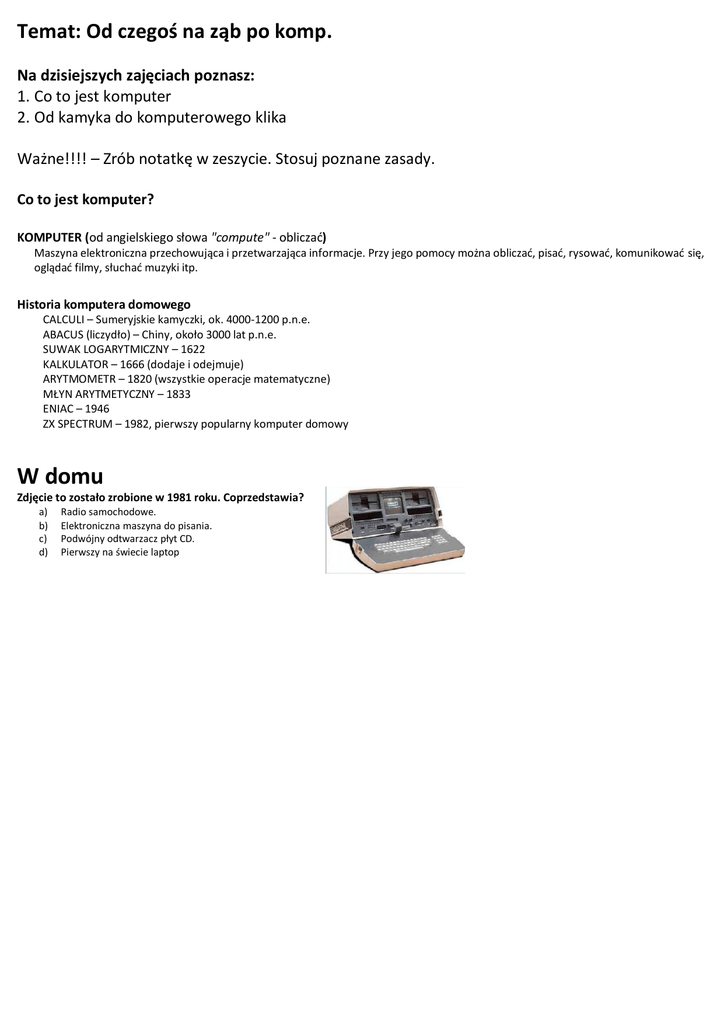 Temat: Od czegoś na ząb po komp. Na dzisiejszych zajęciach poznasz: 1. Co to jest komputer 2. Od kamyka do komputerowego klika Ważne!!!! – Zrób notatkę w zeszycie. Stosuj poznane zasady. Co to jest komputer? KOMPUTER (od angielskiego słowa "compute" - obliczać) Maszyna elektroniczna przechowująca i przetwarzająca informacje. Przy jego pomocy można obliczać, pisać, rysować, komunikować się, oglądać filmy, słuchać muzyki itp. Historia komputera domowego CALCULI – Sumeryjskie kamyczki, ok. 4000-1200 p.n.e. ABACUS (liczydło) – Chiny, około 3000 lat p.n.e. SUWAK LOGARYTMICZNY – 1622 KALKULATOR – 1666 (dodaje i odejmuje) ARYTMOMETR – 1820 (wszystkie operacje matematyczne) MŁYN ARYTMETYCZNY – 1833 ENIAC – 1946 ZX SPECTRUM – 1982, pierwszy popularny komputer domowy W domu Zdjęcie to zostało zrobione w 1981 roku. Coprzedstawia? a) b) c) d) Radio samochodowe. Elektroniczna maszyna do pisania. Podwójny odtwarzacz płyt CD. Pierwszy na świecie laptop