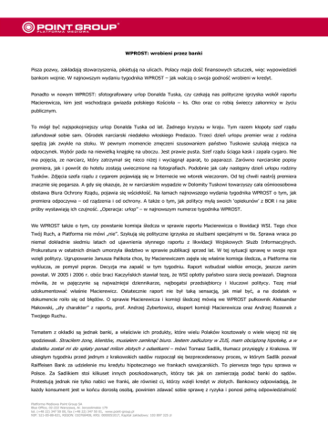 WPROST: wrobieni przez banki Pisza pozwy, zakładają stowarzyszenia, pikietują na ulicach. Polacy maja dość finansowych sztuczek, więc wypowiedzieli bankom wojnie. W najnowszym wydaniu tygodnika WPROST – jak walczą o swoja godność wrobieni w kredyt. Ponadto w nowym WPROST: sfotografowany urlop Donalda Tuska, czy czekają nas polityczne igrzyska wokół raportu Macierewicza, kim jest wschodząca gwiazda polskiego Kościoła – ks. Oko oraz co robią świeccy zakonnicy w życiu publicznym. To mógł być najspokojniejszy urlop Donalda Tuska od lat. Żadnego kryzysu w kraju. Tym razem kłopoty szef rządu zafundował sobie sam. Ośrodek narciarski niedaleko włoskiego Predazzo. Trzeci dzień urlopu premier wraz z rodzina spędzą jak zwykle na stoku. W pewnym momencie zmęczeni szusowaniem państwo Tuskowie szukają miejsca na odpoczynek. Wybór pada na niewielką knajpkę na uboczu. Jest prawie pusta. Szef rządu ściąga kask i zapala cygaro. Nie ma pojęcia, ze narciarz, który zatrzymał się nieco niżej i wyciągnął aparat, to paparazzi. Zarówno narciarskie popisy premiera, jak i powrót do hotelu zostają uwiecznione na fotografiach. Podobnie jak cały następny dzień urlopu rodziny Tusków. Zdjęcia szefa rządu z cygarem pojawiają się w Internecie we wtorek wieczorem. Od tej chwili nastrój premiera znacznie się pogarsza. A gdy się okazuje, że w narciarskim wypadzie w Dolomity Tuskowi towarzyszy cała ośmioosobowa obstawa Biura Ochrony Rządu, pojawia się wściekłość. Na łamach najnowszego wydania tygodnika WPROST o tym, jak premiera odpoczywa – od rządzenia i od ochrony. A także o tym, jak politycy mylą swoich ‘opiekunów’ z BOR i na jakie próby wystawiają ich czujność. „Operacja: urlop” – w najnowszym numerze tygodnika WPROST. We WPROST także o tym, czy powstanie komisja śledcza w sprawie raportu Macierewicza o likwidacji WSI. Tego chce Twój Ruch, a Platforma nie mówi „nie”. Szykują się polityczne igrzyska ze służbami specjalnymi w tle. Sprawa wraca po niemal dokładnie siedmiu latach od ujawnienia słynnego raportu z likwidacji Wojskowych Służb Informacyjnych. Prokuratura w ostatnich dniach umorzyła śledztwo w sprawie publikacji sprzed lat. W tej sytuacji sprawę w swoje ręce wzięli politycy. Ugrupowanie Janusza Palikota chce, by Macierewiczem zajęła się właśnie komisja śledcza, a Platforma nie wyklucza, ze pomysł poprze. Decyzja ma zapaść w tym tygodniu. Raport wzbudzał wielkie emocje, jeszcze zanim powstał. W 2005 i 2006 r. obóz braci Kaczyńskich stawiał tezę, że WSI oplotły państwo szara siecią powiazań. Diagnoza mówiła, że w pajęczynie są najważniejsi dziennikarze, najbogatsi przedsiębiorcy i kluczowi politycy. Tezę miał udokumentować właśnie Macierewicz. Ostatecznie raport nie był taką sensacją, jak miał być, a na dodatek w dokumencie roiło się od błędów. O sprawie Macierewicza i komisji śledczej mówią we WPROST pułkownik Aleksander Makowski, „zły charakter” z raportu, prof. Andrzej Zybertowicz, ekspert komisji Macierewicza oraz Andrzej Rozenek z Twojego Ruchu. Tematem z okładki są jednak banki, a właściwie ich produkty, które wielu Polaków kosztowały o wiele więcej niż się spodziewali. Straciłem żonę, klientów, musiałem zamknąć biuro. Jestem zadłużony w ZUS, mam obciążoną hipotekę, a w dodatku został mi do spłaty ponad milion złotych z odsetkami – mówi Tomasz Sadlik, tłumacz przysięgły z Krakowa. W ubiegłym tygodniu przed jednym z krakowskich sadów rozpoczął się bezprecedensowy proces, w którym Sadlik pozwał Raiffeisen Bank za udzielenie mu kredytu hipotecznego we frankach szwajcarskich. To pierwsza tego typu sprawa w Polsce. Za Sadlikiem stoi kilkuset innych poszkodowanych, którzy tak jak on zamierzają podać banki do sądów. Protestują jednak nie tylko nabici we franki, ale również ci, którzy wzięli kredyt w złotych. Bankowcy odpowiadają, że każdy konsument jest w końcu dorosłą osobą, powinien zdawać sobie sprawę z ryzyka i ponosi pełną odpowiedzialność Platforma Mediowa Point Group SA Blue Office, 02-222 Warszawa, Al. Jerozolimskie 179 tel. (+48 22) 347 50 00, fax (+48 22) 347 50 01, www.point-group.pl NIP: 521-00-88-831, REGON: 010768408, KRS: 0000051017, Kapitał zakładowy: 103 897 325 zł za podpis na umowie. Ale są już precedensy. Czu z bankami można wygrać? I jak Polacy walczą z bankowymi sztuczkami – w nowym WPROST. WPROST pisze także o wschodzącej gwieździe polskiego Kościoła. Tam, gdzie inni księża stosują święconą wodę i modlitwę, ksiądz prof. Dariusz Oko preferuje wypalanie żelazem i klątwy. Ukoronowanie jego dotychczasowej działalności nastąpi w najbliższy czwartek, gdy w Sejmie wygłosi swój wykład o szkodliwości gender. Jeśli jakaś niespodziewana medialna katastrofa nie popsuje mu szyków, jego występ ma szanse stać się przekazem dnia we wszystkich telewizjach, radiach i portalach internetowych. Dla telewizji ksiądz Dariusz Oko jest żyła złota. Mówi prosto, ale dosadnie, jest kontrowersyjny, wyzwala emocje i, najważniejsze, powoduje wzrost oglądalności. I nigdy nie odmawia przyjścia do programów, do których wielu innych księży by pewnie nie przyszło. Fachowo stosuje zasadę wzmocnionego impulsu: każda kolejna jego wypowiedź jest ostrzejsza od poprzedniej. Zawsze powie coś, co gotuje krew w żyłach zwykłym telewidzom, a zaraz potem zaczyna żyć własnym życiem. Nie wszystkim w Kościele się to podoba. „Oko na gender” – kariera księdza Oko w nowym wydaniu tygodnika WPROST. Na łamach tygodnika również o… świeckich zakonnikach w polskiej polityce. Informacja o tym, że wiceminister w rządzie Donalda Tuska jest oblatem benedyktyńskim zelektryzowała opinię publiczną w minionym tygodniu. Ale świeckich zakonników w Sejmie, Senacie i instytucjach publicznych jest znacznie więcej. Oblaci to świeccy, dorośli, którzy