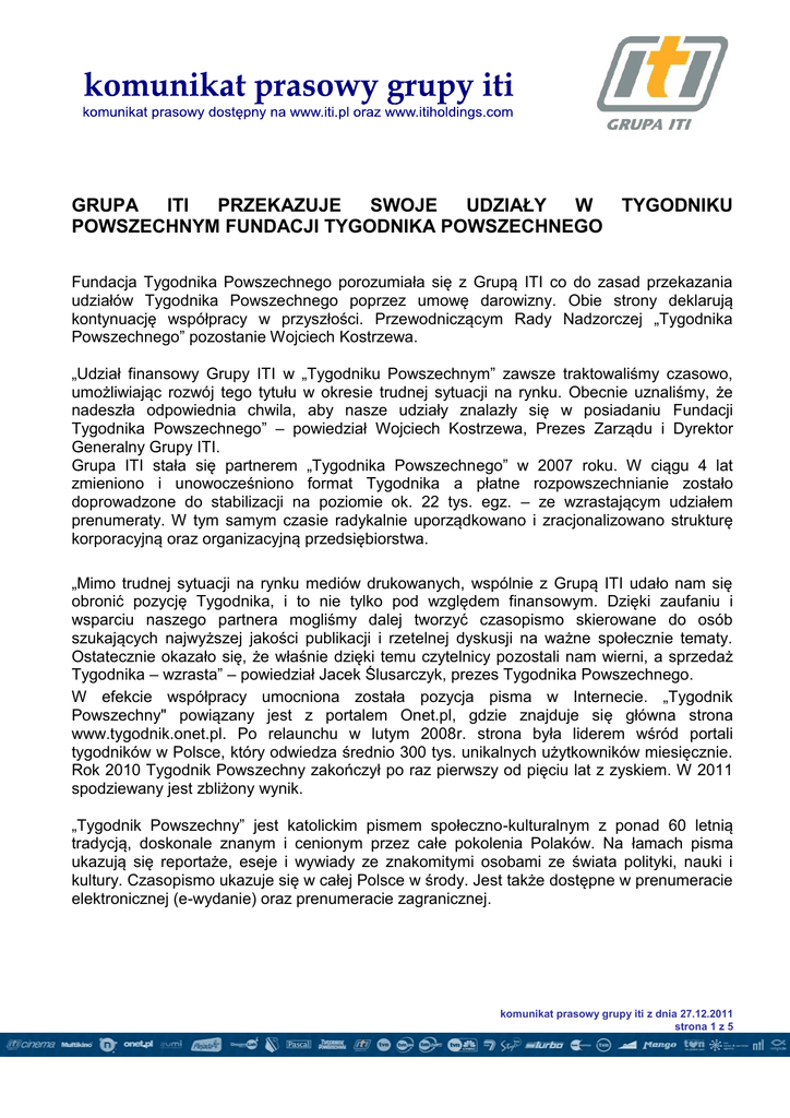 GRUPA ITI PRZEKAZUJE SWOJE UDZIAŁY W POWSZECHNYM FUNDACJI TYGODNIKA POWSZECHNEGO TYGODNIKU Fundacja Tygodnika Powszechnego porozumiała się z Grupą ITI co do zasad przekazania udziałów Tygodnika Powszechnego poprzez umowę darowizny. Obie strony deklarują kontynuację współpracy w przyszłości. Przewodniczącym Rady Nadzorczej „Tygodnika Powszechnego” pozostanie Wojciech Kostrzewa. „Udział finansowy Grupy ITI w „Tygodniku Powszechnym” zawsze traktowaliśmy czasowo, umożliwiając rozwój tego tytułu w okresie trudnej sytuacji na rynku. Obecnie uznaliśmy, że nadeszła odpowiednia chwila, aby nasze udziały znalazły się w posiadaniu Fundacji Tygodnika Powszechnego” – powiedział Wojciech Kostrzewa, Prezes Zarządu i Dyrektor Generalny Grupy ITI. Grupa ITI stała się partnerem „Tygodnika Powszechnego” w 2007 roku. W ciągu 4 lat zmieniono i unowocześniono format Tygodnika a płatne rozpowszechnianie zostało doprowadzone do stabilizacji na poziomie ok. 22 tys. egz. – ze wzrastającym udziałem prenumeraty. W tym samym czasie radykalnie uporządkowano i zracjonalizowano strukturę korporacyjną oraz organizacyjną przedsiębiorstwa. „Mimo trudnej sytuacji na rynku mediów drukowanych, wspólnie z Grupą ITI udało nam się obronić pozycję Tygodnika, i to nie tylko pod względem finansowym. Dzięki zaufaniu i wsparciu naszego partnera mogliśmy dalej tworzyć czasopismo skierowane do osób szukających najwyższej jakości publikacji i rzetelnej dyskusji na ważne społecznie tematy. Ostatecznie okazało się, że właśnie dzięki temu czytelnicy pozostali nam wierni, a sprzedaż Tygodnika – wzrasta” – powiedział Jacek Ślusarczyk, prezes Tygodnika Powszechnego. W efekcie współpracy umocniona została pozycja pisma w Internecie. „Tygodnik Powszechny" powiązany jest z portalem Onet.pl, gdzie znajduje się główna strona www.tygodnik.onet.pl. Po relaunchu w lutym 2008r. strona była liderem wśród portali tygodników w Polsce, który odwiedza średnio 300 tys. unikalnych użytkowników miesięcznie. Rok 2010 Tygodnik Powszechny zakończył po raz pierwszy od pięciu lat z zyskiem. W 2011 spodziewany jest zbliżony wynik. „Tygodnik Powszechny” jest katolickim pismem społeczno-kulturalnym z ponad 60 letnią tradycją, doskonale znanym i cenionym przez całe pokolenia Polaków. Na łamach pisma ukazują się reportaże, eseje i wywiady ze znakomitymi osobami ze świata polityki, nauki i kultury. Czasopismo ukazuje się w całej Polsce w środy. Jest także dostępne w prenumeracie elektronicznej (e-wydanie) oraz prenumeracie zagranicznej. komunikat prasowy grupy iti z dnia 27.12.2011 strona 1 z 5 Grupa ITI Grupa ITI jest wiodącą na polskim rynku grupą medialną działającą w obszarze transmisji telewizyjnej, nowych mediów, prowadzenia multipleksów, a także dystrybucji kinowej i piłki nożnej. Nadawanie programów telewizyjnych Grupa ITI prowadzi działalność na rynku telewizyjnym głównie poprzez Grupę TVN, jedną z największych komercyjnych sieci telewizyjnych w Polsce. Grupa TVN jest właścicielem dziesięciu kanałów telewizyjnych. Grupa TVN jest notowana na Giełdzie Papierów Wartościowych w Warszawie (kod notowań na GPW: TVN) od grudnia 2004 roku, będąc częścią indeksu WIG 20. TVN, główny kanał telewizyjny Grupy, jest na polskim rynku uznawany za czołowy program telewizyjny, oferujący wysokiej jakości programy rozrywkowe oraz rzetelne i niezależne audycje informacyjne. TVN dociera do 91% gospodarstw domowych w Polsce. TVN7 to kanał telewizyjny o profilu filmowo-serialowym, uzupełniający ofertę programową TVN. Kanał dociera do 64% gospodarstw domowych w Polsce. TVN24 jest pierwszym polskim 24-godzinnym informacyjno-publicystycznym kanałem telewizyjnym docierającym do 58% gospodarstw domowych w Polsce. TVN CNBC jest kanałem informacyjnym o tematyce biznesowej, przygotowywanym we współpracy z CNBC Europe. Kanał dociera do 35% gospodarstw domowych w Polsce. TVN Meteo to pierwszy polski kanał telewizyjny o pogodzie, docierający do 55% gospodarstw domowych w Polsce. TVN Turbo jest pierwszym polskim kanałem tematycznym adresowanym do mężczyzn i zarazem pierwszym poświęconym głównie motoryzacji. Kanał dociera do 56% gospodarstw domowych. TVN Style jest kanałem telewizyjnym poświęconym urodzie, stylom życia, modzie oraz zdrowiu adresowanym do kobiet. Dociera do 56% gospodarstw domowych. ITVN jest kanałem telewizyjnym skierowanym do widowni pochodzenia polskiego zamieszkałej za granicą, dostępnym w Europie, Ameryce Północnej i w Australii. Telezakupy Mango to jedyny w Polsce całodobowy kanał telesprzedażowy, docierający do 58% gospodarstw domowych. NTL jest lokalnym kanałem telewizyjnym adresowanym do mieszkańców Radomska i okolic. TVN News & Services Agency, najbardziej wszechstronnie działająca agencja mediowa w Europie Środkowej i Wschodniej, jako jedyna w regionie oferuje pełną kompleksowość usług. Online Grupa ITI prowadzi działalność w segmencie nowych mediów poprzez Grupę Onet.pl S.A., operatora www.onet.pl - najpopularniejszego portalu internetowego w Polsce. Grupa Onet.pl S.A jest operatorem najbardziej lubianych pozycji internetowych w kilku kategoriach tematycznych takich jak Sympatia.pl - wiodący serwis randkowy w Polsce, Onet Blog –najlepsza strona blogowa w Polsce, Onet Video i zumi.pl – pierwsza usługa wyszukiwania i lokalizacji dostępna w Polsce. Grupa Onet.pl S.A. jest jednostką całkowicie zależną od TVN S.A. Onet jest największym i najczęściej odwiedzanym medium internetowym w Polsce. Onet jest liderem pod względem liczby użytkowników w głównych kategoriach tematycznych: biznes, finanse, prawo; informacje, publicystyka, media; sport; turystyka. komunikat prasowy grupy iti z dnia dnia 27.12.2011 strona 2 z 5 Sukces w swoich kategoriach odnoszą również: OnetBlog – największa blogosfera w polskiej sieci. Sympatia.pl – n