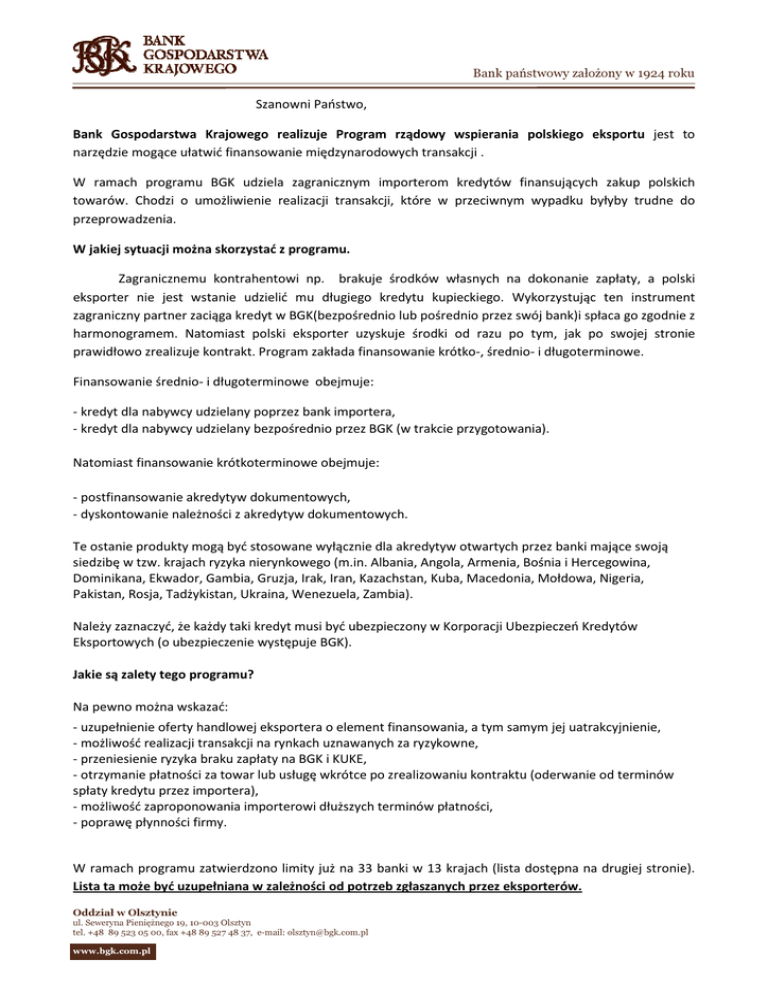 Bank państwowy założony w 1924 roku Szanowni Państwo, Bank Gospodarstwa Krajowego realizuje Program rządowy wspierania polskiego eksportu jest to narzędzie mogące ułatwić finansowanie międzynarodowych transakcji . W ramach programu BGK udziela zagranicznym importerom kredytów finansujących zakup polskich towarów. Chodzi o umożliwienie realizacji transakcji, które w przeciwnym wypadku byłyby trudne do przeprowadzenia. W jakiej sytuacji można skorzystać z programu. Zagranicznemu kontrahentowi np. brakuje środków własnych na dokonanie zapłaty, a polski eksporter nie jest wstanie udzielić mu długiego kredytu kupieckiego. Wykorzystując ten instrument zagraniczny partner zaciąga kredyt w BGK(bezpośrednio lub pośrednio przez swój bank)i spłaca go zgodnie z harmonogramem. Natomiast polski eksporter uzyskuje środki od razu po tym, jak po swojej stronie prawidłowo zrealizuje kontrakt. Program zakłada finansowanie krótko-, średnio- i długoterminowe. Finansowanie średnio- i długoterminowe obejmuje: - kredyt dla nabywcy udzielany poprzez bank importera, - kredyt dla nabywcy udzielany bezpośrednio przez BGK (w trakcie przygotowania). Natomiast finansowanie krótkoterminowe obejmuje: - postfinansowanie akredytyw dokumentowych, - dyskontowanie należności z akredytyw dokumentowych. Te ostanie produkty mogą być stosowane wyłącznie dla akredytyw otwartych przez banki mające swoją siedzibę w tzw. krajach ryzyka nierynkowego (m.in. Albania, Angola, Armenia, Bośnia i Hercegowina, Dominikana, Ekwador, Gambia, Gruzja, Irak, Iran, Kazachstan, Kuba, Macedonia, Mołdowa, Nigeria, Pakistan, Rosja, Tadżykistan, Ukraina, Wenezuela, Zambia). Należy zaznaczyć, że każdy taki kredyt musi być ubezpieczony w Korporacji Ubezpieczeń Kredytów Eksportowych (o ubezpieczenie występuje BGK). Jakie są zalety tego programu? Na pewno można wskazać: - uzupełnienie oferty handlowej eksportera o element finansowania, a tym samym jej uatrakcyjnienie, - możliwość realizacji transakcji na rynkach uznawanych za ryzykowne, - przeniesienie ryzyka braku zapłaty na BGK i KUKE, - otrzymanie płatności za towar lub usługę wkrótce po zrealizowaniu kontraktu (oderwanie od terminów spłaty kredytu przez importera), - możliwość zaproponowania importerowi dłuższych terminów płatności, - poprawę płynności firmy. W ramach programu zatwierdzono limity już na 33 banki w 13 krajach (lista dostępna na drugiej stronie). Lista ta może być uzupełniana w zależności od potrzeb zgłaszanych przez eksporterów. Oddział w Olsztynie ul. Seweryna Pieniężnego 19, 10-003 Olsztyn tel. +48 89 523 05 00, fax +48 89 527 48 37, e-mail: [email protected] www.bgk.com.pl Beneficjentem Programu są polscy eksporterzy, dla których zwiększone zostały możliwości wejścia na nowe rynki. Dzięki Programowi polscy przedsiębiorcy mogą oferować zagranicznym klientom zakup towarów i usług w kredycie. Kredyt na atrakcyjnych warunkach jest udzielany przez BGK. Ryzyko zapłaty za towar przejmuje bank. Eksporter otrzymuje płatność za eksport z BGK tuż po jego dokonaniu, a importer dokonuje zapłaty w okresie spłaty kredytu w BGK. Poniżej prezentujemy koszty kredytów dla banku importera przeznaczonych na finansowanie działalności eksportowej polskich przedsiębiorstw na wybranych rynkach Rosja Składniki kosztu kredytu dla banku importera EURIBOR12 M Marża (w tym ubezpieczenie KUKE) Brak dodatkowych opłat Pełny roczny koszt kredytu Składniki kosztu kredytu dla banku importera Stała stopa CIRR Marża Ubezpieczenie KUKE jeżeli płatne jednorazowo Pełny roczny koszt kredytu Białoruś Kazachstan Azerbejdżan Gruzja Czechy* Okres spłaty: do 2 lat (eksport dowolnych dóbr i usług) Przykład: kredyt o jednorocznym okresie spłaty, udzielony w EUR 1,50% 1,50% 1,50% 1,50% 1,50% 1,50% 1,75% 2,50% 2,00% 2,00% 2,20% 2,00% 3,25% 4,00% 3,50% 3,50% 3,70% 3,50% Okres spłaty kredytu: od 2 do 5 lat (eksport dóbr i usług inwestycyjnych) Przykład: kredyt o pięcioletnim okresie spłaty, udzielony w EUR 2,32% 2,32% 2,32% 2,32% 2,32% 2,32% 0,50% 0,50% 0,50% 0,50% 0,50% 0,50% 1,72% 3,74% 2,27% 2,27% 2,92% 0,60% 3,96% 8,70% 5,29% 5,29% 6,82% 1,16% 4,54% 6,56% 5,09% 5,09% 5,74% 3,42% *oferta finansowania z okresem spłaty do 2 lat - poza Programem Rządowym Brak innych opłat i prowizji związanych z kredytem w BGK Koszt dla importera = koszt dla banku importera + marża banku importera Drugim instrumentem realizowanym przez BGK jest program DOKE. To system polegający na udzielaniu z budżetu państwa dopłat do oprocentowania konkretnego kredytu eksportowego o stałej stopie procentowej, udzielonego przez bank krajowy, zagraniczny lub międzynarodową instytucję finansową. Dopłaty realizowane są w ramach wzajemnych rozliczeń między BGK a bankiem udzielającym kredytu. Podstawę prawną programu stanowi ustawa o dopłatach do oprocentowania kredytów eksportowych o stałych stopach procentowych (DzU z 2001 r. nr 73, poz. 762 ze zm.). Zapraszamy do kontaktu z BGK Oddział w Olsztynie ul. Seweryna Pieniężnego 19, 10-003 Olsztyn tel. +48 89 523 05 00, fax +48 89 527 48 37, e-mail: [email protected] Dyrektor Oddziału Pani Bernarda Gosztowt, Z-ca Dyr. Oddz. ds. Sprzedaży Pani Maria Borzym Doradcy Klienta: Pani Anna Cichosz, Pan Jarosław Maczuga i Pan Dariusz Nadolny Wszelkie informacje zawarte w niniejszym materiale nie mogą być kopiowane, duplikowane, reprodukowane, przetwarzane, wykorzystywane, publikowane w żadnej formie i w jakikolwiek sposób bez zgody Banku Gospodarstwa Krajowego. Warunki zawarte w niniejszym materiale służą wyłącznie do celów informacyjnych i muszą być w sposób definitywny określone w umowie i/lub potwierdzeniu. Niniejszy materiał nie stanowi oferty sprzedaży ani oferowania usług osób trzecich celem zawarcia transakcji zgodnie z polskim Kodeksem Cywilnym i nie jest wiążący dla BGK. 2/
