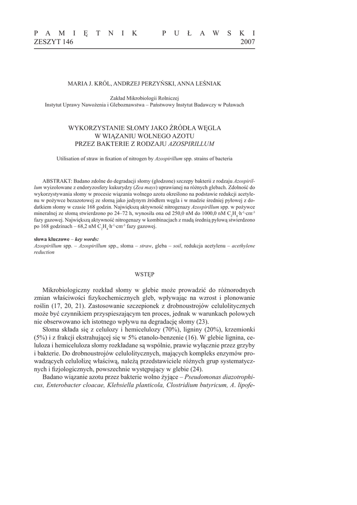 P A M I ZESZYT 146 Ę T N I K P U Ł A W S K I 2007 MARIA J. KRÓL, ANDRZEJ PERZYŃSKI, ANNA LEŚNIAK Zakład Mikrobiologii Rolniczej Instytut Uprawy Nawożenia i Gleboznawstwa – Państwowy Instytut Badawczy w Puławach WYKORZYSTANIE SŁOMY JAKO ŹRÓDŁA WĘGLA W WIĄZANIU WOLNEGO AZOTU PRZEZ BAKTERIE Z RODZAJU AZOSPIRILLUM Utilisation of straw in fixation of nitrogen by Azospirillum spp. strains of bacteria ABSTRAKT: Badano zdolne do degradacji słomy (głodzone) szczepy bakterii z rodzaju Azospirillum wyizolowane z endoryzosfery kukurydzy (Zea mays) uprawianej na różnych glebach. Zdolność do wykorzystywania słomy w procesie wiązania wolnego azotu określono na podstawie redukcji acetylenu w pożywce bezazotowej ze słomą jako jedynym źródłem węgla i w madzie średniej pyłowej z dodatkiem słomy w czasie 168 godzin. Największą aktywność nitrogenazy Azospirillum spp. w pożywce mineralnej ze słomą stwierdzono po 24–72 h, wynosiła ona od 250,0 nM do 1000,0 nM C2H4·h-1·cm-3 fazy gazowej. Największą aktywność nitrogenazy w kombinacjach z madą średnią pyłową stwierdzono po 168 godzinach – 68,2 nM C2H4·h-1·cm-3 fazy gazowej. słowa kluczowe – key words: Azospirillum spp. – Azospirillum spp., słoma – straw, gleba – soil, redukcja acetylenu – acethylene reduction WSTĘP Mikrobiologiczny rozkład słomy w glebie może prowadzić do różnorodnych zmian właściwości fizykochemicznych gleb, wpływając na wzrost i plonowanie roślin (17, 20, 21). Zastosowanie szczepionek z drobnoustrojów celulolitycznych może być czynnikiem przyspieszającym ten proces, jednak w warunkach polowych nie obserwowano ich istotnego wpływu na degradację słomy (23). Słoma składa się z celulozy i hemicelulozy (70%), ligniny (20%), krzemionki (5%) i z frakcji ekstrahującej się w 5% etanolo-benzenie (16). W glebie lignina, celuloza i hemiceluloza słomy rozkładane są wspólnie, prawie wyłącznie przez grzyby i bakterie. Do drobnoustrojów celulolitycznych, mających kompleks enzymów prowadzących celulolizę właściwą, należą przedstawiciele różnych grup systematycznych i fizjologicznych, powszechnie występujący w glebie (24). Badano wiązanie azotu przez bakterie wolno żyjące – Pseudomonas diazotrophicus, Enterobacter cloacae, Klebsiella planticola, Clostridium butyricum, A. lipofe- 22 Zakład Mikrobiologii Rolniczej IUNG-PIB – Puławy [2] rum i A. brasilense, w doświadczeniach laboratoryjnych z glebą mieszaną: z celulozą (5), ze słomą pszenicy (8), słomą owsianą (3), z łodygami kukurydzy (1), ze słomą ryżową (13) i z odpadkami z trzciny cukrowej (19). Aktywność nitrogenazy była kilkakrotnie wyższa w glebach z dodatkiem celulozy. Ryzobakterie z rodzaju Azospirillum mogą wykorzystywać słomę, celulozę i ksylan (główny składnik hemicelulozy) oraz wiązać azot (9). Właściwości takie mają prawdopodobnie dwa gatunki: A. lipoferum, A. brasilense (13, 27). Trzeci gatunek A. irakense hydrolizuje celobiozę – dwucukier zbudowany z dwóch cząsteczek D-glukozy połączonych wiązaniem β-1,4-glikozydowym – która jest przejściowym produktem degradacji celulozy (7). W naszych wcześniejszych badaniach ze szczepami Azospirillum spp. stwierdziliśmy, że bakterie te hydrolizowały zarówno celulozę, jak i ksylan (12). Enzymy celulolityczne i ksylolityczne były obecne u większości szczepów bakterii Azospirillum spp. pochodzących z endoryzosfery kukurydzy. W literaturze światowej brakuje danych dotyczących informacji o wykorzystywaniu celulozy, ksylanu i słomy jako jedynego źródła węgla w wiązaniu wolnego azotu przez bakterie z rodzaju Azospirillum. Ze względu na znaczenie, jakie ma kompleks enzymatyczny* celulaz i ksylanaz w endoryzosferze roślin zbożowych, podjęto badania nad określeniem aktywności nitrogenazy celulolitycznych szczepów Azospirillum spp. przy wykorzystaniu słomy jako jedynego źródła węgla w wiązaniu wolnego azotu. MATERIAŁ I METODY Wybrano trzy szczepy bakterii celulolitycznych, ksylanolitycznych (12) i rozkładających WWA (11) z rodzaju Azospirillum: 4B, 77Bb1, 83B1, wyizolowane z endoryzosfery kukurydzy (Zea mays). Przebadano ich zdolność do wiązania wolnego azotu w pożywkach mineralnych, bezazotowych z dodatkiem słomy jako jedynego źródła węgla i energii (12). Do badań w pierwszej partii użyto słomy jęczmiennej, owsianej, pszenicznej i żytniej (sproszkowanej w ilości 0,1% wagowo) oraz mineralnej półpłynnej pożywki Nfb (6) bez kwasu jabłkowego. W drugiej partii zamiast pożywki mineralnej użyto gleby – mady średniej pyłowej w ilości 4 g na buteleczkę. W ciągu 168 godzin określano wykorzystywanie przez szczepy Azospirillum spp. słomy jako jedynego źródła węgla i energii podczas wzrostu i wiązania azotu * Celulaza hydrolizuje wiązania β-1-4-glikozydowe; zidentyfikowano dwa różne typy celulazy: endoglukanazę i celobiohydrolazę (egzoglukanazy). Endoglukanazy hydrolizują wiązania wewnątrz celulozy, najbardziej podatne wiązania są w regionach niekrystalicznych fibryli celulozy. Mikroorganizmy są zdolne używać produktów hydrolizy jako źródła energii, celobioza musi być rozkładana do dwóch cząsteczek glukozy przez β-glukozydazę. Drobnoustroje, aby efektywnie zużywać celulozę jako źródło energii, muszą wydzielać mieszankę enzymów endoglukanazy, celobiohydrolazy i β-glukozydazy, by była stale w środowisku (4). Do kompletnej degradacji ksylanu wymagane jest współdziałanie ksylanaz i β-ksylozydazy z: α-arabinofuranozydazą, α-metyloglukuronidazą, esterazą acetyloksylanową i esterazą kwasu ferulowego (15). [3] Wykorzystanie słomy jako źródła węgla w wiązaniu wolnego azotu... – M.J. Król i in. 23 w bezazotowej pożywce mineralnej (6) i w glebie. W pierwszej partii komórki bakterii (o gęstości około 106 jtk/na buteleczkę) po zmyciu solą fizjologiczną ze skosów z podłoża ziemniaczanego były 