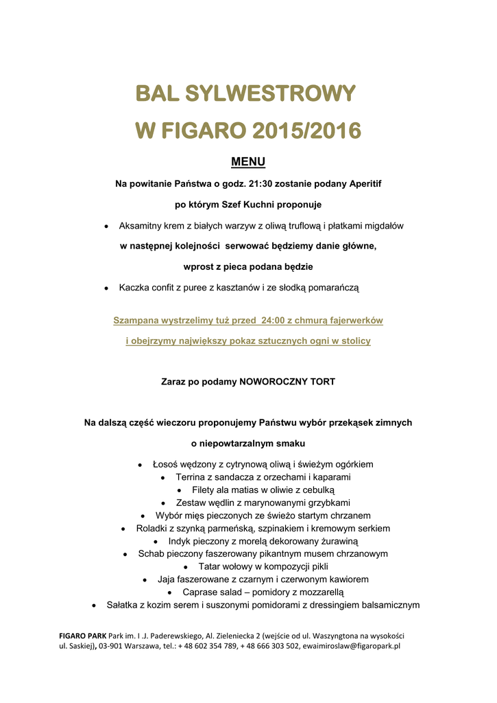 BAL SYLWESTROWY W FIGARO 2015/2016 MENU Na powitanie Państwa o godz. 21:30 zostanie podany Aperitif po którym Szef Kuchni proponuje Aksamitny krem z białych warzyw z oliwą truflową i płatkami migdałów w następnej kolejności serwować będziemy danie główne, wprost z pieca podana będzie Kaczka confit z puree z kasztanów i ze słodką pomarańczą Szampana wystrzelimy tuż przed 24:00 z chmurą fajerwerków i obejrzymy największy pokaz sztucznych ogni w stolicy Zaraz po podamy NOWOROCZNY TORT Na dalszą część wieczoru proponujemy Państwu wybór przekąsek zimnych o niepowtarzalnym smaku Łosoś wędzony z cytrynową oliwą i świeżym ogórkiem Terrina z sandacza z orzechami i kaparami Filety ala matias w oliwie z cebulką Zestaw wędlin z marynowanymi grzybkami Wybór mięs pieczonych ze świeżo startym chrzanem Roladki z szynką parmeńską, szpinakiem i kremowym serkiem Indyk pieczony z morelą dekorowany żurawiną Schab pieczony faszerowany pikantnym musem chrzanowym Tatar wołowy w kompozycji pikli Jaja faszerowane z czarnym i czerwonym kawiorem Caprase salad – pomidory z mozzarellą Sałatka z kozim serem i suszonymi pomidorami z dressingiem balsamicznym FIGARO PARK Park im. I .J. Paderewskiego, Al. Zieleniecka 2 (wejście od ul. Waszyngtona na wysokości ul. Saskiej), 03-901 Warszawa, tel.: + 48 602 354 789, + 48 666 303 502, [email protected] Nad ranem podamy Boeuf Bourgnignon / Gulasz z wołowiny i czerwonego wina / Dopełnieniem proponowanego menu będzie Wódka biała polska Wino Chardonnay Wino Cabernet Sauvignon Napoje zimne Soki owocowe Woda mineralna Coffee break przepełniony kruchymi ciasteczkami i kolorowymi cukierkami Kawa, herbata Szampańską zabawę uświetnią atrakcje wieczoru i relaks przy blasku kominków! Cena zaproszenia 299 zł od osoby Grupy od 8-10 osób 10% rabatu powyżej 10 osób 15% rabatu dla studentów specjalna cena 249 zł od osoby Rezerwacje: [email protected] tel. 602 354 789 FIGARO PARK Park im. I .J. Paderewskiego, Al. Zieleniecka 2 (wejście od ul. Waszyngtona na wysokości ul. Saskiej), 03-901 Warszawa, tel.: + 48 602 354 789, + 48 666 303 502, [email protected]