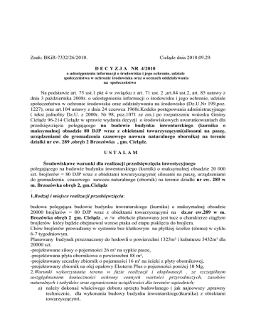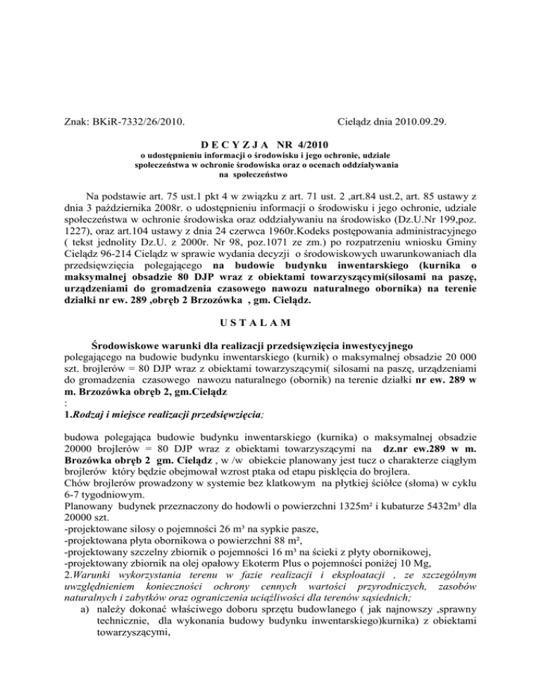 Znak: BKiR-7332/26/2010. Cielądz dnia 2010.09.29. D E C Y Z J A NR 4/2010 o udostępnieniu informacji o środowisku i jego ochronie, udziale społeczeństwa w ochronie środowiska oraz o ocenach oddziaływania na społeczeństwo Na podstawie art. 75 ust.1 pkt 4 w związku z art. 71 ust. 2 ,art.84 ust.2, art. 85 ustawy z dnia 3 października 2008r. o udostępnieniu informacji o środowisku i jego ochronie, udziale społeczeństwa w ochronie środowiska oraz oddziaływaniu na środowisko (Dz.U.Nr 199,poz. 1227), oraz art.104 ustawy z dnia 24 czerwca 1960r.Kodeks postępowania administracyjnego ( tekst jednolity Dz.U. z 2000r. Nr 98, poz.1071 ze zm.) po rozpatrzeniu wniosku Gminy Cielądz 96-214 Cielądz w sprawie wydania decyzji o środowiskowych uwarunkowaniach dla przedsięwzięcia polegającego na budowie budynku inwentarskiego (kurnika o maksymalnej obsadzie 80 DJP wraz z obiektami towarzyszącymi(silosami na paszę, urządzeniami do gromadzenia czasowego nawozu naturalnego obornika) na terenie działki nr ew. 289 ,obręb 2 Brzozówka , gm. Cielądz. USTALAM Środowiskowe warunki dla realizacji przedsięwzięcia inwestycyjnego polegającego na budowie budynku inwentarskiego (kurnik) o maksymalnej obsadzie 20 000 szt. brojlerów = 80 DJP wraz z obiektami towarzyszącymi( silosami na paszę, urządzeniami do gromadzenia czasowego nawozu naturalnego (obornik) na terenie działki nr ew. 289 w m. Brzozówka obręb 2, gm.Cielądz : 1.Rodzaj i miejsce realizacji przedsięwzięcia; budowa polegająca budowie budynku inwentarskiego (kurnika) o maksymalnej obsadzie 20000 brojlerów = 80 DJP wraz z obiektami towarzyszącymi na dz.nr ew.289 w m. Brozówka obręb 2 gm. Cielądz , w /w obiekcie planowany jest tucz o charakterze ciągłym brojlerów który będzie obejmował wzrost ptaka od etapu pisklęcia do brojlera. Chów brojlerów prowadzony w systemie bez klatkowym na płytkiej ściółce (słoma) w cyklu 6-7 tygodniowym. Planowany budynek przeznaczony do hodowli o powierzchni 1325m² i kubaturze 5432m³ dla 20000 szt. -projektowane silosy o pojemności 26 m³ na sypkie pasze, -projektowana płyta obornikowa o powierzchni 88 m², -projektowany szczelny zbiornik o pojemności 16 m³ na ścieki z płyty obornikowej, -projektowany zbiornik na olej opałowy Ekoterm Plus o pojemności poniżej 10 Mg, 2.Warunki wykorzystania terenu w fazie realizacji i eksploatacji , ze szczególnym uwzględnieniem konieczności ochrony cennych wartości przyrodniczych, zasobów naturalnych i zabytków oraz ograniczenia uciążliwości dla terenów sąsiednich; a) należy dokonać właściwego doboru sprzętu budowlanego ( jak najnowszy ,sprawny technicznie, dla wykonania budowy budynku inwentarskiego)kurnika) z obiektami towarzyszącymi, b) organizacja i techniczne warunki prowadzenia prac budowlanych winny eliminować możliwości zakłócania stosunków wodnych. c) organizacja placu budowy i jego zaplecze winno uwzględnić ochronę powierzchni ziemi polegająca na uwzględnieniu zasady minimalizacji zajęcia terenu oraz obowiązku rekultywacji. d) należy właściwie gospodarować odpadami wytworzonymi podczas budowy, w tym minimalizować ich ilości oraz prowadzić selektywną zbiórkę w szczelnych oznakowanych pojemnikach w warunkach zabezpieczających przed dostępem osób postronnych. e) należy minimalizować uciążliwość akustyczną zdeterminowaną prowadzeniem prac budowlanych, poprzez wykonywanie prac wyłącznie w porze dziennej. f) w przypadku konieczności prowadzenia prac ziemnych oraz innych prac związanych a wykorzystaniem sprzętu mechanicznego lub urządzeń technicznych , w obrębie bryły korzeniowej drzew lub krzewów, na terenach zadrzewionych , należy wykonywać je w sposób najmniej szkodzący drzewom lub krzewom, oraz należy ograniczyć do minimum wycinkę drzew i krzewów, g) należy doprowadzić- po zakończeniu prac budowlanych- teren obszarów przyległych do terenu przedsięwzięcia do stanu maksymalnie zbliżonego do stanu poprzedniego, 3. Wymagania dotyczące ochrony środowiska koniecznie do uwzględnienia w projekcie budowlanym: - nie wymagane w sprawie4. Wymogi w zakresie przeciwdziałania skutkom awarii przemysłowych, w odniesieniu do przedsięwzięć zaliczanych do zakładów stwarzających zagrożenie wystąpienia poważnych awarii: - nie wymagane w sprawie – 5. Wymogi w zakresie ograniczenia transgranicznego oddziaływania na środowisko w odniesieniu do przedsięwzięcia dla których przeprowadzono postępowanie dotyczące transgranicznego oddziaływania na środowisko: - nie wymagane w sprawie6. Wymogi w sprawie stwierdzenia konieczności utworzenia obszaru ograniczonego użytkowania: - nie wymaga w sprawieUzasadnienie W dniu 14.07.2010 Pan Leszek Dariusz Kłos zam. Brzozówka 12, 96-214 Cielądz (data wpływu 15.07.2010) złożył wniosek do Urząd Gminy w Cielądzu , o wydanie decyzji o środowiskowych uwarunkowaniach na realizację przedsięwzięcia polegającego na budowie budynku gospodarczego(kurnika o maksymalnej obsadzie 80 DJP wraz z obiektami towarzyszącymi silosami na paszę, urządzeniami do gromadzenia czasowego nawozu mineralnego) na działce nr ew. 289 obręb 2 Brzozówka gm. Cielądz, w projektowany obiekcie planowane jest prowadzenie tuczu o charakterze ciągłym brojlerów od etapu wzrostu ptaka od piskląt do broilera w systemie bez klatkowym na płytkiej ściółce (słoma) Budynek do hodowli o powierzchni 1325 m², kubaturze 5432 m³, silosów o pojemności 26 m³, płyty obornikowej o pow.88m², szczelnego zbiornika o pojemności 16 m³ na odcieki z płyty obornikowej, oraz zbiornika na olej opalowy Ekoterm Plus o pojemności poniżej 10 Mg. ,którego inwestorem będzie Leszek Dariusz Kłos zam.Brzozówka 12, 96-214 Cielądz. Do wniosku załączona została karta informacyjna o planowanym przedsięwzięciu mogącym potencjalnie znacząco oddziaływać na środowisko oraz poświadczona przez właściwy organ, mapa ewidencyjna 1:500 z zaznacz