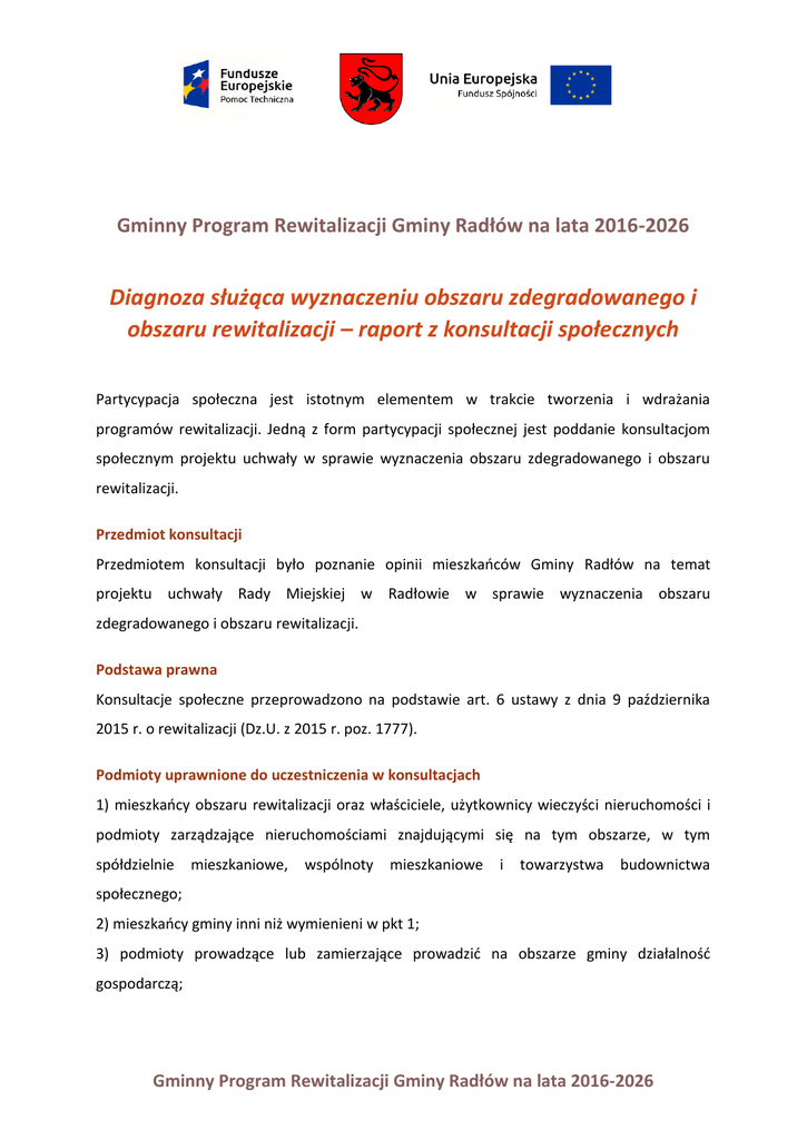 Gminny Program Rewitalizacji Gminy Radłów na lata 2016-2026 Diagnoza służąca wyznaczeniu obszaru zdegradowanego i obszaru rewitalizacji – raport z konsultacji społecznych Partycypacja społeczna jest istotnym elementem w trakcie tworzenia i wdrażania programów rewitalizacji. Jedną z form partycypacji społecznej jest poddanie konsultacjom społecznym projektu uchwały w sprawie wyznaczenia obszaru zdegradowanego i obszaru rewitalizacji. Przedmiot konsultacji Przedmiotem konsultacji było poznanie opinii mieszkańców Gminy Radłów na temat projektu uchwały Rady Miejskiej w Radłowie w sprawie wyznaczenia obszaru zdegradowanego i obszaru rewitalizacji. Podstawa prawna Konsultacje społeczne przeprowadzono na podstawie art. 6 ustawy z dnia 9 października 2015 r. o rewitalizacji (Dz.U. z 2015 r. poz. 1777). Podmioty uprawnione do uczestniczenia w konsultacjach 1) mieszkańcy obszaru rewitalizacji oraz właściciele, użytkownicy wieczyści nieruchomości i podmioty zarządzające nieruchomościami znajdującymi się na tym obszarze, w tym spółdzielnie mieszkaniowe, wspólnoty mieszkaniowe i towarzystwa budownictwa społecznego; 2) mieszkańcy gminy inni niż wymienieni w pkt 1; 3) podmioty prowadzące lub zamierzające prowadzić na obszarze gminy działalność gospodarczą; Gminny Program Rewitalizacji Gminy Radłów na lata 2016-2026 4) podmioty prowadzące lub zamierzające prowadzić na obszarze gminy działalność społeczną, w tym organizacje pozarządowe i grupy nieformalne; 5) jednostki samorządu terytorialnego i ich jednostki organizacyjne; 6) organy władzy publicznej; 7) podmioty, inne niż wymienione w pkt 6, realizujące na obszarze rewitalizacji uprawnienia Skarbu Państwa. Termin konsultacji Konsultacje społeczne projektu Uchwały Rady Miejskiej w Radłowie w sprawie wyznaczania obszaru zdegradowanego oraz obszaru rewitalizacji zostały przeprowadzone w dniach od 16 listopada do 15 grudnia 2016r. Forma i tryb konsultacji Projekt w/w uchwały dostępny był na stronie gminaradlow.pl, na stronie podmiotowej Biuletynu Informacji Publicznej bip.malopolska.pl/umradlow oraz w Referacie Planowania Przestrzennego i Inwestycji Urzędu Miejskiego w Radłowie. Przeprowadzono następujące formy konsultacji społecznych: zbieranie uwag w postaci elektronicznej (za pomocą elektronicznego formularza udostępnionego na stronie gminaradlow.pl, a także na stronie podmiotowej Biuletynu Informacji Publicznej bip.malopolska.pl/umradlow); badanie ankietowe metodą CATI (Computer Assisted Telephone Interview), tj. metodą wspomaganych komputerowo wywiadów telefonicznych; realizacja spotkania z interesariuszami dot. wyznaczenia obszaru rewitalizacji i obszaru zdegradowanego - projekt uchwały Rady Miejskiej w Radłowie w sprawie wyznaczenia obszaru zdegradowanego i obszaru rewitalizacji został poddany pod dyskusję z mieszkańcami. W ich trakcie zgromadzono opinie, postulaty, modyfikacje na temat projektu uchwały Rady Miejskiej w Radłowie w sprawie wyznaczenia obszaru zdegradowanego i obszaru rewitalizacji, spotkanie odbyło się 14 grudnia 2016 o godzinie 15:30 w Sali Narad Urzędu Miejskiego w Radłowie (sala nr 15, I piętro), ul. Kolejowa 7. Gminny Program Rewitalizacji Gminy Radłów na lata 2016-2026 Spotkanie zorganizowane zostało według następującego planu: 1. Przybliżenie tematyki Programu Rewitalizacji: Czym jest rewitalizacja? Czym jest obszar zdegradowany? Czym jest obszar rewitalizacji? Jakie sfery obejmuje analiza zjawisk kryzysowych? Kim są interesariusze rewitalizacji? Czym jest Gminny Program Rewitalizacji? Jakie są korzyści wynikające z GPR? Jakie są mechanizmy partycypacji społecznej? 2. Przedstawienie wyników analizy danych zastanych. 3. Zaprezentowanie obszaru zdegradowanego i obszaru rewitalizacji. 4. Ćwiczenia warsztatowe: ANALIZA SWOT: wskazanie mocnych i słabych stron oraz szans i zagrożeń dla sfer społecznej, gospodarczej i przestrzennej. PROPONOWANE DZIAŁANIA REWITALIZACYJNE: wskazanie ulicy/obszaru, której dotyczy proponowane działanie; przyczyny wskazania obszaru; proponowane działania w zakresie rewitalizacji. ORGANIZACJE POZARZĄDOWE/AKTYWNOŚĆ SPOŁECZNA: Jakie stowarzyszenia/ organizacje/ inicjatywy społeczne funkcjonują na terenie Radłowa? W jakich obszarach działają stowarzyszenia? Jakich działań i inicjatyw brakuje? Do jakich grup społecznych powinny być skierowane lokalne inicjatywy? Gminny Program Rewitalizacji Gminy Radłów na lata 2016-2026