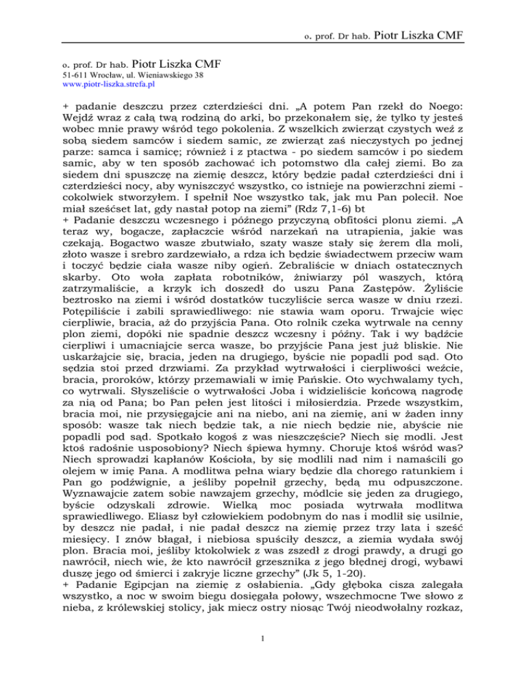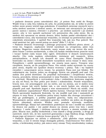 o. prof. Dr hab. Piotr Liszka CMF o. prof. Dr hab. Piotr Liszka CMF 51-611 Wrocław, ul. Wieniawskiego 38 www.piotr-liszka.strefa.pl + padanie deszczu przez czterdzieści dni. „A potem Pan rzekł do Noego: Wejdź wraz z całą twą rodziną do arki, bo przekonałem się, że tylko ty jesteś wobec mnie prawy wśród tego pokolenia. Z wszelkich zwierząt czystych weź z sobą siedem samców i siedem samic, ze zwierząt zaś nieczystych po jednej parze: samca i samicę; również i z ptactwa - po siedem samców i po siedem samic, aby w ten sposób zachować ich potomstwo dla całej ziemi. Bo za siedem dni spuszczę na ziemię deszcz, który będzie padał czterdzieści dni i czterdzieści nocy, aby wyniszczyć wszystko, co istnieje na powierzchni ziemi cokolwiek stworzyłem. I spełnił Noe wszystko tak, jak mu Pan polecił. Noe miał sześćset lat, gdy nastał potop na ziemi” (Rdz 7,1-6) bt + Padanie deszczu wczesnego i późnego przyczyną obfitości plonu ziemi. „A teraz wy, bogacze, zapłaczcie wśród narzekań na utrapienia, jakie was czekają. Bogactwo wasze zbutwiało, szaty wasze stały się żerem dla moli, złoto wasze i srebro zardzewiało, a rdza ich będzie świadectwem przeciw wam i toczyć będzie ciała wasze niby ogień. Zebraliście w dniach ostatecznych skarby. Oto woła zapłata robotników, żniwiarzy pól waszych, którą zatrzymaliście, a krzyk ich doszedł do uszu Pana Zastępów. Żyliście beztrosko na ziemi i wśród dostatków tuczyliście serca wasze w dniu rzezi. Potępiliście i zabili sprawiedliwego: nie stawia wam oporu. Trwajcie więc cierpliwie, bracia, aż do przyjścia Pana. Oto rolnik czeka wytrwale na cenny plon ziemi, dopóki nie spadnie deszcz wczesny i późny. Tak i wy bądźcie cierpliwi i umacniajcie serca wasze, bo przyjście Pana jest już bliskie. Nie uskarżajcie się, bracia, jeden na drugiego, byście nie popadli pod sąd. Oto sędzia stoi przed drzwiami. Za przykład wytrwałości i cierpliwości weźcie, bracia, proroków, którzy przemawiali w imię Pańskie. Oto wychwalamy tych, co wytrwali. Słyszeliście o wytrwałości Joba i widzieliście końcową nagrodę za nią od Pana; bo Pan pełen jest litości i miłosierdzia. Przede wszystkim, bracia moi, nie przysięgajcie ani na niebo, ani na ziemię, ani w żaden inny sposób: wasze tak niech będzie tak, a nie niech będzie nie, abyście nie popadli pod sąd. Spotkało kogoś z was nieszczęście? Niech się modli. Jest ktoś radośnie usposobiony? Niech śpiewa hymny. Choruje ktoś wśród was? Niech sprowadzi kapłanów Kościoła, by się modlili nad nim i namaścili go olejem w imię Pana. A modlitwa pełna wiary będzie dla chorego ratunkiem i Pan go podźwignie, a jeśliby popełnił grzechy, będą mu odpuszczone. Wyznawajcie zatem sobie nawzajem grzechy, módlcie się jeden za drugiego, byście odzyskali zdrowie. Wielką moc posiada wytrwała modlitwa sprawiedliwego. Eliasz był człowiekiem podobnym do nas i modlił się usilnie, by deszcz nie padał, i nie padał deszcz na ziemię przez trzy lata i sześć miesięcy. I znów błagał, i niebiosa spuściły deszcz, a ziemia wydała swój plon. Bracia moi, jeśliby ktokolwiek z was zszedł z drogi prawdy, a drugi go nawrócił, niech wie, że kto nawrócił grzesznika z jego błędnej drogi, wybawi duszę jego od śmierci i zakryje liczne grzechy” (Jk 5, 1-20). + Padanie Egipcjan na ziemię z osłabienia. „Gdy głęboka cisza zalegała wszystko, a noc w swoim biegu dosięgała połowy, wszechmocne Twe słowo z nieba, z królewskiej stolicy, jak miecz ostry niosąc Twój nieodwołalny rozkaz, 1 o. prof. Dr hab. Piotr Liszka CMF jak srogi wojownik runęło pośrodku zatraconej ziemi. I stanąwszy, napełniło wszystko śmiercią: nieba sięgało i rozchodziło się po ziemi. I zaraz zaczęły ich trapić straszne senne widziadła, i opadła ich trwoga nieoczekiwana. A padając każdy gdzie indziej na wpół umarły, wyjawiał przyczynę, dla której umierali: trapiące ich sny uprzedziły ich o tym, by nie ginęli w nieświadomości, czemu strasznie cierpią. Także na sprawiedliwych przyszła próba śmierci, doszło na pustyni do zagłady wielu, ale gniew ten nie był długotrwały. Spiesznie bowiem wystąpił w obronie Mąż Nienaganny, niosąc broń swojej posługi: modlitwę i przebłagalną ofiarę kadzielną. Stawił czoło gniewowi, położył kres klęsce, okazawszy, że Twoim jest sługą. Przezwyciężył on gniew nie siłą ciała, nie mocą oręża, lecz słowem pokonał Karzącego, przypominając dane ojcom obietnice i przymierza. Gdy umarli już padali gromadnie na siebie, stanął pośrodku i położył kres zapalczywości i przeciął jej drogę do żywych. Bo cały świat był na długiej jego szacie, chwalebne imiona ojców wyryte na czterech rzędach kamieni i na diademie jego głowy Twoja wspaniałość. Przed nimi to ustąpił, ich uląkł się Niszczyciel, dosyć bowiem było samej próby gniewu” (Mdr 18, 14-25). + Padanie kropli deszczu na powierzchnię okrągłej Ziemi. „mało kto wie, iż uczeni średniowiecza przedstawiali graficznie mechanizm zaćmień Słońca i Księżyca w sposób nieodbiegający od znanego nam dzisiaj oraz że szkicowali wyjaśnienia problemu chodzenia człowieka po kulistej Ziemi”/. „Takie podejście do historii jest tym bardziej dziwne, kiedy uświadomimy sobie, że nie brakuje w literaturze znakomitych zbiorów stosownych materiałów na ten temat. Warto wskazać choćby książkę Barbary Obrist, La cosmologie médièvale: textes et immages, t. I: Les fondements antiques, Firenze 2004. Książka ta zawiera 118 reprodukcji dokumentujących poziom nauki starożytnej i średniowiecznej, w tym ilustracje z wczesnego średniowiecza chrześcijańskiego. Na przykład rysunek 33 to szkic zaćmienia Słońca z IX w., przedstawiający pozycje w przestrzeni trzech ciał: Terra, Sol, Luna. Zaznaczono tam umbra terrae, czyli cień rzucany przez Ziemię w przestrzeń kos