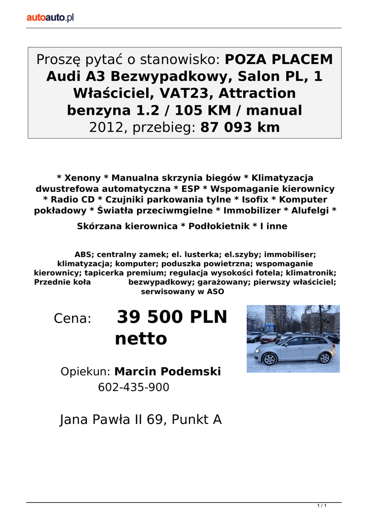 Proszę pytać o stanowisko: POZA PLACEM Audi A3 Bezwypadkowy, Salon PL, 1 Właściciel, VAT23, Attraction benzyna 1.2 / 105 KM / manual 2012, przebieg: 87 093 km * Xenony * Manualna skrzynia biegów * Klimatyzacja dwustrefowa automatyczna * ESP * Wspomaganie kierownicy * Radio CD * Czujniki parkowania tylne * Isofix * Komputer pokładowy * Światła przeciwmgielne * Immobilizer * Alufelgi * Skórzana kierownica * Podłokietnik * I inne ABS; centralny zamek; el. lusterka; el.szyby; immobiliser; klimatyzacja; komputer; poduszka powietrzna; wspomaganie kierownicy; tapicerka premium; regulacja wysokości fotela; klimatronik; Przednie koła bezwypadkowy; garażowany; pierwszy właściciel; serwisowany w ASO Cena: 39 500 PLN netto Opiekun: Marcin Podemski 602-435-900 Jana Pawła II 69, Punkt A 1/1
