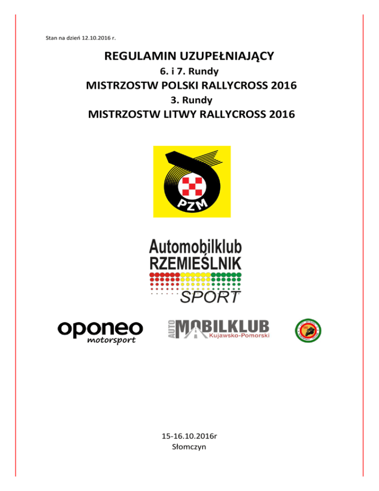 Stan na dzień 12.10.2016 r. REGULAMIN UZUPEŁNIAJĄCY 6. i 7. Rundy MISTRZOSTW POLSKI RALLYCROSS 2016 3. Rundy MISTRZOSTW LITWY RALLYCROSS 2016 15-16.10.2016r Słomczyn I. ZAWODY I ORGANIZATOR 1. Zawody stanowią 6. i 7. rundę Mistrzostw Polski Rallycross (zwane dalej MPRC), oraz 3. rundę Mistrzostw Litwy Rallycross (zwana dalej MLR). 2. Niniejsze zawody organizowane są na podstawie : ZAWODY ZORGANIZOWANE ZGODNIE Z MIĘDZYNARODOWYM KODEKSEM SPORTOWYM FIA I JEGO ZAŁĄCZNIKAMI ORAZ REGULAMINEM KRAJOWYM SPORTU SAMOCHODOWEGO PZM, A W TYM: 3. Międzynarodowego Kodeksu Sportu Samochodowego FIA wraz z załącznikami; Regulaminu Mistrzostw Polski Rallycross; Regulaminu Mistrzostw Litwy 2016 Komunikatów GKSS PZM 2016; Regulaminu Ochrony Środowiska w Sportach Motorowych; Regulaminu Medycznego PZM; Niniejszego Regulaminu Uzupełniającego; Podmiotem posiadającym wyłączne prawa do organizacji Mistrzostw Polski Rallycross 2016 jest: Automobilklub Rzemieślnik ul. Żytnia nr 46 01-198 Warszawa tel. +48 22 632 81 49 www.ak-rzemieslnik.pl 4. Organizatorem zawodów jest: Automobilklub Rzemieślnik ul. Żytnia nr 46 01-198 Warszawa tel. +48 22 632 81 49 www.ak-rzemieslnik.pl Współorganizatorzy: OPONEO Motorsport Automobilklub Kujawsko-Pomorski ul. Łucka nr 7 ul. Białogardzka nr 7 85-185 Bydgoszcz 85-808 Bydgoszcz tel. +48 500 867 659 tel. +48 791 777 111 www.rallycross.com.pl www.akkp.pl przy współpracy z: LKT"Wyczół"Gościeradz 86-011 Wtelno tel. +48 604 112 025 Oficjalna strona internetowa zawodów: www.ak-rzemieslnik.pl 5. Termin zawodów: 14-16 września 2016 roku 6. Miejsce rozgrywania zawodów: Autodrom Słomczyn Słomczyn 66, 05-600 Grójec 7. Miejsce rozgrywania zawodów: TOR SŁOMCZYN Słomczyn 66, 05-600 Grójec 8. Wiza PZM: RC/6-7/BSPZM/160914 II. WŁADZE ZAWODÓW Zespół Sędziów Sportowych Przewodniczący Krzysztof Studziński I-003/12 tel. 791 777 111 Członek Janusz Zdrojewski I-108/12 tel. 660 506 007 Członek Jakub Mroczkowski I-019/12 tel. 501 235 694 Obserwator GKSS Krzysztof Studziński I-003/12 tel. 791 777 111 Delegat techniczny GKSS Krzysztof Szeszko I-432/12 tel. 502 245 960 Dyrektor zawodów Mirosław Urbaczewski I-560/13 tel. 606 911 003 Dyrektor wyścigu Radosław Chrzanowski I-468/12 tel. 509 335 533 Kierownik zabezpieczenia i trasy Paweł Krupiński I-145/12 tel. 602 651 465 Kierownik BK Michał Wierzbicki I-006/12 tel. 508 344 335 Kierownik chronometrażu Miłosz Ostrowski 02/15/CH Kierownik biura zawodów Monika Miałkowska Tel. 660 718 543 Osoba do spraw kontaktu Marta Kobus II - 02003 tel. 724 402 476 z zawodnikami Komisarz do spraw ochrony Maria Szumiło 296/2016/S Środowiska Lekarz zawodów Dr. Łukasz Martyniuk Tel. 691 378 474 Pełna lista obsady sędziowskiej zostanie zweryfikowana i zatwierdzona przez GKSS PZM na 48 godzin przed badaniem kontrolnym i potwierdzona przez zespół sędziów sportowych po odbiorze administracyjnym. III. PROGRAM ZAWODÓW Piątek (14.10.2016): ▪ 15:00 Otwarcie Biura Zawodów ▪ 15:00 Otwarcie Parku Maszyn ▪ 15:00 – 21:00 Odbiór Administracyjny ▪ 16:00 – 21:00 Badanie Kontrolne Sobota (15.10.2016): ▪ 07:30 Otwarcie Biura Zawodów i odbiór administracyjny ▪ 07:35 – 08:30 Badanie Kontrolne (za zgodą Dyrektora Zawodów) ▪ 08:45 I posiedzenie ZSS ▪ 09:05 Odprawa z zawodnikami ▪ 09:30 - 10:00 Trening Wolny ▪ 10:05 II posiedzenie ZSS ▪ 10:30 Biegi Kwalifikacyjne ▪ 15:30 III posiedzenie ZSS ▪ 15:40 Półfinały A, B ▪ 5 min. po półfinałach – IV posiedzenie ZSS ▪ 16:30 Finały ▪ 5 min. po finałach V posiedzenie ZSS ▪ 17:30 wręczenie nagród ▪ 18:00 - 20:00 BK 1 tylko dla 7 rundy MPRC Niedziela (16.10.2016): ▪ 08:00 Otwarcie Biura Zawodów i odbiór administracyjny 8 rundy ▪ 08:05 – 08:30 Badanie Kontrolne (za zgodą Dyrektora Zawodów) ▪ 08:45 I posiedzenie ZSS ▪ 09:05 Odprawa z zawodnikami ▪ 09:30 - 10.00 Trening Wolny ▪ 10:05 II posiedzenie ZSS ▪ 10:30 Biegi Kwalifikacyjne ▪ 15:30 III posiedzenie ZSS ▪ 15:40 Półfinały A, B ▪ 5 min. po półfinałach – IV posiedzenie ZSS ▪ 16:30 Finały ▪ 5 min. po finałach V posiedzenie ZSS ▪ 17:30 Wręczenie nagród ▪ 30 min po wręczeniu nagród - zamknięcie Biura Zawodów. IV. POSTANOWIENIA OGÓLNE 1. Wszystkich zawodników/kierowców obowiązuje całkowity zakaz treningów na torze poza wyznaczonymi godzinami, jak również na terenie dróg dojazdowych i parku maszyn, pod rygorem kar finansowych oraz kar do wykluczenia z zawodów włącznie. 2. Treningi wolne zostaną zorganizowane wg harmonogramu zawodów. Będą miały formę wyjazdu na 3 okrążenia toru. W czasie przeznaczonym na trening wolny, ilość wyjazdów dowolna. 3. Zgłoszenia 3.1. Procedura zgłoszeń dla posiadaczy licencji PZM - zgodnie z Art. 7 Regulaminu Mistrzostw Polski Rallycross 2016. Dla posiadaczy licencji PZM zgłoszenie wypełniane i wysyłane jest wyłącznie poprzez stronę internetową http://inside.pzm.pl/ 3.2. Procedura zgłoszeń dla posiadaczy licencji wydanej przez inny ASN. Formularz zgłoszenia wypełnia zawodnik stronę internetową systemu zgłoszeń on-line PZM http://zgloszenia.pzm.pl . Po prawidłowym wypełnieniu, dołączeniu potwierdzenia wpłaty wpisowego i zatwierdzeniu, zgłoszenie zostanie automatycznie wysłane pocztą elektroniczną do organizatora zawodów i do zawodnika na wskazany przez niego w formularzu adres email. 3.3. Zgłoszenie zostanie przyjęte tylko w przypadku, gdy towarzyszyć mu będzie potwierdzenie wpłaty pełnej kwoty wpisowego. 4. Terminy zgłoszeń: I termin zgłoszeń (z obniżoną kwotą wpisowego) upływa z dniem: 30.09.2016 r. II termin zgłoszeń (z normalną kwotą wpisowego) upływa z dniem: 07.10.2016 r. 5. Wpisowe Przy zgłoszeniu do jednej rundy: MPRC Wysokość wpisowego w I terminie zgłoszeń 500 PLN Wysokość wpisowego w II terminie zgłoszeń: 750 PLN MLR: Wysokość wpisowego w I terminie zgłoszeń 100 euro Wysokość wpisowego w II terminie zgłoszeń 150 euro Pr