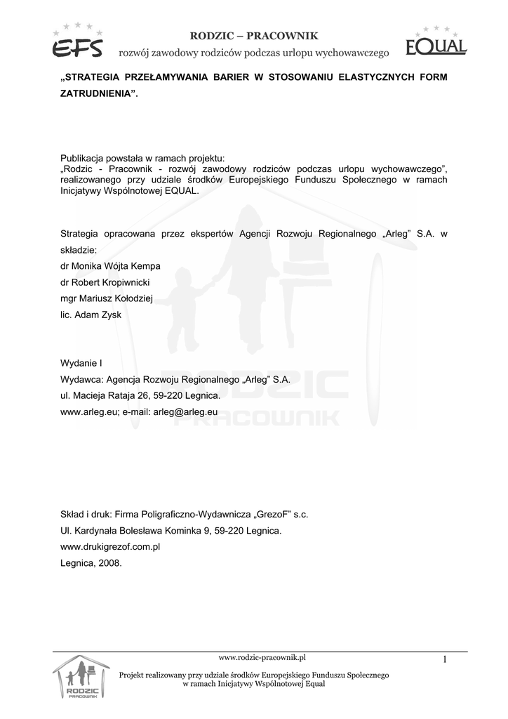 RODZIC – PRACOWNIK rozwój zawodowy rodziców podczas urlopu wychowawczego „STRATEGIA PRZEŁAMYWANIA BARIER W STOSOWANIU ELASTYCZNYCH FORM ZATRUDNIENIA”. Publikacja powstała w ramach projektu: „Rodzic - Pracownik - rozwój zawodowy rodziców podczas urlopu wychowawczego”, realizowanego przy udziale środków Europejskiego Funduszu Społecznego w ramach Inicjatywy Wspólnotowej EQUAL. Strategia opracowana przez ekspertów Agencji Rozwoju Regionalnego „Arleg” S.A. w składzie: dr Monika Wójta Kempa dr Robert Kropiwnicki mgr Mariusz Kołodziej lic. Adam Zysk Wydanie I Wydawca: Agencja Rozwoju Regionalnego „Arleg” S.A. ul. Macieja Rataja 26, 59-220 Legnica. www.arleg.eu; e-mail: [email protected] Skład i druk: Firma Poligraficzno-Wydawnicza „GrezoF” s.c. Ul. Kardynała Bolesława Kominka 9, 59-220 Legnica. www.drukigrezof.com.pl Legnica, 2008. www.rodzic-pracownik.pl Projekt realizowany przy udziale środków Europejskiego Funduszu Społecznego w ramach Inicjatywy Wspólnotowej Equal 1 RODZIC – PRACOWNIK rozwój zawodowy rodziców podczas urlopu wychowawczego Spis treści: Wstęp.......................................................................................................................................3 1. Definicje i sposoby rozumienia elastyczności. ...............................................................5 2. Elastyczne Formy Zatrudnienia w świetle danych statystycznych. ..............................8 2.1. Zatrudnienie w niepełnym wymiarze czasu pracy......................................................... 10 2.2. Porównania międzynarodowe ....................................................................................... 11 2.3. Inne formy pracy elastycznej......................................................................................... 13 3. Cele strategii.....................................................................................................................15 4. Wdrażanie Elastycznych Form Zatrudnienia. ................................................................16 4.1. Proces podejmowania decyzji w organizacji. ............................................................... 16 4.2. Proces podejmowania decyzji przez pracownika.......................................................... 19 5. Bariery i sposoby ich pokonywania. ..............................................................................21 Podsumowanie .....................................................................................................................32 Literatura:..............................................................................................................................34 www.rodzic-pracownik.pl Projekt realizowany przy udziale środków Europejskiego Funduszu Społecznego w ramach Inicjatywy Wspólnotowej Equal 2 RODZIC – PRACOWNIK rozwój zawodowy rodziców podczas urlopu wychowawczego Wstęp Rzeczywistość gospodarcza wymusza, aby na rynek pracy patrzeć inaczej, niż dotychczas. Dzięki globalizacji, rewolucji informacyjnej oraz nowoczesnej technologii, praca przekroczyła tradycyjne granice czasu oraz miejsca. Ten postęp cywilizacyjny umożliwił rozwój nowych, nietypowych form zatrudnienia takich jak niepełny wymiar czasu pracy, elastyczny czas pracy, telepraca, Job-sharing (dzielenie etatu) itd. Wraz ze zmianami gospodarczymi w ostatnich kilkunastu latach w świadomości społecznej nie zaszły prawie żadne istotne zmiany w tym obszarze. Większość Polaków z przywiązaniem do jednego miejsca pracy i stałego wynagrodzenia jest niedostosowana do konkurencyjnego rynku pracy. Z kolei rodzimi pracodawcy nie są świadomi związków i zależności między elastycznymi sposobami organizowania pracy a sposobami godzenia życia zawodowego z rodzinnym, owocującym mierzalnymi korzyściami ekonomicznymi. W ostatnich dziesięciu latach w Europie znacznie wrosło zastosowanie niekonwencjonalnej organizacji pracy. Jednym z wyników wzrostu popularności tej formy zatrudniania jest niniejsza strategia, która stanowi jeden z rezultatów projektu „Rodzic – Pracownik rozwój rodziców podczas urlopu wychowawczego” realizowanego ze środków Europejskiego Funduszu Społecznego w ramach Inicjatywy Wspólnotowej EQUAL. Celem tego projektu jest wzrost możliwości godzenia życia zawodowego z życiem rodzinnym poprzez stosowanie elastycznych form i zasad pracy na odległość osób przebywających na urlopie wychowawczym. Strategia skupia się na stereotypach stwarzających bariery w stosowaniu Elastycznych Form Zatrudnienia oraz na sposobach rozwiązywania tych problemów czasami w bardzo banalny sposób, potwierdzając naturę stereotypów polegającą na tym, iż zazwyczaj nie mają odniesienia w rzeczywistości. Strategia składa się z następujących pięciu rozdziałów tematycznych: 1. Definicje i sposoby rozumienia elastyczności. 2. Elastyczne Formy Zatrudnienia w świetle danych statystycznych. 3. Wdrażanie Elastycznych Form Zatrudnienia. 4. Bariery i sposoby ich pokonywania. 5. Podsumowanie. Strategia w zamierzeniu autorów posłużyć ma jako przewodnik i inspiracja dla osób chcących zdobyć lub poszerzyć wiedzę na temat nowych trendów w zakresie organizacji pracy w kontekście łączenia życia zawodowego z rodzinnym. www.rodzic-pracownik.pl Projekt realizowany przy udziale środków Europejskiego Funduszu Społecznego w ramach Inicjatywy Wspólnotowej Equal 3 RODZIC – PRACOWNIK rozwój zawodowy rodziców podczas urlopu wychowawczego Niniejsza strategia być może nie rozwieje wszystkich wątpliwości nurtujących czytelników wątpliwości nurtujące czytelników, ale może stanowić istotną podstawę do dalszego zgłębiania tematu. Zapoznając się z niniejszą strategią należy pamiętać, że nie wszystkie rozwiązania są możliwe do zastosowania w każdym zakładzie pracy i nie ze wszystkich może korzystać każdy pracownik. www.rodzic-pracownik.pl Projekt realizowany przy 