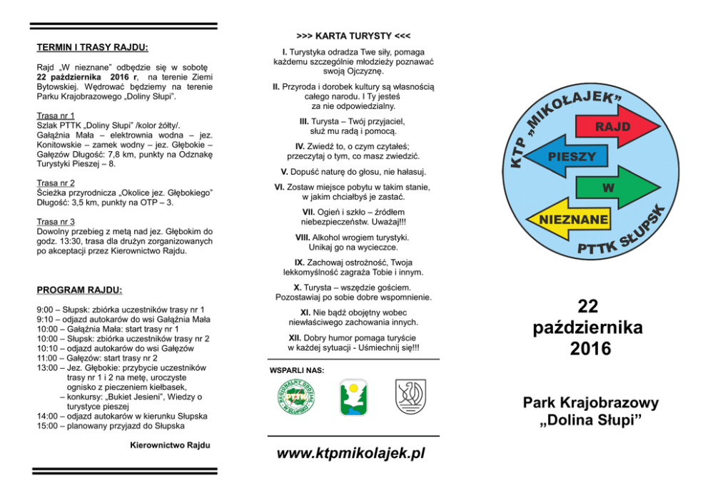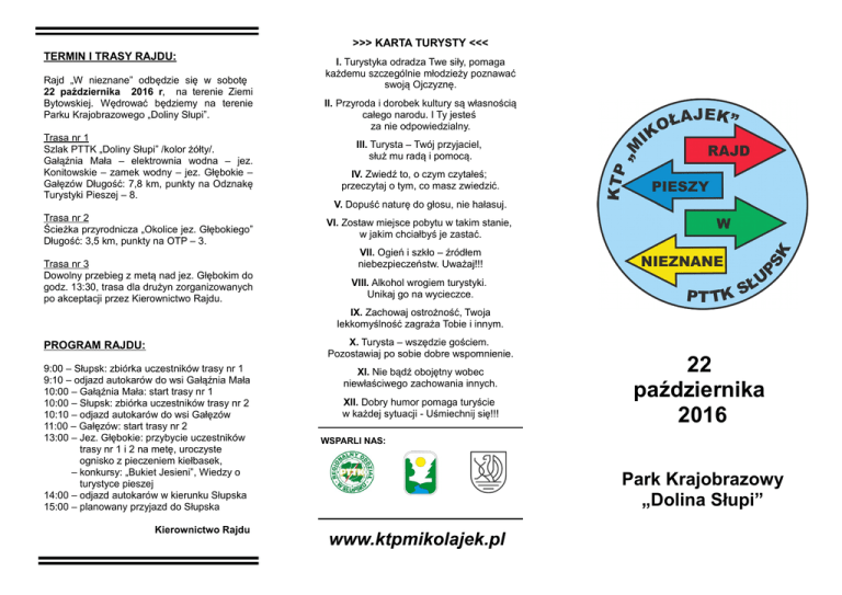 >>> KARTA TURYSTY <<< TERMIN I TRASY RAJDU: Rajd „W nieznane” odbędzie się w sobotę 22 października 2016 r, na terenie Ziemi Bytowskiej. Wędrować będziemy na terenie Parku Krajobrazowego „Doliny Słupi”. Trasa nr 1 Szlak PTTK „Doliny Słupi” /kolor żółty/. Gałąźnia Mała – elektrownia wodna – jez. Konitowskie – zamek wodny – jez. Głębokie – Gałęzów Długość: 7,8 km, punkty na Odznakę Turystyki Pieszej – 8. Trasa nr 2 Ścieżka przyrodnicza „Okolice jez. Głębokiego” Długość: 3,5 km, punkty na OTP – 3. Trasa nr 3 Dowolny przebieg z metą nad jez. Głębokim do godz. 13:30, trasa dla drużyn zorganizowanych po akceptacji przez Kierownictwo Rajdu. I. Turystyka odradza Twe siły, pomaga każdemu szczególnie młodzieży poznawać swoją Ojczyznę. II. Przyroda i dorobek kultury są własnością całego narodu. I Ty jesteś za nie odpowiedzialny. III. Turysta – Twój przyjaciel, służ mu radą i pomocą. IV. Zwiedź to, o czym czytałeś; przeczytaj o tym, co masz zwiedzić. V. Dopuść naturę do głosu, nie hałasuj. VI. Zostaw miejsce pobytu w takim stanie, w jakim chciałbyś je zastać. VII. Ogień i szkło – źródłem niebezpieczeństw. Uważaj!!! VIII. Alkohol wrogiem turystyki. Unikaj go na wycieczce. IX. Zachowaj ostrożność, Twoja lekkomyślność zagraża Tobie i innym. X. Turysta – wszędzie gościem. Pozostawiaj po sobie dobre wspomnienie. PROGRAM RAJDU: 9:00 – Słupsk: zbiórka uczestników trasy nr 1 9:10 – odjazd autokarów do wsi Gałąźnia Mała 10:00 – Gałąźnia Mała: start trasy nr 1 10:00 – Słupsk: zbiórka uczestników trasy nr 2 10:10 – odjazd autokarów do wsi Gałęzów 11:00 – Gałęzów: start trasy nr 2 13:00 – Jez. Głębokie: przybycie uczestników trasy nr 1 i 2 na metę, uroczyste ognisko z pieczeniem kiełbasek, – konkursy: „Bukiet Jesieni”, Wiedzy o turystyce pieszej 14:00 – odjazd autokarów w kierunku Słupska 15:00 – planowany przyjazd do Słupska Kierownictwo Rajdu XI. Nie bądź obojętny wobec niewłaściwego zachowania innych. XII. Dobry humor pomaga turyście w każdej sytuacji - Uśmiechnij się!!! 22 października 2016 WSPARLI NAS: Park Krajobrazowy „Dolina Słupi” www.ktpmikolajek.pl REGULAMIN RAJDU W NIEZNANE 1968 – 2016 CELE RAJDU: - Promocja turystycznych, krajoznawczych i przyrodniczych walorów Ziemi Bytowskiej. - Propagowanie turystyki kwalifikowanej jako formy czynnego wypoczynku. - Zdobywanie odznak: turystyki pieszej, regionalnych oraz krajoznawczych. ORGANIZATOR: Polskie Towarzystwo Turystyczno - Krajoznawcze Klub Turystów Pieszych „Mikołajek” 76-200 Słupsk, ul. Szarych Szeregów 1 [email protected] www.ktpmikolajek.pl KIEROWNICTWO RAJDU: Komendant Rajdu - Jacek Grabowski Kierownicy tras - T1 Karol Piekac - T2 Artur Szwabowicz Sekretariat - Łukasz Marszałek Kwatermistrz - Zenon Frąckiewicz Obsługa imprezy - Marta Szynszecka WARUNKI UCZESTNICTWA: PRAWA UCZESTNIKÓW: W rajdzie mogą uczestniczyć turyści indywidualni lub zorganizowane drużyny, zgłoszone przez jednostki PTTK, organizacje społeczne i młodzieżowe, instytucje oraz szkoły. Opiekunowie drużyn biorą udział nieodpłatnie w składzie 1 opiekun na 10 osób. Dzieci i młodzież do lat 17-tu może brać udział w rajdzie jedynie pod opieką osoby pełnoletniej. PRZYJMOWANIE ZGŁOSZEŃ: Zgłoszenia na kartach zgłoszeń przyjmuje do dnia 19.10.2016 roku Biuro Zarządu Regionalnego Oddziału PTTK w Słupsku, ul. Szarych Szeregów 1 – tel. 59 842 5012, tel./fax. 59 842 2902. Wraz ze zgłoszeniem należy wpłacić wpisowe. Wysokość wpisowego: po terminie: PTTK 4 zł Pozostali uczestnicy 8 zł Dopłata za transport * 16 zł 10 zł 20 zł Istnieje możliwość zorganizowania transportu z innego miejsca jak Słupsk, więcej informacji u Organizatora. Zgłoszenia po terminie przyjmowane będą jedynie w przypadku wolnych miejsc oraz bez gwarancji zabezpieczenia pełnych świadczeń. Wymienione wyżej wpisowe można również wpłacić na konto numer: 80-1540-1098-20085550-4931-0001 z dopiskiem „W nieznane”. Uczestnicy w ramach wpisowego otrzymują: o pamiątkowy znaczek rajdowy, o przygotowane ognisko, o kiełbaska do pieczenia z chlebem, o materiały krajoznawcze dla opiekunów drużyn, o możliwość zdobycia nagród w konkursach, o transport autokarem*, o odcisk pamiątkowej pieczęci, o potwierdzenie punktów na: Odznaki Turystyki Pieszej i Krajoznawcze. OBOWIĄZKI UCZESTNIKÓW: Uczestnicy zobowiązani są stawić się na start w oznaczonym terminie i czasie, przestrzegać postanowień Karty Turysty, stosować się do zarządzeń kierownictwa rajdu, posiadać niezbędny turyście pieszemu sprzęt i ekwipunek do wędrówki w każdych warunkach atmosferycznych oraz dokument tożsamości i dokument uprawniający do zniżki. POSTANOWIENIA KOŃCOWE: Rajd odbywa się bez względu na warunki atmosferyczne. Uczestnicy biorą udział w rajdzie na własny koszt i ryzyko. Członkowie PTTK z aktualnie opłaconą składką za 2016 rok są ubezpieczeni od następstw nieszczęśliwych wypadków NNW, natomiast pozostali uczestnicy ubezpieczają się we własnym zakresie. Wpisowe w razie nie zgłoszenia się na rajd nie podlega zwrotowi. Organizatorzy zastrzegają sobie prawo do interpretacji niniejszego regulaminu.