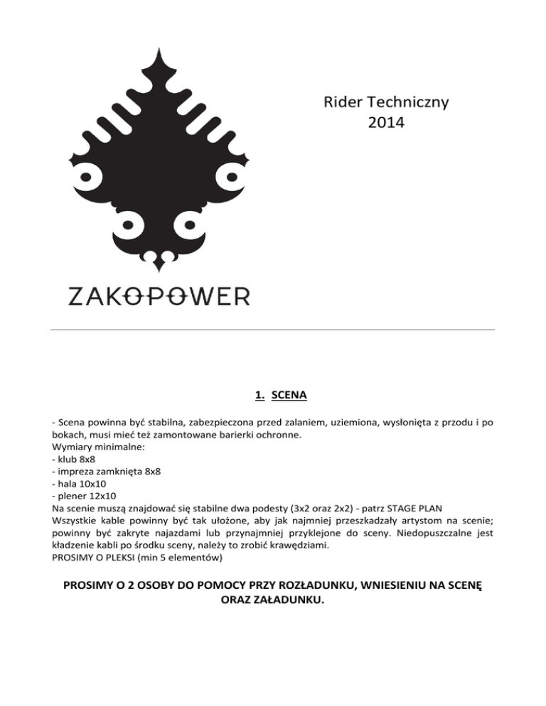 Rider Techniczny 2014 1. SCENA - Scena powinna być stabilna, zabezpieczona przed zalaniem, uziemiona, wysłonięta z przodu i po bokach, musi mieć też zamontowane barierki ochronne. Wymiary minimalne: - klub 8x8 - impreza zamknięta 8x8 - hala 10x10 - plener 12x10 Na scenie muszą znajdować się stabilne dwa podesty (3x2 oraz 2x2) - patrz STAGE PLAN Wszystkie kable powinny być tak ułożone, aby jak najmniej przeszkadzały artystom na scenie; powinny być zakryte najazdami lub przynajmniej przyklejone do sceny. Niedopuszczalne jest kładzenie kabli po środku sceny, należy to zrobić krawędziami. PROSIMY O PLEKSI (min 5 elementów) PROSIMY O 2 OSOBY DO POMOCY PRZY ROZŁADUNKU, WNIESIENIU NA SCENĘ ORAZ ZAŁADUNKU. Zakopower_RiderTechniczny_v01.2014 2. GARDEROBA i CATERING Pomieszczenie wyłącznie dla Zakopower zamknięte przygotowane dla 17 osób, suche, zamykane, możliwie blisko sceny. WYPOSAŻENIE: - światło - gniazdko 230V - 18 krzeseł - 18 szklanek - duży stół - lustro z oświetleniem - ręczniki papierowe, kosz na śmieci - ręczniki bawełniane (5 sztuk) - dostęp do łazienki z toaletą zaopatrzoną w mydło, papier toaletowy CATERING: - 4l. wody mineralnej niegazowanej - 1l. wody mineralnej gazowanej - 4l. soków (jabłkowy 2l., pomarańczowy 1l., pomidorowy 1l.) - 8l coca-cola, sprite - napoje izotoniczne - 6 puszek/butelek (isostar, powerade), - napoje energetyczne - 12 puszek (green up, red bull, tiger) - 3 butelki wina białego wytrawnego - 2 butelki wina czerwonego wytrawnego (korkociąg) - 8 piw - 1l. whiskey, - 1l. wódki - kawa, herbata, cukier, mleko, cytryna - 17 szklanek - 17 porcji obiadowych (w tym 9 wegetariańskich + 1 wegańskie) / przekąski, kanapki, owoce Napoje alkoholowe bardzo proszę wystawić na godzinę przed koncertem Dodatkowo 15 butelek 0,5l. wody mineralnej niegazowanej na scenie 3. NAGŁOŚNIENIE Zespół Zakopower przyjeżdża z własnymi realizatorami dźwięku (FOH, MON). System powienien być w pełni sprawny i przygotowany przed przyjazdem zespołu. Stół monitorowy jest niezbędny. NAGŁOŚNIENIE F.O.H. Cała aparatura niezależnie od miejsca koncertu musi być systemem stereo o minimum trójdrożnym aktywnym podziale pasm. System musi pokrywać całą nagłaśnianą powierzchnię pełnym pasmem. Aparatura wolna od przydźwięków, szumów, etc. Obie strony systemu muszą grać identycznie. Przy dużych scenach wymagany jest dodatkowo pełnopasmowy frontfill. W przypadku dużych powierzchni prosimy o postawienie dodatkowych stref, outfilla, etc. Do ustalenia w kontakcie telefonicznym z realizatorem M.O.N. nie później niż 5 dni przed koncertem. Preferowane systemy: l'acoustics, Meyer, d&b, Turbosound, EAW, Adamson. Nie gramy na aparaturach domowej roboty, kopiowanych z oryginałów. KONSOLETA F.O.H. Mikser umieszczony centralnie w osi sceny. Kategorycznie niedopuszczalne jest umieszczanie konsolety pod balkonami, na balkonach, z boku lub w pomieszczeniach odseparowanych. Mikser powinien być umieszczony na podeście o wysokości min 50cm. Preferowane miksery: Yamaha PM5D RH, Soundcraft VI6/VI4, Midas PRO6, Digi Design Profile/Venue/SC48 2 Zakopower_RiderTechniczny_v01.2014 KAŻDA INNA KONSOLETA CYFROWA NIE WYMIENIONA POWYŻEJ MUSI BYĆ SKONSULTOWANA I ZAAKCEPTOWANA PRZEZ REALIZATORA F.O.H. INNE Niezbędna jest komunikacja F.O.H. - MON, CD, oświetlenie, Talk Back, możliwość wpięcia iPod'a/laptopa. KONSOLETA MON Mikser umieszczony na poziomie sceny koniecznie po stronie wejścia na scenę. Realizator musi mieć swobodny dostęp do sceny oraz dobry kontakt wzrokowy ze wszystkimi muzykami. Preferowane miksery: Yamaha PM5D-RH/M7CL/CL5, Soundcraft VI6/VI4/VI1 DigiDesign Profile/SC48 - (prosimy o najnowsze oprogramowanie) Preferowane wedge: d&b max, EAW SM12, Meyer MJF-212, l'acoustics 115XT KAŻDA INNA KONSOLETA CYFROWA NIE WYMIENIONA POWYŻEJ MUSI BYĆ SKONSULTOWANA I ZAAKCEPTOWANA PRZEZ REALIZATORA MON. INNE Dodatkowo prosimy o: statyw pod antenę, 4 gniazdka 230V, mile widziany router przy stołach, które można obsługiwać z iPada. MIXY WYJŚCIE RODZAJ OPIS 1 IEM Własny 2 IEM Własny 3 IEM Własny 4 IEM Własny 5 IEM Własny 6 IEM Własny 7 LINIA Klawisz 8 LINIA Bębny 9 SUB BAS 1x18" 10 IEM Własny 11 WEDGE 2x (2x15" + 1") UWAGI Mile widziany Bi-Amp 3 Zakopower_RiderTechniczny_v01.2014 INPUT Lista WLOT INSTRUMENT MIKROFON UWAGI 1 2 3 4 5 6 7 8 9 10 11 12 13 14 15 16 17 18 19 20 21 22 23 24 25 26 27 28 29 30 31 32 Stopa Stopa Werbel góra Werbel dół Hi-Hat Tom Floor Tom Over Head L Over Head R Bass Gitara Gitara Fujara słowacka Koza Klawisz L Klawisz R Trąbka FX Trąbka Altówka Skrzypce Skrzypce FX Basy Podhalańskie Skrzypce Vocal Vocal (main) Vocal Vocal Vocal Vocal Vocal Zapas Metronom Audix D6, EV 868, Beta 52 SM 91, e901 SM57, Beta 57 SM57 SM 81, Rode NT-5, ATM 33a beta 98 beta 98 AT 2020, C414 AT 2020, C414 D.I. (Radial) sennheiser e906 SM57 ATM350 SM57 XLR XLR D.I. (Radial) ATM 350 XLR XLR XLR XLR XLR SM58 - własny SM58 UR (wireless) - własny SM58 - własny SM58 - własny SM58 SM58 SM58 SM58 Wireless D.I. + jack-jack Mały statyw na statywie na statywie Statyw Statyw Mały statyw Mały statyw Mały statyw własny system bezprzewodowy własny system bezprzewodowy Sygnal z podłogi - patrz stage plan własny system bezprzewodowy własny system bezprzewodowy Statyw STATYW WIDLICKI!!! Statyw Statyw Statyw Statyw Statyw tylko MON 4 Zakopower_RiderTechniczny_v01.2014 5 Zakopower_RiderTechniczny_v01.2014 4. OŚWIETLENIE I MULTIMEDIA Zestawienie sprzętu oświetleniowego GRAND MA 1 FULL SIZE / LIGHT ROBE ROBIN 600 SPOT /ROBE COLORSPOT 700 / MARTIN MAC 700 / CP 700 HPE CP ALPHA BEAM 300 ROBE ROBIN 600 WASH / JB LIGHTING A7 ZOOM SUNSTRIP ACTIVE MARTIN ATOMIC 3000 4 – LITE PUBLIC BLINDER ZR 24\7 HAZER + FAN ZR 33 JEM + FEN PAR 64 CP 61 1 szt 11 szt 6 szt 14 szt 11 szt 4 szt 8 szt 2 szt 1 szt 2 szt _____________________________________________________ Podczas koncertu zespołu ZAKOPOWER tył oraz boki sceny powinny b