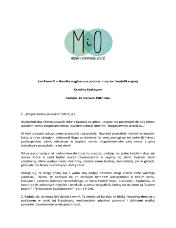 Jan Paweł II – Homilia wygłoszona podczas mszy św. beatyfikacyjnej Karoliny Kózkówny Tarnów, 10 czerwca 1987 roku 1. „Błogosławieni jesteście" (Mt 5,11). Wysłuchaliśmy Chrystusowych słów z Kazania na górze. Jeszcze raz przemówił do nas Mistrz językiem ośmiu błogosławieństw: językiem Dobrej Nowiny. "Błogosławieni jesteście..." W tych słowach odczytujemy przeszłość i przyszłość. Naprzód przeszłość. Kościół tarnowski, który w roku ubiegłym dziękował Bogu za dwieście lat swej posługi na tej nadwiślańskiej i podkarpackiej ziemi, odczytuje w orędziu ośmiu błogosławieństw całą swoją z górą tysiącletnią przeszłość na tej ziemi. Od przeszło tysiąca lat rozbrzmiewało tutaj to orędzie, padając na glebę ludzkich dusz jak ziarno, które ci sami ludzie rzucali równocześnie w zagony tej ziemi. Czasem ziemi urodzajnej, która wydaje owoc stokrotny, czasem ziemi trudnej, kamienistej, jak w górach, gdzie nie tak łatwo o urodzajny i obfity zbiór. Raduję się, że mogę dzisiaj być z wami, aby podjąć donośne wciąż jeszcze echo waszego jubileuszu. Wiem, że odezwał się on żarliwym hymnem wdzięczności w twoim sercu, biskupie i pasterzu Kościoła tarnowskiego, w sercu twoich braci, biskupów i kapłanów, w sercu rodzin zakonnych męskich i żeńskich, w sercu wszystkich, którzy na tej ziemi są "Ludem Bożym" i "królewskim kapłaństwem" (por. 1 P 2,9). 2. Raduję się, że mogę być dzisiaj z wami. Ta ziemia od lat była mi bliska. Wpatrywałem się z podziwem w uroki jej krajobrazu, wędrowałem górskimi pasmami i dolinami wzdłuż potoków. Doznawałem wiele gościnności. I jest mi bliski ten Kościół. A chociaż dzisiaj przybywam do was jako pielgrzym ze stolicy św. Piotra w Rzymie, to przez lata byłem tu sąsiadem. I doznawałem dobrego, serdecznego sąsiedztwa. Ewangelia, orędzie ośmiu błogosławieństw, czyż nie jest ono od początku wpisane w dzieje waszego Kościoła? Czyż nie głosili tego zbawczego orędzia już ci pierwsi święci pustelnicy znad Dunajca, a potem znad słowackiego Wagu - Świerad i Benedykt u samego początku naszych dziejów? A potem Stanisław ze Szczepanowa, biskup, męczennik na stolicy krakowskiej, z którym wiąże się wspólne dziedzictwo wszystkich Polaków. A potem jeszcze Kinga, księżna, matka narodu i mniszka w starosądeckim klasztorze św. Klary. 3. Orędzie ośmiu błogosławieństw, siejba Bożej Ewangelii, idzie przez stulecia. W czasie jubileuszu przypomnieliście skrupulatnie wszystkie osoby, miejsca i czasy, poprzez które tchnął w waszych wspólnych dziejach ten sam Duch Prawdy, który objawił się apostołom w dniu Pięćdziesiątnicy pod postacią ognistych języków. I to za naszych czasów, w tym stuleciu, jeszcze jeden taki ognisty język Ducha Prawdy, Parakleta, zatrzymał się nad postacią prostej, wiejskiej dziewczyny: "Bóg wybrał właśnie to, (...) co niemocne, aby mocnych poniżyć, aby zawstydzić mędrców" (por. 1 Kor 1,27). Czyż święci są po to, ażeby zawstydzać? Tak. Mogą być i po to. Czasem konieczny jest taki zbawczy wstyd, ażeby zobaczyć człowieka w całej prawdzie. Potrzebny jest, ażeby odkryć lub odkryć na nowo właściwą hierarchię wartości. Potrzebny jest nam wszystkim, starym i młodym. Chociaż ta młodziutka córka Kościoła tarnowskiego, którą od dzisiaj będziemy zwać błogosławioną, swoim życiem i śmiercią mówi przede wszystkim do młodych. Do chłopców i dziewcząt. Do mężczyzn i kobiet. Mówi o wielkiej godności kobiety: o godności ludzkiej osoby. O godności ciała, które wprawdzie na tym świecie podlega śmierci, jest zniszczalne, jak i jej młode ciało uległo śmierci ze strony zabójcy, ale nosi w sobie to ludzkie ciało zapis nieśmiertelności, jaką człowiek ma osiągnąć w Bogu wiecznym i żywym, osiągnąć przez Chrystusa. Tak więc święci są po to, ażeby świadczyć o wielkiej godności człowieka. Świadczyć o Chrystusie ukrzyżowanym i zmartwychwstałym "dla nas i dla naszego zbawienia", to znaczy równocześnie świadczyć o tej godności, jaką człowiek ma wobec Boga. Świadczyć o tym powołaniu, jakie człowiek ma w Chrystusie. 4. Karolina Kózkówna była świadoma tej godności. Świadoma tego powołania. Żyła z tą świadomością i dojrzewała w niej. Z tą świadomością oddała wreszcie swoje młode życie, kiedy trzeba było je oddać, aby obronić swą kobiecą godność. Aby obronić godność polskiej, chłopskiej dziewczyny. "Błogosławieni czystego serca, albowiem oni Boga oglądają" (por. Mt 5,8). Tak to orędzie ośmiu błogosławieństw wpisuje się nowymi zgłoskami w dzieje Kościoła tarnowskiego, w dzieje tego ludu, który od pokoleń - i bez względu na historyczne krzywdy i upokorzenia - przechowywał w sobie świadomość, że jest świętym Ludem Bożym, ludem odkupionym za cenę krwi Syna Bożego, królewskim kapłaństwem. Tam, wpośród równinnych lasów, w pobliżu miejscowości Wał-Ruda, zdaje się trwać ta wasza rodaczka, córka ludu, "gwiazda ludu", i świadczyć o niezniszczalnej przynależności człowieka do Boga samego. "Człowiek bowiem jest Chrystusowy - a Chrystus Boży" (por. 1 Kor 3,23). 5. Liturgia dzisiejszej beatyfikacji, a zwłaszcza psalm responsoryjny, pozwala nam niejako odczytać poszczególne momenty tego świadectwa. Tego męczeństwa. Czyż to nie ona tak mówi, ona, Karolina? "Zachowaj mnie, Boże, bo chronię się u Ciebie, mówię Panu: "Tyś jest Panem moim"" (Ps 16,1-2). Czyż to nie ona mówi poprzez słowa Psalmisty? W momencie straszliwego zagrożenia ze strony drugiego człowieka, wyposażonego w środki przemocy, chroni się do Boga. A okrzyk "Tyś Panem moim" oznacza: nie zapanuje nade mną brudna przemoc, bo Ty jesteś źródłem mej mocy - w słabości. Ty, jedyny Pan mojej duszy i mego ciała, mój Stwórca i Odkupiciel mego życia i mojej śmierci. Ty, Bóg mojego serca, z którym nie roz