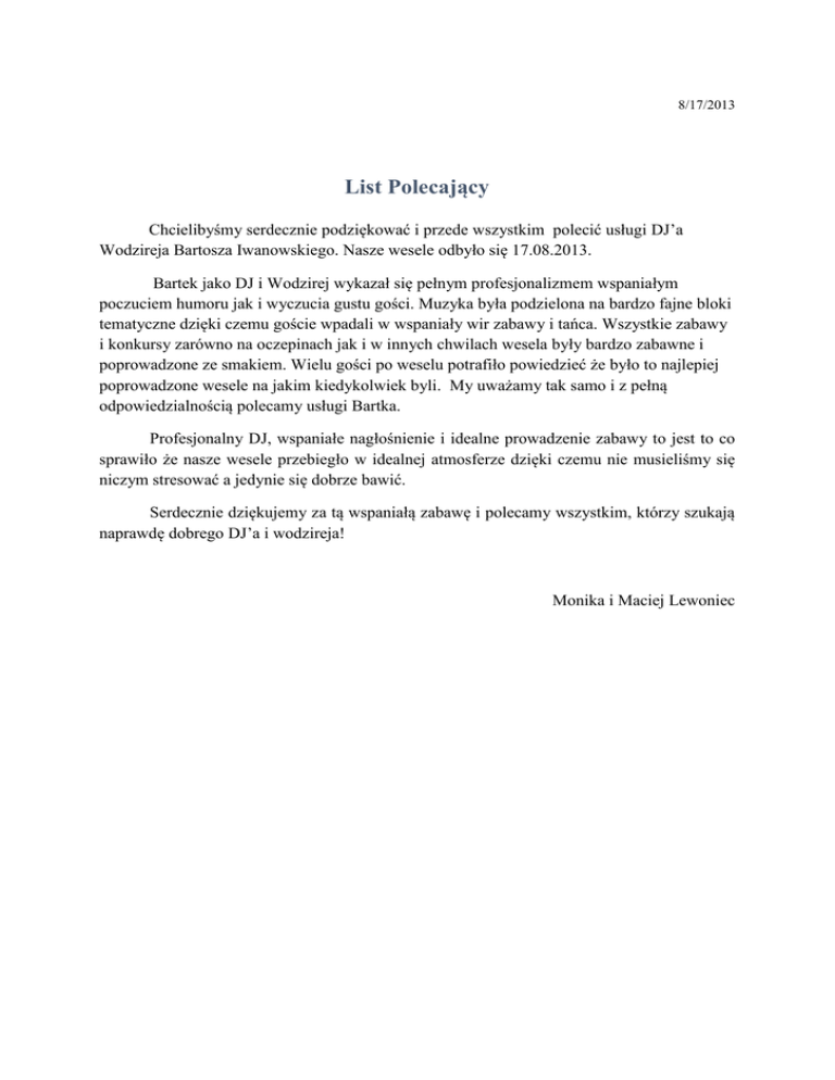 8/17/2013 List Polecający Chcielibyśmy serdecznie podziękować i przede wszystkim polecić usługi DJ’a Wodzireja Bartosza Iwanowskiego. Nasze wesele odbyło się 17.08.2013. Bartek jako DJ i Wodzirej wykazał się pełnym profesjonalizmem wspaniałym poczuciem humoru jak i wyczucia gustu gości. Muzyka była podzielona na bardzo fajne bloki tematyczne dzięki czemu goście wpadali w wspaniały wir zabawy i tańca. Wszystkie zabawy i konkursy zarówno na oczepinach jak i w innych chwilach wesela były bardzo zabawne i poprowadzone ze smakiem. Wielu gości po weselu potrafiło powiedzieć że było to najlepiej poprowadzone wesele na jakim kiedykolwiek byli. My uważamy tak samo i z pełną odpowiedzialnością polecamy usługi Bartka. Profesjonalny DJ, wspaniałe nagłośnienie i idealne prowadzenie zabawy to jest to co sprawiło że nasze wesele przebiegło w idealnej atmosferze dzięki czemu nie musieliśmy się niczym stresować a jedynie się dobrze bawić. Serdecznie dziękujemy za tą wspaniałą zabawę i polecamy wszystkim, którzy szukają naprawdę dobrego DJ’a i wodzireja! Monika i Maciej Lewoniec