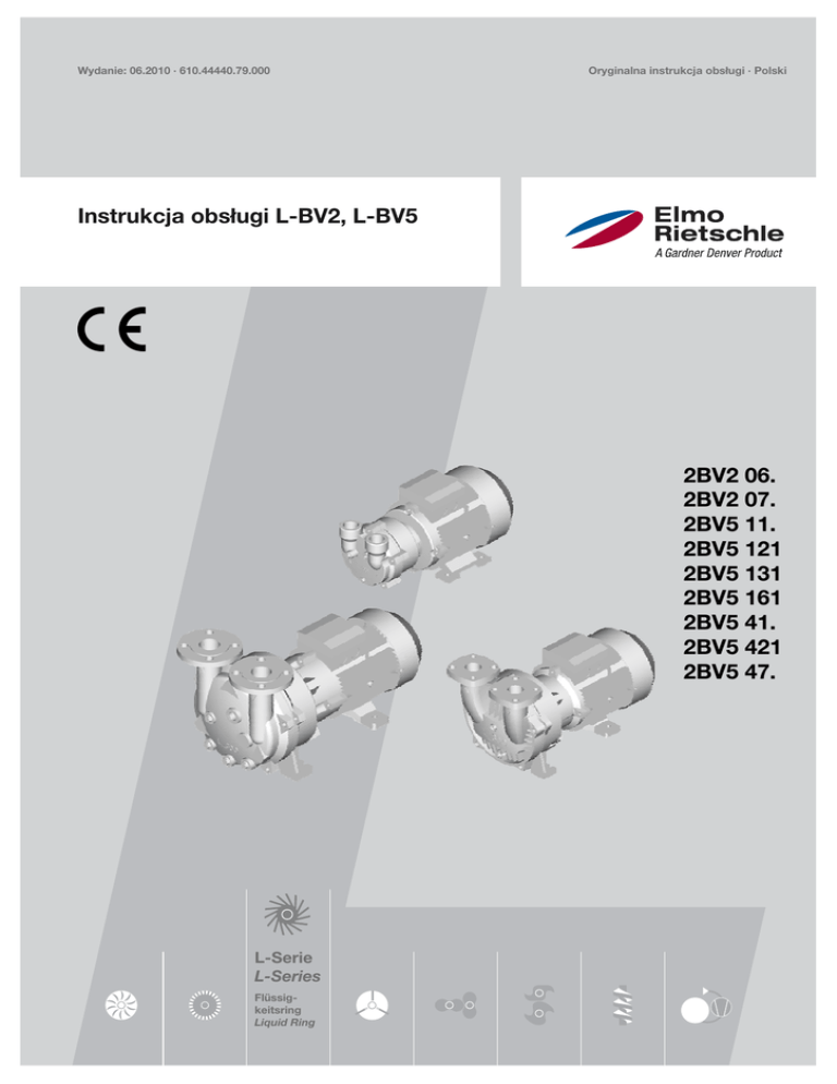 Wydanie: 06.2010 · 610.44440.79.000 Oryginalna instrukcja obsługi · Polski Instrukcja obsługi L-BV2, L-BV5 2BV2 06. 2BV2 07. 2BV5 11. 2BV5 121 2BV5 131 2BV5 161 2BV5 41. 2BV5 421 2BV5 47. L-Serie L-Series Flüssigkeitsring Liquid Ring Spis treści Spis treści Budowa agregatów............................................................................................................................. 3 1 Bezpieczeństwo ..................................................................................................................................4 1.1 Definicje.....................................................................................................................................4 1.1.1 Symbol ostrzeżenia ......................................................................................................4 1.1.2 Słowo sygnałowe..........................................................................................................4 1.2 Ogólne wskazówki bezpieczeństwa..........................................................................................4 1.3 Pozostałe zagrożenia................................................................................................................6 2 Użytkowanie zgodne z przeznaczeniem .............................................................................................7 3 Dane techniczne..................................................................................................................................8 3.1 Parametry mechaniczne ...........................................................................................................8 3.2 Dane elektryczne ....................................................................................................................10 3.3 Warunki eksploatacyjne w normalnej pracy............................................................................10 4 Transport ...........................................................................................................................................13 5 Instalacja ...........................................................................................................................................15 5.1 Posadowienie agregatu...........................................................................................................15 5.2 Mechaniczne podłączanie agregatu .......................................................................................16 5.2.1 Podłączanie króćca ssącego i króćca tłocznego........................................................16 5.2.2 Podłączanie przyłącza cieczy roboczej.....................................................................17 5.2.3 Podłączanie elementów po stronie instalacji .............................................................17 5.2.4 Osprzęt.......................................................................................................................18 5.3 Podłączanie zasilania elektrycznego silnika ...........................................................................18 5.3.1 Przyłącze w skrzyni zaciskowej silnika ......................................................................19 5.3.2 Praca z przetwornicą częstotliwości...........................................................................20 6 Rozruch .............................................................................................................................................20 6.1 Przygotowanie agregatu .........................................................................................................20 6.2 Uruchamianie agregatu z doprowadzeniem cieczy roboczej..................................................21 6.3 Uruchamianie agregatu z samozasysaniem cieczy roboczej .................................................21 6.4 Sprawdzenie kierunku obrotu .................................................................................................21 7 Obsługa .............................................................................................................................................22 7.1 Praca z doprowadzenie cieczy roboczej, ze sterowaniem automatycznym ...........................22 7.2 Praca z doprowadzeniem cieczy roboczej, bez sterowania automatycznego........................22 7.3 Praca z samozasysaniem cieczy roboczej .............................................................................23 7.4 Sprawdzanie i korygowania strumienia cieczy roboczej.........................................................23 8 Wyłączenie z ruchu i dłuższy stan spoczynku ..................................................................................24 8.1 Opróżnianie.............................................................................................................................24 8.2 Przygotowanie do wyłączenia i dłuższej przerwy w pracy......................................................25 8.3 Warunki przechowywania .......................................................................................................25 8.4 Uruchomienie po dłuższym stanie spoczynku ........................................................................25 9 Utrzymanie właściwego stanu technicznego urządzenia..................................................................26 9.1 Konserwacja............................................................................................................................27 9.2 Usuwanie usterek....................................................................................................................28 9.3 Serwis / służba obsługi klientów .............................................................................................30 9.4 Dekontaminacja i zaświadczenie o braku zagrożeń ...............................................................30 10 Usuwanie..............................................................................