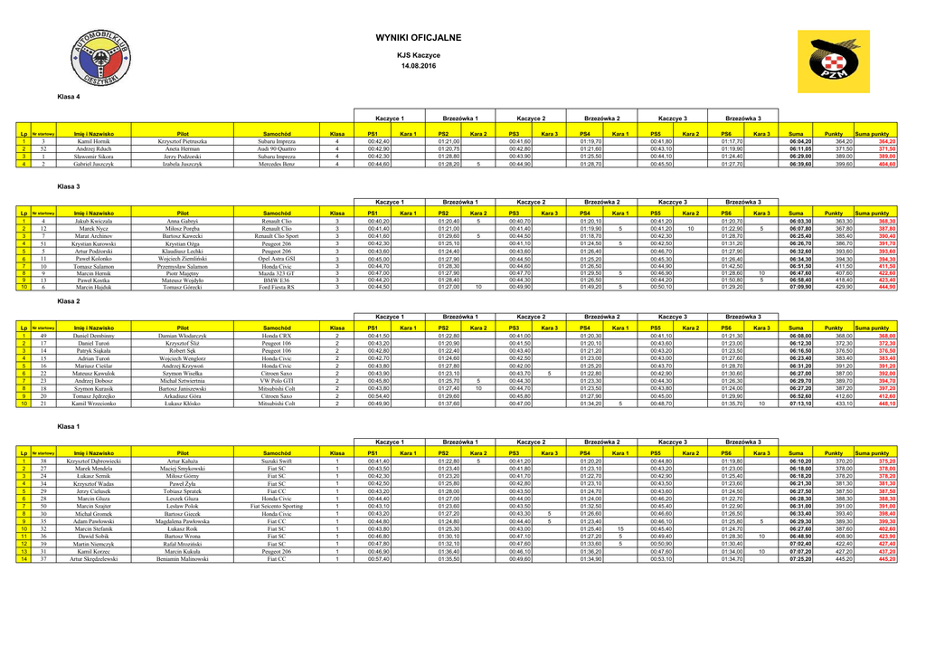 WYNIKI OFICJALNE KJS Kaczyce 14.08.2016 Klasa 4 Kaczyce 1 Lp 1 2 3 4 Nr startowy Imię i Nazwisko Pilot Samochód 3 52 1 2 Kamil Hornik Andrzej Rduch Sławomir Sikora Gabriel Juszczyk Krzysztof Pietruszka Aneta Herman Jerzy Podżorski Izabela Juszczyk Subaru Impreza Audi 90 Quattro Subaru Impreza Mercedes Benz Klasa 4 4 4 4 PS1 00:42,40 00:42,90 00:42,30 00:44,60 Klasa 3 3 3 3 3 3 3 3 3 3 PS1 00:40,20 00:41,40 00:41,60 00:42,30 00:43,60 00:45,00 00:44,70 00:47,00 00:44,20 00:44,50 Klasa 2 2 2 2 2 2 2 2 2 2 PS1 00:41,50 00:43,20 00:42,80 00:42,70 00:43,80 00:43,90 00:45,80 00:43,80 00:54,40 00:49,90 Klasa 1 1 1 1 1 1 1 1 1 1 1 1 1 1 PS1 00:41,40 00:43,50 00:42,30 00:42,50 00:43,20 00:44,40 00:43,10 00:43,20 00:44,80 00:43,80 00:46,80 00:47,80 00:46,90 00:57,40 Kara 1 Brzezówka 1 PS2 01:21,00 01:20,75 01:28,80 01:28,20 Kara 2 5 Brzezówka 2 Kaczyce 2 PS3 00:41,60 00:42,80 00:43,90 00:44,90 Kara 3 PS4 01:19,70 01:21,60 01:25,50 01:28,70 Kara 1 Brzezówka 3 Kaczcye 3 PS5 00:41,80 00:43,10 00:44,10 00:45,50 Kara 2 PS6 01:17,70 01:19,90 01:24,40 01:27,70 Kara 3 Suma 06:04,20 06:11,05 06:29,00 06:39,60 Punkty Suma punkty 364,20 364,20 371,50 371,50 389,00 389,00 399,60 404,60 Suma 06:03,30 06:07,80 06:25,40 06:26,70 06:32,60 06:34,30 06:51,50 06:47,60 06:58,40 07:09,90 Punkty Suma punkty 363,30 368,30 367,80 387,80 385,40 390,40 386,70 391,70 393,60 393,60 394,30 394,30 411,50 411,50 407,60 422,60 418,40 423,40 429,90 444,90 Suma 06:08,00 06:12,30 06:16,50 06:23,40 06:31,20 06:27,00 06:29,70 06:27,20 06:52,60 07:13,10 Punkty Suma punkty 368,00 368,00 372,30 372,30 376,50 376,50 383,40 383,40 391,20 391,20 387,00 392,00 389,70 394,70 387,20 397,20 412,60 412,60 433,10 448,10 Suma 06:10,20 06:18,00 06:18,20 06:21,30 06:27,50 06:28,30 06:31,00 06:33,40 06:29,30 06:27,60 06:48,90 07:02,40 07:07,20 07:25,20 Punkty Suma punkty 370,20 375,20 378,00 378,00 378,20 378,20 381,30 381,30 387,50 387,50 388,30 388,30 391,00 391,00 393,40 398,40 389,30 399,30 387,60 402,60 408,90 423,90 422,40 427,40 427,20 437,20 445,20 445,20 Klasa 3 Kaczyce 1 Lp 1 2 3 4 5 6 7 8 9 10 Nr startowy Imię i Nazwisko Pilot Samochód 4 12 7 51 5 11 10 9 13 6 Jakub Kwiczala Marek Nycz Marat Archinov Krystian Kurowski Artur Podżorski Paweł Kolonko Tomasz Salamon Marcin Hernik Paweł Kostka Marcin Hajduk Anna Gabryś Miłosz Poręba Bartosz Kawecki Krystian Oźga Klaudiusz Lechki Wojciech Ziemliński Przemysław Salamon Piotr Majętny Mateusz Wojdyło Tomasz Górecki Renault Clio Renault Clio Renault Clio Sport Peugeot 206 Peugeot 206 Opel Astra GSI Honda Civic Mazda 323 GT BMW E36 Ford Fiesta RS Kara 1 Brzezówka 1 PS2 01:20,40 01:21,00 01:29,60 01:25,10 01:24,40 01:27,90 01:28,30 01:27,90 01:28,40 01:27,00 Kara 2 5 5 10 Brzezówka 2 Kaczyce 2 PS3 00:40,70 00:41,40 00:44,50 00:41,10 00:43,60 00:44,50 00:44,60 00:47,70 00:44,30 00:49,90 Kara 3 PS4 01:20,10 01:19,90 01:18,70 01:24,50 01:26,40 01:25,20 01:26,50 01:29,50 01:26,50 01:49,20 Kara 1 5 5 5 5 Brzezówka 3 Kaczcye 3 PS5 00:41,20 00:41,20 00:42,30 00:42,50 00:46,70 00:45,30 00:44,90 00:46,90 00:44,20 00:50,10 Kara 2 10 PS6 01:20,70 01:22,90 01:28,70 01:31,20 01:27,90 01:26,40 01:42,50 01:28,60 01:50,80 01:29,20 Kara 3 5 10 5 Klasa 2 Kaczyce 1 Lp 1 2 3 4 5 6 7 8 9 10 Nr startowy Imię i Nazwisko Pilot Samochód 49 17 14 15 16 22 23 18 20 21 Daniel Dembinny Daniel Turoń Patryk Siąkała Adrian Turoń Mariusz Cieślar Mateusz Kawulok Andrzej Dobosz Szymon Kurasik Tomasz Jędrzejko Kamil Wrzecionko Damian Włodarczyk Krzysztof Śliż Robert Sęk Wojciech Wenglorz Andrzej Krzywoń Szymon Wisełka Michał Sztwiertnia Bartosz Janiszewski Arkadiusz Góra Łukasz Kłósko Honda CRX Peugeot 106 Peugeot 106 Honda Civic Honda Civic Citroen Saxo VW Polo GTI Mitsubishi Colt Citroen Saxo Mitsubishi Colt Kara 1 Brzezówka 1 PS2 01:22,80 01:20,90 01:22,40 01:24,60 01:27,80 01:23,10 01:25,70 01:27,40 01:29,60 01:37,60 Kara 2 5 10 Brzezówka 2 Kaczyce 2 PS3 00:41,00 00:41,50 00:43,40 00:42,50 00:42,00 00:43,70 00:44,30 00:44,70 00:45,80 00:47,00 Kara 3 5 PS4 01:20,30 01:20,10 01:21,20 01:23,00 01:25,20 01:22,80 01:23,30 01:23,50 01:27,90 01:34,20 Kara 1 5 Kaczcye 3 PS5 00:41,10 00:43,60 00:43,20 00:43,00 00:43,70 00:42,90 00:44,30 00:43,80 00:45,00 00:48,70 Kara 2 Brzezówka 3 PS6 01:21,30 01:23,00 01:23,50 01:27,60 01:28,70 01:30,60 01:26,30 01:24,00 01:29,90 01:35,70 Kara 3 10 Klasa 1 Kaczyce 1 Lp 1 2 3 4 5 6 7 8 9 10 11 12 13 14 Nr startowy Imię i Nazwisko Pilot Samochód 38 27 24 34 29 28 50 30 35 32 36 39 31 37 Krzysztof Dąbrowiecki Marek Mendela Łukasz Semik Krzysztof Wadas Jerzy Cielusek Marcin Gluza Marcin Szajter Michał Gromek Adam Pawłowski Marcin Stefanik Dawid Sobik Martin Niemczyk Kamil Korzec Artur Skrędzelewski Artur Kałuża Maciej Smykowski Miłosz Górny Paweł Żyła Tobiasz Spratek Leszek Gluza Lesław Polok Bartosz Giecek Magdalena Pawłowska Łukasz Roik Bartosz Wrona Rafał Mroziński Marcin Kukuła Beniamin Malinowski Suzuki Swift Fiat SC Fiat SC Fiat SC Fiat CC Honda Civic Fiat Seicento Sporting Honda Civic Fiat CC Fiat SC Fiat SC Fiat SC Peugeot 206 Fiat CC Kara 1 Brzezówka 1 PS2 01:22,80 01:23,40 01:23,20 01:25,80 01:28,00 01:27,00 01:23,60 01:27,20 01:24,80 01:25,30 01:30,10 01:32,10 01:36,40 01:35,50 Kara 2 5 Brzezówka 2 Kaczyce 2 PS3 00:41,20 00:41,80 00:41,70 00:42,80 00:43,50 00:44,00 00:43,50 00:43,30 00:44,40 00:43,00 00:47,10 00:47,60 00:46,10 00:49,60 Kara 3 5 5 PS4 01:20,20 01:23,10 01:22,70 01:23,10 01:24,70 01:24,00 01:32,50 01:26,60 01:23,40 01:25,40 01:27,20 01:33,60 01:36,20 01:34,90 Kara 1 15 5 5 Kaczcye 3 PS5 00:44,80 00:43,20 00:42,90 00:43,50 00:43,60 00:46,20 00:45,40 00:46,60 00:46,10 00:45,40 00:49,40 00:50,90 00:47,60 00:53,10 Kara 2 Brzezówka 3 PS6 01:19,80 01:23,00 01:25,40 01:23,60 01:24,50 01:22,70 01:22,90 01:26,50 01:25,80 01:24,70 01:28,30 01:30,40 01:34,00 01:34,70 Kara 3 5 10 10 Klasa Markowa Brzezówka 1 Kaczyce 1 Lp 1 2 3 4 5 6 7 8 Nr startowy Imię i Nazwisko Pilot Samochód 40 41 45 44 42 46 43 47 Tomasz Łukosz Rafał T