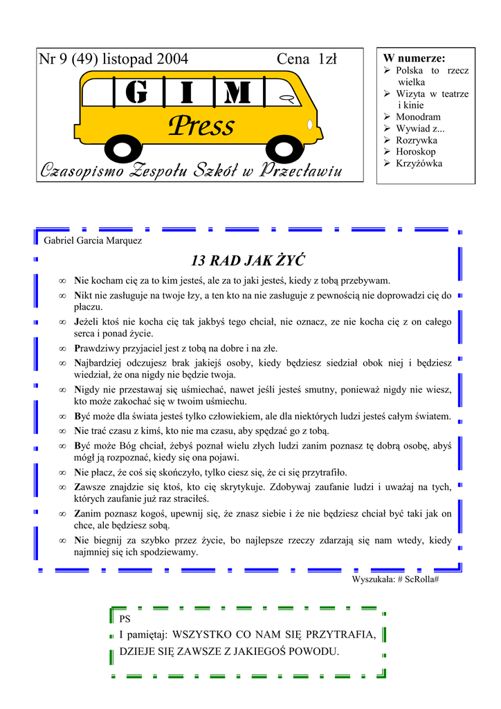 Nr 9 (49) listopad 2004 Cena 1zł W numerze: Polska to rzecz wielka Wizyta w teatrze i kinie Monodram Wywiad z... Rozrywka Horoskop KrzyŜówka Czasopismo Zespołu Szkół w Prz e cławiu Gabriel Garcia Marquez 13 RAD JAK śYĆ • • • • • • • • • • • • • Nie kocham cię za to kim jesteś, ale za to jaki jesteś, kiedy z tobą przebywam. Nikt nie zasługuje na twoje łzy, a ten kto na nie zasługuje z pewnością nie doprowadzi cię do płaczu. JeŜeli ktoś nie kocha cię tak jakbyś tego chciał, nie oznacz, ze nie kocha cię z on całego serca i ponad Ŝycie. Prawdziwy przyjaciel jest z tobą na dobre i na złe. Najbardziej odczujesz brak jakiejś osoby, kiedy będziesz siedział obok niej i będziesz wiedział, Ŝe ona nigdy nie będzie twoja. Nigdy nie przestawaj się uśmiechać, nawet jeśli jesteś smutny, poniewaŜ nigdy nie wiesz, kto moŜe zakochać się w twoim uśmiechu. Być moŜe dla świata jesteś tylko człowiekiem, ale dla niektórych ludzi jesteś całym światem. Nie trać czasu z kimś, kto nie ma czasu, aby spędzać go z tobą. Być moŜe Bóg chciał, Ŝebyś poznał wielu złych ludzi zanim poznasz tę dobrą osobę, abyś mógł ją rozpoznać, kiedy się ona pojawi. Nie płacz, Ŝe coś się skończyło, tylko ciesz się, Ŝe ci się przytrafiło. Zawsze znajdzie się ktoś, kto cię skrytykuje. Zdobywaj zaufanie ludzi i uwaŜaj na tych, których zaufanie juŜ raz straciłeś. Zanim poznasz kogoś, upewnij się, Ŝe znasz siebie i Ŝe nie będziesz chciał być taki jak on chce, ale będziesz sobą. Nie biegnij za szybko przez Ŝycie, bo najlepsze rzeczy zdarzają się nam wtedy, kiedy najmniej się ich spodziewamy. Wyszukała: # ScRolla# PS I pamiętaj: WSZYSTKO CO NAM SIĘ PRZYTRAFIA, DZIEJE SIĘ ZAWSZE Z JAKIEGOŚ POWODU. Czasopismo Zespołu Szkół w Przecławiu Str. 2 Polska to rzecz wielka Zgodnie z chlubną tradycją polskich szkół w przeddzień Święta Niepodległości dnia 10 listopada 2004r. społeczność Zespołu Szkół w Przecławiu zebrała się na uroczystej akademii, aby przypomnieć sobie historyczne wydarzenia, które przyniosły Polsce radość po mrocznym okresie zaborów. Akademia rozpoczęła się od okolicznościowego referatu, który odczytał Dariusz Skowron (IIIf). Główny jej trzon stanowił spektakl „Polska to wielka rzecz”, przygotowany przez klasę IIIf i IIId pod kierunkiem mgr Teresy Ciejki i mgr Marii Słodkowskiej. Poetyckim obrazom przeszłości, prezentowanym na tle dworku i lasu, towarzyszył pokaz multimedialny opracowany i odtwarzany przez mgr. inŜ. Zenona NaleŜnego. Zebrani z uwagą śledzili scenę z „Wesela” Wyspiańskiego, w której Poeta (Janusz Darłak IIId) wyjaśniał Pannie Młodej (Magdalena Marcićkiewicz IIId), Ŝe Polska Ŝyje w ludzkich sercach. Następnie na oczach widzów rozegrała się scena Ŝołnierska przy ognisku. Wykorzystano w niej wiersze polskich poetów, którzy ukazywali zryw niepodległości i radość Polaków z odzyskania wolności. W rolach legionistów wystąpili: Łukasz Grdeń, Mateusz Harla i Paweł Bieszczad. Dziewczynę – Ŝołnierza zagrała Klaudia Arciszewska. Gońcem był Michał Partacz. Akompaniament muzyczny do pieśni legionowych to dzieła Marcina Bukały. Ponadto w akademii wzięli udział: Bartłomiej Mucha (recytator), Krzysztof Skrzypek, Marcin Najuch, Artur Jurek, Rafał Skrzypek, Ryszard Słąba, Jarosław Skrzypek, Bogusław Litwiński, Adrian Muniak, Daniel Wilaszek, Marcin Kopacz, Wiktor Miela, Grzegorz Bogdan – wszyscy z IIIf. Postać bogini Nike zwiastującej nadejście zagrała Małgorzata Giec, wolności a dziewczyną była Paulina Babula (obie IIId). Zmartwychwstanie Ojczyzny przedstawiły w scence baletowej uczennice: Małgorzata Kluz i Anna Barnaś (IIIc), Klaudia Skrzypek (Ia), Edyta WraŜeń (IIb) i Sylwia Kurgan (IIe). Podniosła uroczystość z okazji narodowego święta była dla uczniów Zespołu Szkół z Przecławiu piękną lekcją patriotyzmu. Na podstawie informacji p. Marii Słodkowskiej Magdalena Marcićkiewicz ANTYGONA Dnia 10.11.2004 roku uczniowie klas 3-ich (głównie) i innych wraz z paniami: mgr Ewą Arciszewską, mgr Lucyną Augustyn, mgr ElŜbietą Bałą, mgr Teresą Ciejką, mgr Marią Słodkowską i mgr Martą Harlą wyjechali do Centrum Kultury w Dębicy, aby obejrzeć spektakl pt. Antygona Sofoklesa. Widowisko wystawił Teatr Norma z Łączna. Przedstawiono je w formie teatru rapsodycznego, gdzie widowiskowość ustępuje dbałości o jasność, przejrzystość i logikę argumentacji tekstu dramatu. Spośród dawniejszych i nowszych przekładów Antygony wybrano tłumaczenie Kazimierza Morawskiego ze względu na jego wysokie walory językowo – artystyczne. Przedstawienie wyreŜyserował Jerzy Hołda. Antygona to jedna z siedmiu zachowanych tragedii Sofoklesa, obok Ajschylosa i Eurypidesa, największego z greckich tragików staroŜytności. Jej prapremiera odbyła się w 441 r. p.n.e. Zgodnie z zasadą trzech jedności klasycznych (czasu, miejsca i akcji) akcja Antygony nie przekracza 24 godzin, toczy się w jednym miejscu – przed pałacem królewskim w Tebach, dotyczy ściśle określonego tematu: Antygona postąpiła wbrew woli króla Kreona i pochowała zwłoki brata – zdrajcy, władca postanowił ją za to ukarać. GIMPRESS 9 (49) listopad 2004 Czasopismo Zespołu Szkół w Przecławiu Str. 3 Odtwórczynią głównej i tytułowej roli była Anna Kłos, która znakomicie wywiązała się ze swego zadania. Wykreowała postać kobiety delikatnej i religijnej, a zarazem nieugiętej, odwaŜnej i zdecydowanej. Pochwała naleŜy się równieŜ pozostałym aktorom tj. Jerzemu Hołdzie (Kreon), Dagnie Feliks (Ismena i Eurydyka), Henrykowi Wiciarzowi (posłaniec i dłuŜnik) oraz Tomaszowi Gielasowi, (Terezjasz), poniewaŜ do zaprezentowania bohaterów mieli tylko gesty, mimikę i ruch, a spowodowali, Ŝe byli czytelni dla widza. Efektami dźwiękowymi zajął się Henryk Wiciarz. Scenografia,