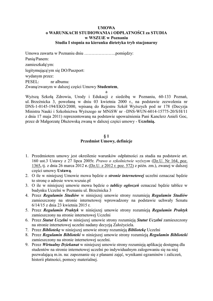 UMOWA o WARUNKACH STUDIOWANIA i ODPŁATNOŚCI za STUDIA w WSZUiE w Poznaniu Studia I stopnia na kierunku dietetyka tryb stacjonarny Umowa zawarta w Poznaniu dniu ………………….pomiędzy: Panią/Panem: zamieszkałą\ym: legitymującą\ym się DO/Paszport: wydanym przez: PESEL: nr albumu: Zwaną/zwanym w dalszej części Umowy Studentem, a Wyższą Szkołą Zdrowia, Urody i Edukacji z siedzibą w Poznaniu, 60-133 Poznań, ul. Brzeźnicka 3, powołaną w dniu 03 kwietnia 2000 r., na podstawie zezwolenia nr DNS-1-0145-194/EKO/2000, wpisaną do Rejestru Szkół Wyższych pod nr 178 (Decyzja Ministra Nauki i Szkolnictwa Wyższego nr MNiSW nr –DNS-WUN-6014-15775-20/S/H/11 z dnia 17 maja 2011) reprezentowaną na podstawie upoważnienia Pani Kanclerz Anieli Goc, przez dr Małgorzatę Dłużewską zwaną w dalszej części umowy - Uczelnią. §1 Przedmiot Umowy, definicje 1. Przedmiotem umowy jest określenie warunków odpłatności za studia na podstawie art. 160 ust.3 Ustawy z 27 lipca 2005r. Prawo o szkolnictwie wyższym (Dz.U. Nr 164, poz. 1365, tj. z dnia 26 marca 2012 r. (Dz.U. z 2012 r. poz. 572) z późn. zm.), zwanej w dalszej części umowy Ustawą. 2. O ile w niniejszej Umowie mowa będzie o stronie internetowej uczelni oznaczać będzie to stronę o adresie www.wszuie.pl 3. O ile w niniejszej umowie mowa będzie o tablicy ogłoszeń oznaczać będzie tablice w budynku Uczelni w Poznaniu ul. Brzeźnicka 3 4. Przez Regulamin Studiów w niniejszej umowie strony rozumieją Regulamin Studiów zamieszczony na stronie internetowej wprowadzony na podstawie uchwały Senatu 6/14/15 z dnia 23 kwietnia 2015 r. 5. Przez Regulamin Praktyk w niniejszej umowie strony rozumieją Regulamin Praktyk zamieszczony na stronie internetowej Uczelni 6. Przez Statut Uczelni w niniejszej umowie strony rozumieją Statut Uczelni zamieszczony na stronie internetowej uczelni nadany decyzją Założyciela. 7. Przez Bibliotekę w niniejszej umowie strony rozumieją Bibliotekę Uczelni 8. Przez Regulamin Biblioteki w niniejszej umowie strony rozumieją Regulamin Biblioteki zamieszczony na stronie internetowej uczelni. 9. Przez Wirtualny Dziekanat w niniejszej umowie strony rozumieją aplikację dostępną dla studentów na stronie internetowej uczelni po indywidualnym zalogowaniu się na niej pozwalającą m.in. na: zapoznanie się z planami zajęć, wynikami egzaminów i zaliczeń, historii płatności, pomocy materialnej. §2 Oświadczenia i zobowiązania Uczelni 1. Uczelnia oświadcza, że spełnia wymagania Ustawy oraz wydanych na jej podstawie aktów wykonawczych, które są konieczne do prowadzenie studiów będących przedmiotem niniejszej umowy. Jednocześnie zobowiązuje się do zapewnienia kadry dydaktycznej posiadającej wymagane kwalifikacje do prowadzenia odpowiednich zajęć, sal dydaktycznych koniecznych do prawidłowej realizacji programu kształcenia, możliwości korzystania z biblioteki, odpowiedniej obsługi administracyjnej 2. Uczelnia oświadcza, że: 2.1. Posiada program kształcenia zgodny z wymaganiami Krajowych Ram Kwalifikacji dla szkolnictwa wyższego. 2.2. warunki studiów są określone zgodnie z wymaganiami art. 160 i 161 Ustawy, a szczegółowe warunki studiowania w kolejnym semestrze, zawierające wykaz przedmiotów wraz z liczbą godzin wykładów, ćwiczeń i praktyk, wykaz nazwisk osób prowadzących zajęcia dydaktyczne wraz z ich stopniami naukowymi, miejsce, czas i sposób ich prowadzenia oraz warunki zaliczenia poszczególnych przedmiotów, będą podawane do wiadomości Studenta za pośrednictwem tablicy ogłoszeń oraz strony internetowej Uczelni. 2.3. podjęte przez Studenta studia kończą się uzyskaniem tytułu zawodowego licencjata, do nadawania którego Uczelnia ma uprawnienia i zobowiązuje je utrzymywać do końca okresu wskazanego w ust.1 p. 1 niniejszego paragrafu 2.4. zasady i tryb organizacji praktyk zawodowych są określone w regulaminie praktyk dostępnym na stronie internetowej Uczelni, wymiar praktyk zawodowych wynosi dla kierunku dietetyka 700 godzin. 2.5. wszystkie Zarządzenia Kanclerza, Rektora i Dziekana będą podane do wiadomości poprzez wywieszenie na tablicy ogłoszeń oraz zamieszczenie na stronie internetowej uczelni. §3 Oświadczenia i zobowiązania Studenta 1. Student oświadcza, że znany jest mu Statut Uczelni, Regulamin Studiów, Regulamin Praktyk oraz Regulamin Biblioteki i zobowiązuje się do ich przestrzegania. 2. Student zobowiązuje się do przestrzegania Zarządzeń Rektora, Dziekana oraz Kanclerza. 3. Student oświadcza, iż wyraża zgodę na przetwarzanie swoich danych osobowych przez Uczelnię w celu realizacji niniejszej umowy, a także potwierdza, iż został przez Uczelnię poinformowany o przysługujących mu w związku z tym prawach, o których mowa w Ustawie z dnia 29 sierpnia 1997 r. o ochronie danych osobowych (Dz. U. 2002/101/926 z późn. zm.), w szczególności o prawie dostępu do treści swoich danych oraz ich poprawiania. 4. Student, wyraża zgodę, na ogłaszanie swoich wyników egzaminów, zaliczeń i innych form oceny pracy i aktywności poprzez wywieszenie tych informacji na tablicy ogłoszeń, a także umieszczanie ich na stronie internetowej uczelni w zakładce Wirtualny Dziekanat. 5. W okresie obowiązywania umowy określonym w par. 6 ust.2 niniejszej umowy Student zobowiązany jest informować Uczelnię na piśmie o każdej zmianie swoich danych osobowych, w szczególności zmianie nazwiska, nie później niż w terminie 14 dni po zaistnieniu takiej zmiany. Skutki zaniechania wykonania tego obowiązku obciążać będą Studenta. 6. Student zobowiązany jest niezwłocznie (nie później jednak niż w terminie 14 dni od chwili zaistnienia zmiany) zawiadomić Uczelnię w formie pisemnej o każdorazowej zmianie adresu swojego zamieszkania. W razie niedopełnienia obowiązku, o którym mowa, wszelką korespondencję przesłaną na adres Studenta wskazany w niniejszej umowie, Strony uznają za skutecznie dor