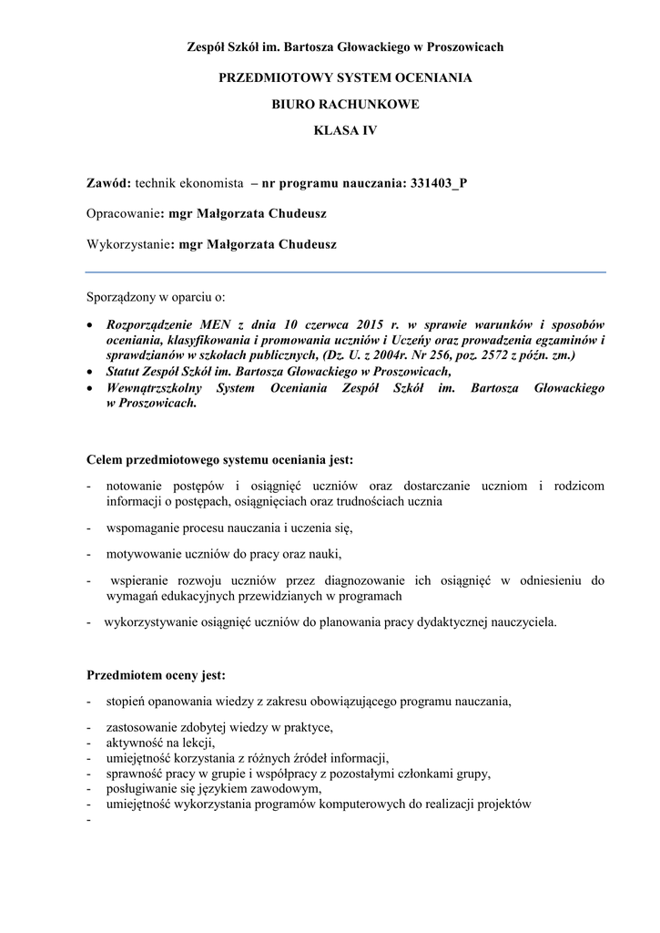 Zespół Szkół im. Bartosza Głowackiego w Proszowicach PRZEDMIOTOWY SYSTEM OCENIANIA BIURO RACHUNKOWE KLASA IV Zawód: technik ekonomista – nr programu nauczania: 331403_P Opracowanie: mgr Małgorzata Chudeusz Wykorzystanie: mgr Małgorzata Chudeusz Sporządzony w oparciu o:    Rozporządzenie MEN z dnia 10 czerwca 2015 r. w sprawie warunków i sposobów oceniania, klasyfikowania i promowania uczniów i Uczeńy oraz prowadzenia egzaminów i sprawdzianów w szkołach publicznych, (Dz. U. z 2004r. Nr 256, poz. 2572 z późn. zm.) Statut Zespół Szkół im. Bartosza Głowackiego w Proszowicach, Wewnątrzszkolny System Oceniania Zespół Szkół im. Bartosza Głowackiego w Proszowicach. Celem przedmiotowego systemu oceniania jest: - notowanie postępów i osiągnięć uczniów oraz dostarczanie uczniom i rodzicom informacji o postępach, osiągnięciach oraz trudnościach ucznia - wspomaganie procesu nauczania i uczenia się, - motywowanie uczniów do pracy oraz nauki, - wspieranie rozwoju uczniów przez diagnozowanie ich osiągnięć w odniesieniu do wymagań edukacyjnych przewidzianych w programach - wykorzystywanie osiągnięć uczniów do planowania pracy dydaktycznej nauczyciela. Przedmiotem oceny jest: - stopień opanowania wiedzy z zakresu obowiązującego programu nauczania, - zastosowanie zdobytej wiedzy w praktyce, aktywność na lekcji, umiejętność korzystania z różnych źródeł informacji, sprawność pracy w grupie i współpracy z pozostałymi członkami grupy, posługiwanie się językiem zawodowym, umiejętność wykorzystania programów komputerowych do realizacji projektów Na lekcjach o charakterze ćwiczeniowym oceniana jest: - umiejętność wykorzystania zdobytej wiedzy i zastosowania w praktyce, aktywność na zajęciach, umiejętność korzystania z różnych źródeł informacji, zaangażowanie i umiejętność współdziałania ucznia w zespole, umiejętność posługiwania się językiem zawodowym gromadzenie dodatkowych materiałów poszerzających wiedzę przedmiotową. umiejętność posługiwania się poznanymi programami komputerowymi Sposoby sprawdzania stopnia opanowania wiedzy i umiejętności: a) formy ustne: b) - odpowiedzi, - wypowiedzi podczas lekcji (aktywność), c) formy pisemne: - sprawdziany, - testy (różnego typu), - kartkówki, - zadania domowe, d) formy praktyczne: - prawidłowe wypełnianie dokumentów, - sporządzanie pism, - sporządzanie projektów - praca na programach komputerowych Stosowana skala ocen:       celujący (6) bardzo dobry (5) dobry (4) dostateczny (3) dopuszczający (2) niedostateczny (1) Oceny cząstkowe mogą być wystawiane z (+) lub (-), oceny śródroczne i roczne bez znaków dodatkowych. Oceny są jawne dla ucznia i rodzica (opiekuna prawnego). Przy ocenie prac pisemnych stosuje się progi procentowe poszczególnych ocen: Progi procentowe 0 % - 29% Ocena niedostateczny 30% - 50 % dopuszczający 51 % - 75 % dostateczny 76 % - 90 % dobry 91 % - 100 % bardzo dobry Ponad 100 % celujący O zasadach przedmiotowego systemu oceniania uczniowie zostają poinformowani na początku roku szkolnego. OCENA CELUJĄCA Ocenę celującą otrzymuje Uczeń, który wykazuje się wiedzą i umiejętnościami wykraczającymi poza wymagania na ocenę bardzo dobrą OCENA BARDZO DOBRA Uczeń potrafi przewidywać psychologiczne stresory np.: nadmierne obciążenie, presja terminów, przeciążenie informacyjne, monitorowanie wydajności Uczeń potrafi ustawić wszystkie niezbędne parametry programu Rewizor GT Uczeń potrafi zatwierdzić i wydrukować Bilans Otwarcia z programu Rewizor GT Uczeń potrafi zatwierdzać plany amortyzacyjne w programie Rewizor GT Uczeń potrafi dokonać zmian stawki amortyzacyjnej w programie Rewizor GT Uczeń potrafi uzgadniać zapisy kont syntetycznych i analitycznych dotyczących obrotu towarowego w Rewizor GT oraz porównać zapisy z programem Subiekt GT Uczeń potrafi uzgadniać zapisy kont syntetycznych i analitycznych dotyczących obrotu materiałowego w Rewizor GT oraz porównać zapisy z programem Subiekt GT Uczeń potrafi uzgadniać zapisy kont syntetycznych z analitycznymi dotyczących obrotu pieniężnego i papierów wartościowych w programie Rewizor GT Uczeń potrafi kontrolować należności i zobowiązania w programie Rewizor GT Uczeń potrafi uzgadniać zapisy kont syntetycznych z analitycznymi dotyczących obrotu wyrobami gotowymi w programie Rewizor GT oraz porównać zapisy z programem Subiekt GT Suchacz potrafi dokonać automatycznej dekretacji dokumentów księgowych Uczeń potrafi zamknąć księgi rachunkowe Uczeń potrafi zarchiwizować dzienni księgowań z programu Rewizor GT OCENA DOBRA Uczeń potrafi określić ergonomię stanowiska pracy wyposażonego w komputer Uczeń potrafi przewidywać zagrożenia dla zdrowia związane z nieprawidłową pozycją ciała podczas pracy z komputerem Uczeń potrafi przewidywać reakcje fizjologiczne podczas pracy z komputerem Uczeń potrafi aktualizować dane podmiotu w programie Rewizor GT Uczeń potrafi utworzyć konta syntetyczne i analityczne w programie Rewizor GT Uczeń potrafi modyfikować Bilans Otwarcia w programie Rewizor GT Uczeń potrafi modyfikować kartoteki środków trwałych zakupionych w poprzednim okresie w programie Rewizor GT Uczeń potrafi sporządzać dokumenty dotyczące modernizacji, sprzedaży i nieodpłatnego przekazania środków trwałych w programie Rewizor GT Uczeń potrafi drukować dokumenty dotyczące środków trwałych w programie Rewizor GT Suchacz potrafi dokonać półautomatycznej dekretacji dokumentów księgowych Uczeń potrafi poprawić błędy w dokumentach dotyczących obrotu towarowego w programie Rewizor GT Uczeń potrafi poprawić błędy w dokumentach dotyczących obrotu materiałowego w programie Rewizor GT sporządza rozliczenie spisu z natury weryfikuje inwentaryzację poprzez konfrontację różnych metod; interpretuje różnice inwentaryzacyjne określa warunki do obliczenia kompensaty nied