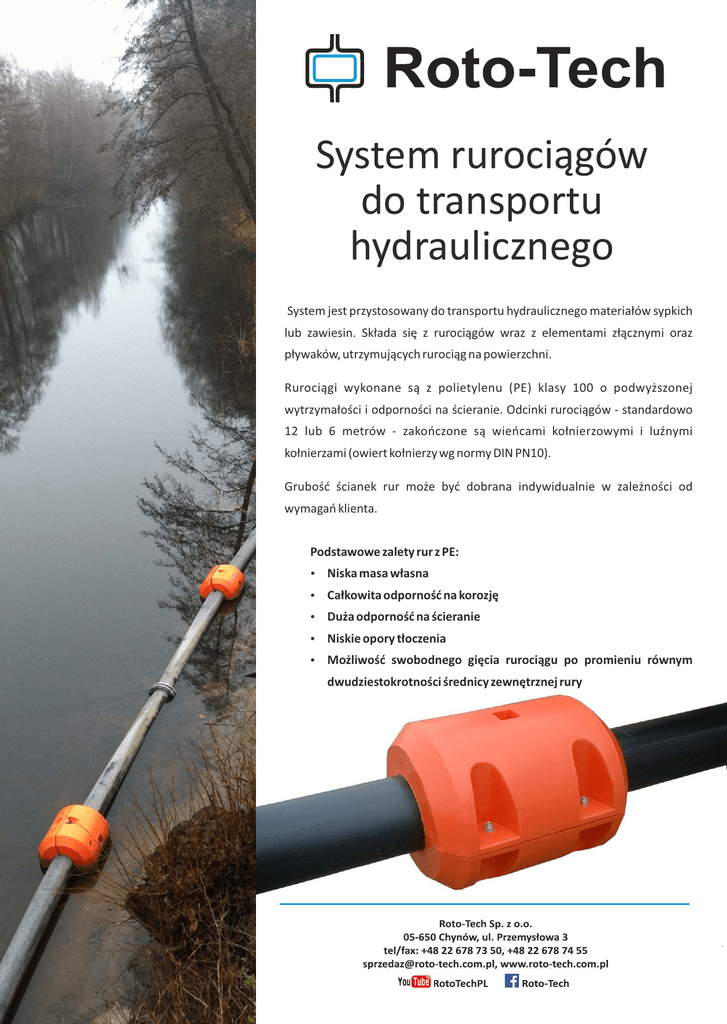 System rurociągów do transportu hydraulicznego System jest przystosowany do transportu hydraulicznego materiałów sypkich lub zawiesin. Składa się z rurociągów wraz z elementami złącznymi oraz pływaków, utrzymujących rurociąg na powierzchni. Rurociągi wykonane są z polietylenu (PE) klasy 100 o podwyższonej wytrzymałości i odporności na ścieranie. Odcinki rurociągów - standardowo 12 lub 6 metrów - zakończone są wieńcami kołnierzowymi i luźnymi kołnierzami (owiert kołnierzy wg normy DIN PN10). Grubość ścianek rur może być dobrana indywidualnie w zależności od wymagań klienta. Podstawowe zalety rur z PE: ź Niska masa własna ź Całkowita odporność na korozję ź Duża odporność na ścieranie ź Niskie opory tłoczenia ź Możliwość swobodnego gięcia rurociągu po promieniu równym dwudziestokrotności średnicy zewnętrznej rury Pływaki do systemu rurociągów pływających wykonane są z polietylenu. Każdy pływak składa się z dwóch symetrycznych połówek mocowanych bezpośrednio na rurze przewodowej przy użyciu śrub stalowych ocynkowanych. Wewnętrzna średnica pływaka jest w kształcie walcowym o średnicy dokładnie odpowiadającej średnicy rury, tak że nie jest możliwe przesuwanie się pływaka wzdłuż rury. Standardowo pływaki wykonywane są na średnice rur PE, ale w razie konieczności mogą być wykonane w wersji na rury stalowe. Jaskrawy, pomarańczowy kolor pływaków czyni rurociąg doskonale widocznym nawet z dużej odległości. W razie potrzeby pływak może posiadać gniazdo na przewód elektryczny. Niska masa ź Łatwy transport ź Całkowita odporność na korozję ź Odporność na uszkodzenia mechaniczne ź Małe opory stawiane płynącej wodzie d ź Wymiary pływaków na rury PE d mm 110 160 200 225 250 280 315 355 400 450 500 560 D L mm mm 350 400 450 550 650 600 650 600 635 675 650 750 700 850 800 900 900 1 100 1 000 1 100 1 100 1 200 1350 1200 W kg 30 62 155 120 140 200 210 290 450 550 720 1250 C kg 5 8 16 16 16 20 24 28 36 50 66 84 M mm 12 20 20 20 20 20 20 20 20 20 20 20 D Podstawowe zalety pływaków z PE: L s szt. 2 2 2 2 2 2 2 4 4 6 9 9 d - zewnętrzna średnica rury D - zewnętrzna średnica pływaka L - długość pływaka W - wyporność pływaka C - ciężar całkowity M - średnica śrub i nakrętek s - ilość śrub Wymiary rurociągów z PE SDR PN d 110 160 200 225 250 280 315 355 400 450 500 26 6,3 e 4,2 6,2 7,7 8,6 9,6 10,7 12,1 13,6 15,3 17,2 19,1 dw 101,6 147,6 184,6 207,8 230,8 258,6 290,8 327,8 369,4 415,6 461,8 17 10 e 6,6 9,5 11,9 13,4 14,8 16,6 18,7 21,1 23,7 26,7 29,7 11 16 dw 96,8 141,0 176,2 198,2 220,4 246,8 277,6 312,8 352,6 396,6 440,6 e 10,0 11,4 18,2 20,5 22,7 25,4 28,6 36,3 36,3 40,9 45,4 dw 90,0 137,2 163,6 184,0 204,6 229,2 257,8 282,4 327,4 368,2 409,2 e - grubość ścianki rury d - średnica zewnętrzna rury dw - średnica wewnętrzna rury SDR – stosunek średnicy zewnętrznej do grubości ścianki