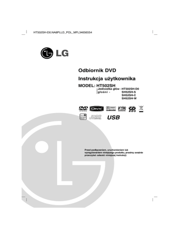 HT502SH-D0.NA8PLLD_POL_MFL34656554 Odbiornik DVD Instrukcja użytkownika MODEL: HT502SH Jednostka głów - HT502SH-D0 głośni SH52SH-S SH52SH-C SH52SH-W R USB Przed podłączeniem, uruchomieniem lub wyregulowaniem niniejszego produktu, prosimy uważnie przeczytać całaość niniejszej instrukcji. UWAGA RYZYKO PORAŻENIA PRĄDEM ELEKTRYCZNYM NIE OTWIERAĆ UWAGA: ABY ZMINIMALIZOWAĆ RYZYKO PORAŻENIA PRĄDEM ELEKTRYCZNYM NIE USUWAĆ POKRYWY (LUB TYLNEJ CZĘŚCI) WEWNĄTRZ URZĄDZENIA NIE MA CZĘŚCI, KTÓRE MOGĄ BYĆ NAPARAWANE PRZEZ UŻYTKOWNIKA POZOSTAWIĆ CZYNNOŚCI SERWISOWE WYKWALIFIKOWANEMU PERSONELOWI SERWISOWEMU. Symbol błyskawicy ze strzałką wewnątrz trójkąta równobocznego ma ostrzegać użytkownika, że wewnątrz obudowy urządzenia znajdują się nie izolowane przewodniki napięcia o niebezpiecznej wysokości, które mogą spowodować poważne ryzyko porażenia prądem elektrycznym. Wykrzyknik wewnątrz trójkąta równobocznego ma informować użytkownika o ważnych informacjach odnośnie używania i konserwacji (serwisowania) urządzenia, zawartych w dokumentacji dołączonej do urządzenia. OSTRZEŻENIE: ABY ZMINIMALIZOWAĆ RYZYKO POŻARU LUB PORAŻENIA PRĄDEM ELEKTRYCZNYM, NIE WYSTAWIAJ TEGO URZĄDZENIA NA DZIAŁANIE DESZCZU LUB WILGOCI. OSTRZEŻENIE: Nie instaluj tego urządzenia w miejscach o ograniczonej przestrzeni, takich jak półki lub regały. UWAGA: Nie wolno blokować otworów wentylacyjnych. Należy zainstalować zgodnie z zaleceniami producenta. Otwory znajdujące się w obudowie zostały wykonane dla zapewnienia wentylacji, prawidłowego działania i zabezpieczenia przed przegrzaniem. Otwory te nie mogą być zasłaniane przez położenie urządzenia na łóżku, sofie, dywanie lub na podobnej powierzchni. Urządzenie to nie wolno umieszczać w powierzchni zabudowanej np. półkach na książki lub w szafkach chyba, że zapewniona jest właściwa wentylacja lub przestrzegane są zalecenia producenta. CLASS 1 LASER PRODUCT KLASSE 1 LASER PRODUKT LUOKAN 1 LASER LAITE KLASS 1 LASER APPARAT CLASSE 1 PRODUIT LASER UWAGA: Urządzenie zawiera system laserowy. Aby właściwie używać produkt, prosimy dokładnie przeczytać i zachować na przyszłość instrukcję obsługi. Jeżeli urządzeni wymaga naprawy, prosimy skontaktować się z autoryzowanym centrum serwisowym. Używanie urządzeń sterujących lub nastawczych lub wykonywanie czynności innych niż opisane w instrukcji może narazić użytkownika na działanie niebezpiecznego promieniowania. Aby uniknąć bezpośredniego narażenia się na promieniowanie lasera, nie wolno próbować otwierać obudowy. Po otwarciu widoczny promień lasera. NIE WOLNO PATRZYĆ W KIERUNKU PROMIENIA. 2 UWAGA: Urządzenie nie powinno być wystawiane na działanie wody (kapanie lub zachlapanie) i nie wolno stawiać na urządzeniu żadnych naczyń z wodą, takich jak na przykład flakony. UWAGA dotycząca kabla zasilania Zaleca się podłączanie większości urządzeń do wydzielonego obwodu; Oznacza to, ze pojedyncze gniazdko elektryczne zasilające tylko to urządzenie nie posiada dodatkowych wejść lub rozgałęźników. Aby upewnić się prośże przejrzeć stronę ze specyfikacja w instrukcji obsługi. Nie przeciążać ściennych gniazdek elektrycznych. Przeciążone gniazdka elektryczne, poluzowane lub uszkodzone gniazdka, przedłużacze, pęknięte przewody zasilania lub uszkodzone izolacje przewodów są niebezpieczne. Każdy z tych przypadków może spowodować porażenie prądem lub pożar. Co jakiś czas sprawdzaj przewody podłączone do urządzenia i w razie zauważenia uszkodzeń lub zużycia odłącz je od urządzenia i zastąp identycznym przewodem dostarczonym przez autoryzowany serwis. Chroń przewód przed fizycznymi i mechanicznymi działaniami, takimi jak wykręcanie, zapętlanie, ściskanie, przytrząśniecie przez drzwi lub deptanie. Zwróć szczególna uwagę na wtyczki, gniazdka elektryczne i miejsce gdzie przewód wychodzi z urządzenia. Aby odłączyć zasilanie należy wyciągnąć wtyczkę z gniazdka. Podczas instalacji urządzenia należy zapewnić swobodny dostęp do wtyczki zasilania. Utylizacja starych urządzeń 1. Kiedy do produktu dołączony jest niniejszy przekreślony symbol kołowego pojemnika na śmieci, oznacza to, że produkt jest objęty dyrektywą 2002/96/EC. 2. Wszystkie elektryczne i elektroniczne produkty powinny być utylizowane niezależnie od odpadów miejskich, z wykorzystaniem przeznaczonych do tego miejsc składowania wskazanych przez rząd lub miejscowe władze. 3. Właściwy sposób utylizacji starego urządzenia pomoże zapobiec potencjalnie negatywnemu wpływowi na zdrowie i środowisko. 4. Aby uzyskać więcej informacji o sposobach utylizacji starych urządzeń, należy skontaktować się z władzami lokalnymi, przedsiębiorstwem zajmującym się utylizacją odpadów lub sklepem, w którym produkt został kupiony. Urządzenie to zostało wyprodukowane zgodnie z dyrektywami EEC DIRECTIVE 89/336/EEC, 93/68/EEC oraz 73/23/EEC. Wstęp Utrzymanie i konserwacja . . . Przed rozpoczęciem obsługi Panel przedni/Panel tylny . . . Pilot . . . . . . . . . . . . . . . . . . . . . . . . . . . . . . . . . . . . . . . . . . . . . . . . . . . . . . . . . . . . . . . . . . . . . . . . .3 .4 .5 .6 Instalacja i przygotowanie Podłączenie do odbiornika TV . . . . . . . . . . . . .7 Podłączenie opcjonalnych urządze . . . . . . . . .8 Podłączanie ante . . . . . . . . . . . . . . . . . . . . . . .8 Podłączanie zestawu głośników . . . . . . . . . .9 Wyświetlanie informacji o płycie na ekranie 10 Ustawienia początkowe . . . . . . . . . . . . . . . . . .10 Czynności ogólne . . . . . . . . . . . . . . . . . . . .10-13 JĘZYK . . . . . . . . . . . . . . . . . . . . . . . . . . . . .10 POKAZ . . . . . . . . . . . . . . . . . . . . . . . . . . . . .11 Audio . . . . . . . . . . . . . . . . . . . . . . . . . . . . . .12 5.1 Konfiguracja głośników . . . . . . . . . . . . .12 U