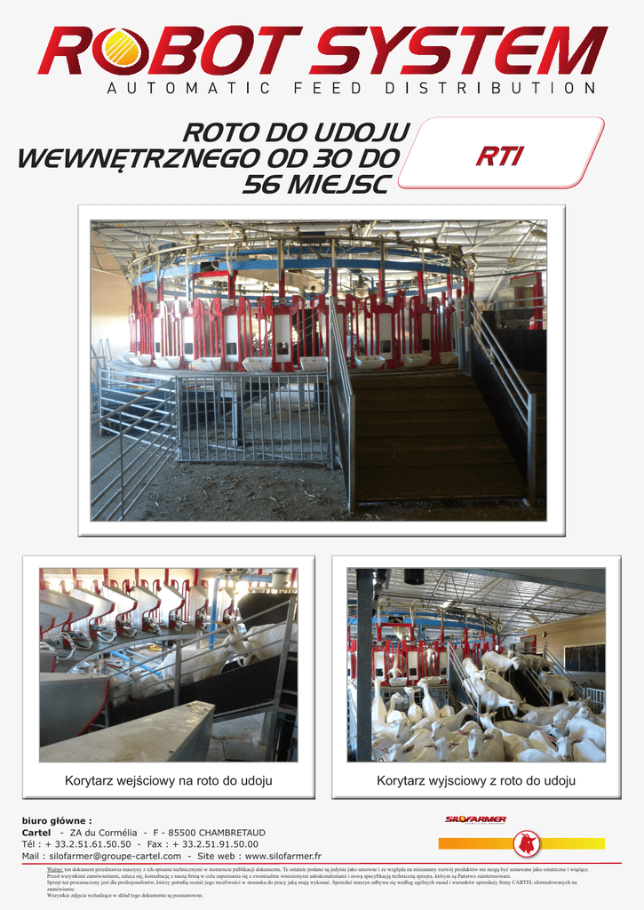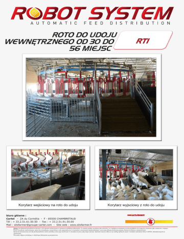 ROTO DO UDOJU WEWNĘTRZNEGO OD 30 DO 56 MIEJSC Korytarz wejściowy na roto do udoju RTI Korytarz wyjsciowy z roto do udoju biuro główne : Cartel - ZA du Cormélia - F - 85500 CHAMBRETAUD Tél : + 33.2.51.61.50.50 - Fax : + 33.2.51.91.50.00 Mail : [email protected] - Site web : www.silofarmer.fr Ważne: ten dokument przedstawia maszyny z ich opisami technicznymi w momencie publikacji dokumentu. Te ostatnie podane są jedynie jako umowne i ze względu na nieustanny rozwój produktów nie mogą być uznawane jako ostateczne i wiążące. Przed wszystkimi zamówieniami, zaleca się, konsultację z naszą firmą w celu zapoznania się z ewentualnie wniesionymi udoskonaleniami i nową specyfikacją techniczną sprzętu, którym są Państwo zainteresowani. Sprzęt ten przeznaczony jest dla profesjonalistów, którzy potrafią ocenić jego możliwości w stosunku do pracy jaką mają wykonać. Sprzedaż maszyn odbywa się według ogólnych zasad i warunków sprzedaży firmy CARTEL sformułowanych na zamówieniu. Wszystkie zdjęcia wchodzące w skład tego dokumentu są pozaumowne. Poprzeczna belka zawierająca : elektryczność -zasysacz próżniowy mleka system ewakuacyjny mleka do rezerwuaru Zautomatyzowana wejściowa komora separacyjna Zespół napędu zmotoryzowanym Indywidualne stanowisko dojenia biuro główne : Cartel - ZA du Cormélia - F - 85500 CHAMBRETAUD Tél : + 33.2.51.61.50.50 - Fax : + 33.2.51.91.50.00 Mail : [email protected] - Site web : www.silofarmer.fr Ważne: ten dokument przedstawia maszyny z ich opisami technicznymi w momencie publikacji dokumentu. Te ostatnie podane są jedynie jako umowne i ze względu na nieustanny rozwój produktów nie mogą być uznawane jako ostateczne i wiążące. Przed wszystkimi zamówieniami, zaleca się, konsultację z naszą firmą w celu zapoznania się z ewentualnie wniesionymi udoskonaleniami i nową specyfikacją techniczną sprzętu, którym są Państwo zainteresowani. Sprzęt ten przeznaczony jest dla profesjonalistów, którzy potrafią ocenić jego możliwości w stosunku do pracy jaką mają wykonać. Sprzedaż maszyn odbywa się według ogólnych zasad i warunków sprzedaży firmy CARTEL sformułowanych na zamówieniu. Wszystkie zdjęcia wchodzące w skład tego dokumentu są pozaumowne. Ekran dotykowy do sterowania Dystrybucja koncentratu paszowego Zautomatyzowany dystrybutor koncentratu paszowego Kozy w czasie dojenia biuro główne : Cartel - ZA du Cormélia - F - 85500 CHAMBRETAUD Tél : + 33.2.51.61.50.50 - Fax : + 33.2.51.91.50.00 Mail : [email protected] - Site web : www.silofarmer.fr Ważne: ten dokument przedstawia maszyny z ich opisami technicznymi w momencie publikacji dokumentu. Te ostatnie podane są jedynie jako umowne i ze względu na nieustanny rozwój produktów nie mogą być uznawane jako ostateczne i wiążące. Przed wszystkimi zamówieniami, zaleca się, konsultację z naszą firmą w celu zapoznania się z ewentualnie wniesionymi udoskonaleniami i nową specyfikacją techniczną sprzętu, którym są Państwo zainteresowani. Sprzęt ten przeznaczony jest dla profesjonalistów, którzy potrafią ocenić jego możliwości w stosunku do pracy jaką mają wykonać. Sprzedaż maszyn odbywa się według ogólnych zasad i warunków sprzedaży firmy CARTEL sformułowanych na zamówieniu. Wszystkie zdjęcia wchodzące w skład tego dokumentu są pozaumowne. LA GAMME COMPLETE Distributeur au sol d’aliment pour bovins / caprins / ovins. DS-ROB Distributeur d’aliment au sol robotisé Distributeurs aériens d’aliments DA 300 / DA 500 Distributeur pour Bovins / Caprins / Ovins DA-VEAUX Distributeur pour veaux de boucherie Distributeur porté DAVR Distributeur pour Volailles rationnées Equipements pour salle de traite CEB Chien électrique DA60 Distributeur pour salle de traite DAPAG Distributeur aérien pour canards prêts à gaver biuro główne : CARTEL ZA du Cormélia F - 85500 CHAMBRETAUD Tél : + 33.2.51.61.50.50 Fax : + 33.2.51.91.50.00 Mail : [email protected] Site web : www.silofarmer.fr Roto de traite intérieur de 30 à 56 places. Ważne: ten dokument przedstawia maszyny z ich opisami technicznymi w momencie publikacji dokumentu. Te ostatnie podane są jedynie jako umowne i ze względu na nieustanny rozwój produktów nie mogą być uznawane jako ostateczne i wiążące. Przed wszystkimi zamówieniami, zaleca się, konsultację z naszą firmą w celu zapoznania się z ewentualnie wniesionymi udoskonaleniami i nową specyfikacją techniczną sprzętu, którym są Państwo zainteresowani. Sprzęt ten przeznaczony jest dla profesjonalistów, którzy potrafią ocenić jego możliwości w stosunku do pracy jaką mają wykonać. Sprzedaż maszyn odbywa się według ogólnych zasad i warunków sprzedaży firmy CARTEL sformułowanych na zamówieniu. Wszystkie zdjęcia wchodzące w skład tego dokumentu są pozaumowne.