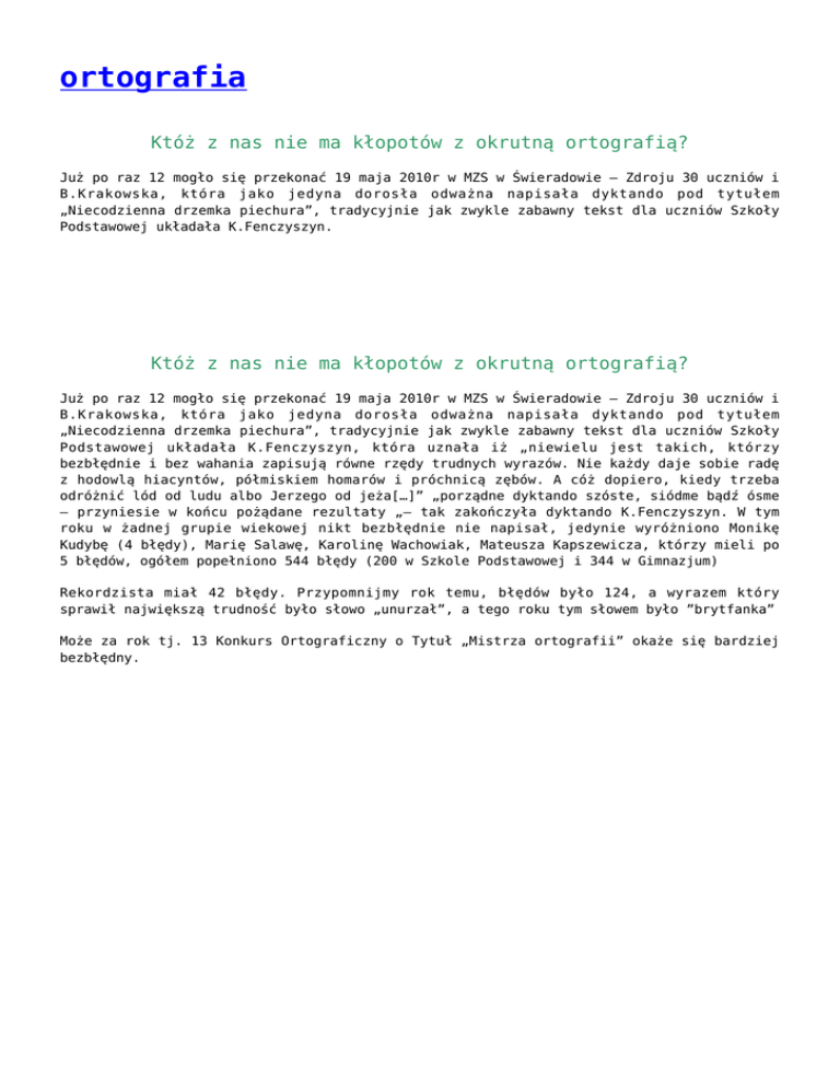 ortografia Któż z nas nie ma kłopotów z okrutną ortografią? Już po raz 12 mogło się przekonać 19 maja 2010r w MZS w Świeradowie – Zdroju 30 uczniów i B.Krakowska, która jako jedyna dorosła odważna napisała dyktando pod tytułem „Niecodzienna drzemka piechura”, tradycyjnie jak zwykle zabawny tekst dla uczniów Szkoły Podstawowej układała K.Fenczyszyn. Któż z nas nie ma kłopotów z okrutną ortografią? Już po raz 12 mogło się przekonać 19 maja 2010r w MZS w Świeradowie – Zdroju 30 uczniów i B.Krakowska, która jako jedyna dorosła odważna napisała dyktando pod tytułem „Niecodzienna drzemka piechura”, tradycyjnie jak zwykle zabawny tekst dla uczniów Szkoły Podstawowej układała K.Fenczyszyn, która uznała iż „niewielu jest takich, którzy bezbłędnie i bez wahania zapisują równe rzędy trudnych wyrazów. Nie każdy daje sobie radę z hodowlą hiacyntów, półmiskiem homarów i próchnicą zębów. A cóż dopiero, kiedy trzeba odróżnić lód od ludu albo Jerzego od jeża[…]” „porządne dyktando szóste, siódme bądź ósme – przyniesie w końcu pożądane rezultaty „– tak zakończyła dyktando K.Fenczyszyn. W tym roku w żadnej grupie wiekowej nikt bezbłędnie nie napisał, jedynie wyróżniono Monikę Kudybę (4 błędy), Marię Salawę, Karolinę Wachowiak, Mateusza Kapszewicza, którzy mieli po 5 błędów, ogółem popełniono 544 błędy (200 w Szkole Podstawowej i 344 w Gimnazjum) Rekordzista miał 42 błędy. Przypomnijmy rok temu, błędów było 124, a wyrazem który sprawił największą trudność było słowo „unurzał”, a tego roku tym słowem było ”brytfanka” Może za rok tj. 13 Konkurs Ortograficzny o Tytuł „Mistrza ortografii” okaże się bardziej bezbłędny.