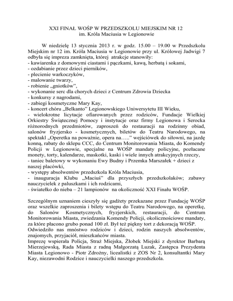 XXI FINAŁ WOŚP W PRZEDSZKOLU MIEJSKIM NR 12 im. Króla Maciusia w Legionowie W niedzielę 13 stycznia 2013 r. w godz. 15.00 – 19.00 w Przedszkolu Miejskim nr 12 im. Króla Maciusia w Legionowie przy ul. Królowej Jadwigi 7 odbyła się impreza zamknięta, której atrakcje stanowiły: - kawiarenka z domowymi ciastami i pączkami, kawą, herbatą i sokami, - ozdabianie przez dzieci pierników, - plecienie warkoczyków, - malowanie twarzy, - robienie „gniotków”, - wykonanie serc dla chorych dzieci z Centrum Zdrowia Dziecka - konkursy z nagrodami, - zabiegi kosmetyczne Mary Kay, - koncert chóru „Belkanto” Legionowskiego Uniwersytetu III Wieku, - wielokrotne licytacje ofiarowanych przez rodziców, Fundacje Wielkiej Orkiestry Świątecznej Pomocy i instytucje oraz firmy Legionowa i Serocka różnorodnych przedmiotów, zaproszeń do restauracji na rodzinny obiad, salonów fryzjersko - kosmetycznych, biletów do Teatru Narodowego, na spektakl „Operetka na poważnie, opera na…..” wejściówek do siłowni, na jazdę konną, rabaty do sklepu CCC, do Centrum Monitorowania Miasta, do Komendy Policji w Legionowie, specjalne na WOŚP mandaty policyjne, pozłacane monety, torty, kalendarze, maskotki, kaski i wiele innych atrakcyjnych rzeczy, - taniec baletowy w wykonaniu Ewy Budny i Przemka Marszałek + dzieci z naszej placówki, - występy absolwentów przedszkola Króla Maciusia, - inauguracja Klubu „Maciuś” dla przyszłych przedszkolaków; zabawy nauczycielek z paluszkami i ich rodzicami, - światełko do nieba – 21 lampionów na okoliczność XXI Finału WOŚP. Szczególnym uznaniem cieszyły się gadżety przekazane przez Fundację WOŚP oraz wszelkie zaproszenia i bilety wstępu do Teatru Narodowego, na operetkę, do Salonów Kosmetycznych, fryzjerskich, restauracji, do Centrum Monitorowania Miasta, zwiedzania Komendy Policji, okolicznościowe mandaty, za które płacono grubo ponad 100 zł. Był też piękny tort z dekoracją WOŚP. Odwiedziło nas mnóstwo rodziców i dzieci, rodzin naszych absolwentów, znajomych, przyjaciół, mieszkańców miasta. Imprezę wspierała Policja, Straż Miejska, Żłobek Miejski z dyrektor Barbarą Mierzejewską, Rada Miasta z radną Małgorzatą Luzak, Zastępca Prezydenta Miasta Legionowo - Piotr Zdrożny, licealistki z ZOS Nr 2, konsultantki Mary Kay, niezawodni Rodzice i nauczycielki naszego przedszkola. 13 stycznia 2013 r. podczas imprezy zamkniętej uzyskano kwotę 6247,35 zł., która została przekazana do Sztabu Liceum Ogólnokształcącego im. Marii Konopnickiej w Legionowie a następnie odwieziona do WOŚP w Studiu Telewizyjnym w Warszawie. 14 stycznia 2013 r. ze sprzedaży kalendarzy w Przedszkolu Miejskim Nr 12 im. Króla Maciusia w Legionowie uzyskano kwotę 84 zł. Pieniądze te przekazano na konto finałowe WOŚP 58 124011121111001047708382. Łączna kwota uzyskana w Przedszkolu Miejskim Nr 12 im. Króla Maciusia w Legionowie przy ul. Królowej Jadwigi 7 podczas XXI Finału WOŚP wynosi 6 331,35 zł. Gorąco dziękuję sponsorom, uczestnikom naszej imprezy, dzieciom, Rodzicom, pracownikom przedszkola i wszystkim ludziom o gorących sercach. Szczególne podziękowania otrzymują ofiarodawcy: 1. Bank BPH 2. ING Bank Śląski 3. Teatr Narodowy w Warszawie 4. Hotel Pan Tadeusz w Serocku 5. Fundacja WOŚP 6. Salon Fryzjersko-Kosmetyczny "Styl" Moniki Bulik-Przygody 7. Salon Urody "U Kasi" w Serocku 8. "Perła" w Michałowie-Reginowie 9. Telewizja Polska 10. Urząd Miasta Legionowo 11. Starostwo Powiatowe 12. Komenda Policji w Legionowie 13. Straż Miejska w Legionowie 14. Stajnia Ostoja w Warszawie 15. Rodzice Przedszkola Miejskiego Nr 12 16. Absolwenci naszego przedszkola i ich rodziny 17. Rada Rodziców PM 12 18. Piekarnia Hetmańska 19. Cukiernia Augustyniak 20. PZU w Legionowie 21. Sklep obuwniczy CCC 22. Żłobek Miejski w Legionowie 23. Firma Kosmetyczna Mary Kay 24. Wolontariuszki z Zespołu Szkół Nr 2 w Legionowie 25. Państwo Sadowscy 26. Państwo Kiełbasińscy 27. Adaś Bochenek z Mamą 27. Państwo Żelazowscy Z wyrazami szacunku i wdzięczności Grażyna Chojnowska