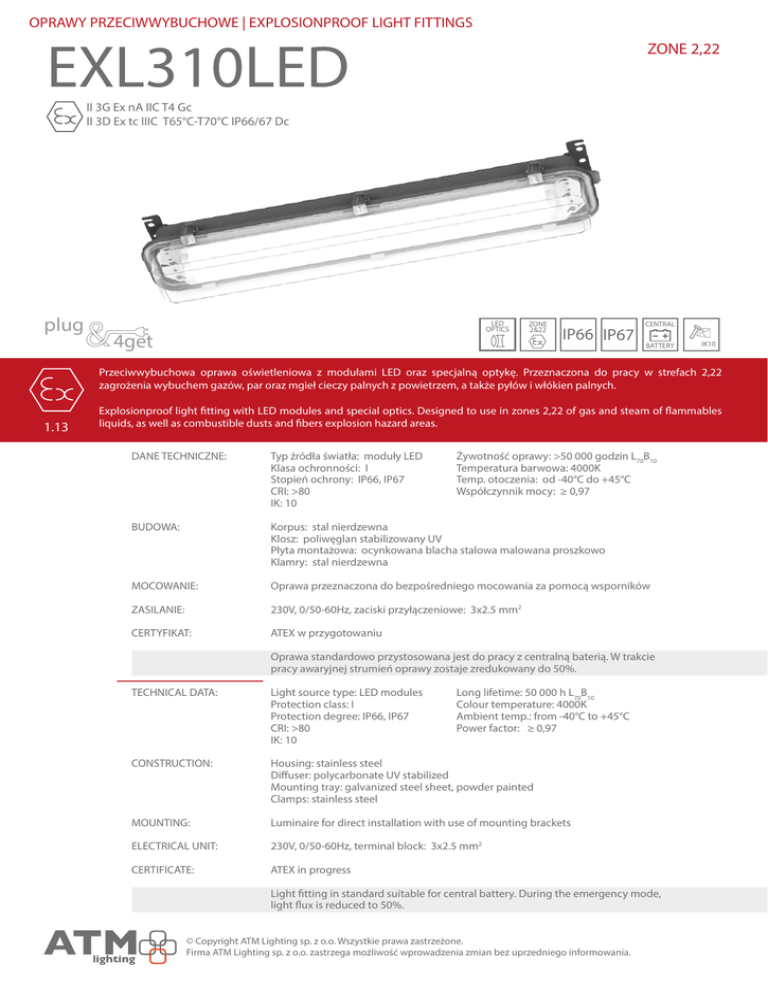 OPRAWY PRZECIWWYBUCHOWE | EXPLOSIONPROOF LIGHT FITTINGS EXL310LED ZONE 2,22 II 3G Ex nA IIC T4 Gc II 3D Ex tc IIIC T65°C-T70°C IP66/67 Dc plug LED OPTICS 4get ZONE 2&22 IP66 IP67 CENTRAL BATTERY IK10 Przeciwwybuchowa oprawa oświetleniowa z modułami LED oraz specjalną optykę. Przeznaczona do pracy w strefach 2,22 zagrożenia wybuchem gazów, par oraz mgieł cieczy palnych z powietrzem, a także pyłów i włókien palnych. 1.13 Explosionproof light fitting with LED modules and special optics. Designed to use in zones 2,22 of gas and steam of flammables liquids, as well as combustible dusts and fibers explosion hazard areas. DANE TECHNICZNE: Typ źródła światła: moduły LED Żywotność oprawy: >50 000 godzin L70B10 Klasa ochronności: I Temperatura barwowa: 4000K Stopień ochrony: IP66, IP67 Temp. otoczenia: od -40°C do +45°C CRI: >80Współczynnik mocy: ≥ 0,97 IK: 10 BUDOWA: Korpus: stal nierdzewna Klosz: poliwęglan stabilizowany UV Płyta montażowa: ocynkowana blacha stalowa malowana proszkowo Klamry: stal nierdzewna MOCOWANIE: Oprawa przeznaczona do bezpośredniego mocowania za pomocą wsporników ZASILANIE: 230V, 0/50-60Hz, zaciski przyłączeniowe: 3x2.5 mm2 CERTYFIKAT: ATEX w przygotowaniu Oprawa standardowo przystosowana jest do pracy z centralną baterią. W trakcie pracy awaryjnej strumień oprawy zostaje zredukowany do 50%. TECHNICAL DATA: Light source type: LED modules Long lifetime: 50 000 h L70B10 Protection class: IColour temperature: 4000K Protection degree: IP66, IP67 Ambient temp.: from -40°C to +45°C CRI: >80 Power factor: ≥ 0,97 IK: 10 CONSTRUCTION: Housing: stainless steel Diffuser: polycarbonate UV stabilized Mounting tray: galvanized steel sheet, powder painted Clamps: stainless steel MOUNTING: Luminaire for direct installation with use of mounting brackets ELECTRICAL UNIT: 230V, 0/50-60Hz, terminal block: 3x2.5 mm2 CERTIFICATE: ATEX in progress Light fitting in standard suitable for central battery. During the emergency mode, light flux is reduced to 50%. © Copyright ATM Lighting sp. z o.o. Wszystkie prawa zastrzeżone. Firma ATM Lighting sp. z o.o. zastrzega możliwość wprowadzenia zmian bez uprzedniego informowania. OPRAWY PRZECIWWYBUCHOWE | EXPLOSIONPROOF LIGHT FITTINGS ZONE 2,22 WYMIARY | DIMENSIONS FOTOMETRIA | PHOTOMETRY B L H 300 Ø9mm L1 450 600 750 B1 B2 TYP | TYPE EXL310LED-0600 EXL310LED-1200 L 730 1340 L1 704 1314 B 150 150 B1 60 60 H 134 134 B2 85 85 ZESTAWIENIE TYPÓW | TYPES COMPARISON TYP OPRAWY STRUMIEŃ OPRAWY [lm] MOC POBIERANA [W] TYPE OF LIGHT FITTING LUMINOUS FLUX [lm] POWER CONSUMPTION [W] EXL310LED-0600-E2 25 2775 EXL310LED-0600-E4 41 4715 EXL310LED-1200-E4 48,4 5390 EXL310LED-1200-E8 67,5 7675 SPRAWNOŚĆ [lm/W] EFFICIENCY [lm/W] 111 115 111 114 ZAMIENNIK T8 REPLACEMENT T8 2x18 2x36 2x36 2x58 1.14 PORÓWNANIE OSZCZĘDNOŚCI | SAVINGS COMPARISON TYP OPRAWY TYPE OF LIGHT FITTING EXL310LED-0600-E2 EXL310LED-0600-E4 EXL310LED-1200-E4 EXL310LED-1200-E8 OSZCZĘDNOŚCI* SAVINGS 34% 47% 38% 47% OSZCZĘDNOŚĆ SYSTEMU 1:1** SYSTEM SAVINGS 1:1** 53% 50% 48% 55% * oszczędności zużycia energii elektrycznej oprawy EXL310LED w porównaniu do opraw innych producentów wyposażonych w źródła światła T8 | power consumption savings of EXL310LED luminaire compared to other producers standard T8 light fittings ** oszczędności zużycia energii elektrycznej oprawy EXL310LED w porównaniu do opraw innych producentów wyposażonych w źródła światła T8, przy założeniu zachowania jednakowego strumienia świetlnego porównywanych urządzeń | power consumption savings of EXL310LED luminaire compared to other producers standard T8 light fittings, assuming equal light flux of compared devices DOSTĘPNE KONFIGURACJE | AVAILABLE OPTIONS EXL 3 1 0 L ED E 3 5 E NIRO PC 0 60 0 2 30 10 M 20 A3 1 20 0 4 33 11 P 25 20 RST ZB 8 plug 4get wersja awaryjna emergency version materiał klosza diffuser material materiał obudowy housing material wpusty kablowe cable inlets okablowanie wiring zasilanie power supply typ modułu LED / LED module type 22 ilość /quantity przybliżona długość approximate length typ type grupa group 21 Opcjonalna wersja z zestawem gniazda i wtyku, dzięki czemu nie jest wymagane otwarcie oprawy podczas montażu. Rozwiązanie tego typu pozwala na ekspresowy montaż oraz upraszcza dalszą eksploatację urządzenia. Optional version with plug&socket set, so it is not needed to open the fitting during installation. This solution allows fast assembly and simplifies further exploatation © Copyright ATM Lighting sp. z o.o. All rights reserved. Technical modification reserved without prior notice. www.atmlighting.pl [email protected] KONFIGURACJA OPRAW | LIGHT FITTING CONFIGURATION 20 10 M 20 PC PC 22 11 P AL PM 30 20 PCI GS GL 33 40 21 22 NIRO SAN SGL typ modułu LED, ich ilość oraz prąd sterowania są z góry ustalone dla danej oprawy LED module type, quantity, forward current are specified for each typ of light fitting 35E - 230V, 0/50-60Hz 34E - 230V, 50-60Hz 11E - 24VDC 20 - 2 żyły końcowe 2 wires ending 22 - 2 żyły przelotowe 2 wires through 30 - 3 żyły końcowe 3 wires ending 33 - 3 żyły przelotowe 3 wires through 40 - 4 żyły końcowe 4 wires ending 44 - 4 żyły przelotowe 4 wires through 10, 11, 20, 21, 22 - układ dławnic pokazano na rysunku poniżej cable glands entries positions are shown below 10 11 20 21 P - dławnica z tworzywa sztucznego plastic cable gland M - dławnica z metalu metal cable gland PCI - przepust kablowy o średnicy Ø20 plastic cable inlets Ø20 22 20 - dławnica M20 M20 cable gland 25 - dławnica M25 M25 cable gland PC - poliwęglan polycarbonate AL - aluminium GS - stal ocynkowana galvanized steel NIRO - stal nierdzewna stainless steel GRP - poliester wzmocniony włóknem zklanym fibre glass strengthened polyester PC - poliwęglan polycarbonate PM - PMMA GL - szkło hartowane tempered glass SAN - kopolimer styrenu i akrylonitrylu styrene acrylonitrile resin SGL - safety-g
