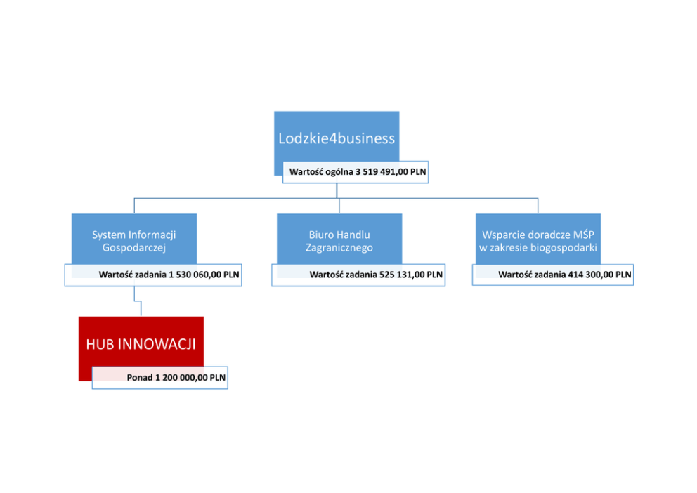 Lodzkie4business Wartość ogólna 3 519 491,00 PLN System Informacji Gospodarczej Wartość zadania 1 530 060,00 PLN HUB INNOWACJI Ponad 1 200 000,00 PLN Biuro Handlu Zagranicznego Wartość zadania 525 131,00 PLN Wsparcie doradcze MŚP w zakresie biogospodarki Wartość zadania 414 300,00 PLN Hub innowacji będzie wspierał proces internacjonalizacji i podnoszenia poziomu innowacyjności regionalnych przedsiębiorstw. Zadanie zakłada utworzenie przestrzeni co-workingowej, na którą składać się będą: pomieszczenie open space, jak również wyodrębnione pokoje, w których osoba zgłaszająca się ze swoim pomysłem będzie mogła skorzystać z porady, czy omówić swój projekt ze specjalistą/mentorem pełniącym na terenie Hubu dyżur. Planowane otwarcie to 1 października 2017 r. W ramach zadania uruchomione zostaną: 1. Rada Aniołów Biznesu. W jej skład wchodzić będą osoby, które osiągnęły sukces biznesowy, również na rynkach międzynarodowych i są gotowe podzielić się z młodymi, dopiero startującymi w biznesie ludźmi swoją wiedzą i doświadczeniem w zakładaniu, prowadzeniu i rozwijaniu biznesu, w kontekście jego internacjonalizacji. Rada Aniołów Biznesu powołana zostanie pod koniec 2017 r. i będzie blisko współpracować z Gildią Aniołów Biznesu powołanej przez Łódzką Agencję Rozwoju Regionalnego. Porady będą BEZPŁATNE. 2. Rada Mentorów, w skład której będzie wchodzić pięciu doradców z zakresu organizacji i zarządzania przedsiębiorstwem, prawa i finansów międzynarodowych, podatków oraz psychologii biznesu i marketingu. Organizacja dyżurów pełnionych przez członków Rady Mentorów oparta będzie na założeniu, że każdego dnia na terenie Hubu pełnił będzie dyżur minimum jeden ze specjalistów. 3. Organizacja i koordynowanie szkoleń/warsztatów. W Hubie organizowane będą szkolenia/warsztaty z udziałem zarówno krajowej jak i światowej klasy specjalistów z zakresu biznesu i dziedzin około biznesowych, niebędących członkami Rady Aniołów Biznesu i Rady Mentorów. Pierwsze warsztaty i szkolenia odbędą się na początku 2018 r. Planowa 4. Organizowanie spotkań B2B. Spotkania B2B z biznesmenami dążące do podpisania umów międzynarodowych służą animowaniu powiązań kooperacyjnych, w których uczestniczą przedsiębiorstwa z sektora MŚP. 5. Udział w międzynarodowych i krajowych targach. Pracownicy Hubu wraz z przedstawicielami startupów i firm MŚP współpracujących z hubem, będą uczestniczyć (zarówno w formie wystawcy jak i w formie uczestnika) w międzynarodowych i krajowych targach lub wystawach by aktywnie promować region łódzki, pozyskiwać inwestorów oraz nawiązywać kontakty z przedsiębiorcami zagranicznymi, by skojarzyć je z firmami z regionu łódzkiego. Planowane targi: a. CeBIT Międzynarodowe Targi Technologii Informatycznych i Telekomunikacyjnych, Hanower, Niemcy, marzec 2018 b. Gitex Technology Week, Dubaj, Zjednoczone Emiraty Arabskie październik 2018 c. INTARG, Katowice, czerwiec 2018 d. Giełda Wynalazków, Centrum Nauki Kopernik w Warszawie, marzec 2018 Planowane są także wizyty studyjne: a. Google Campus – Warszawa, Polska – IV kwartał 2017 b. Oxford Centre for Innovation, Wielka Brytania – IV kwartał 2017 c. Sturtup Lisobao, Lizbona, Portugalia – I kwartał 2018 d. Technopol - Talin, Estonia – II kwartał 2018 e. European Innovation Hub GmbH, Berlin, Niemcy – III kwartał 2019 f. High Tech Campus - Eindhoven, Holandia – IV kwartał 2018 Ponadto w ramach pracy Hubu zostaną zatrudnione 3 osoby (1 koordynator hubu i 2-óch konsultantów). Jedna osoba zostanie zatrudniona już w maju 2017 r.