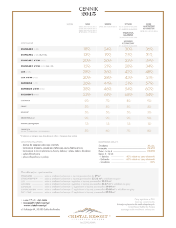 CENNIK 2015 SEZON NISKI ŚREDNI WYSOKI 08.03.2015–01.04.2015 07.04.2015–29.04.2015 03.05.2015–31.05.2015 27.09.2015–17.12.2015 07.06.2015–26.09.2015 02.01.2015–07.03.2015 01.04.2015–06.04.2015 BOŻE NARODZENIE I SYLWESTER 18.12.2015–01.01.2016 WIELKANOC MAJÓWKA 30.04.2015–02.05.2015 WEEKEND CZERWCOWY APARTAMENT 189,139,209,159,289,309,369,389,539,- 249,199,269,219,369,389,449,469,619,- DOSTAWKA 60,- OBIAD* 01.06.2015–06.06.2015 309,259,339,289,429,459,519,549,689,- 369,319,399,349,489,519,579,609,549,- 70,- 80,- 90,- 50,- 50,- 50,- 50,- KOLACJA* 50,- 50,- 50,- 50,- OBIAD I KOLACJA* 90,- 90,- 90,- 90,- PARKING ZEWNĘTRZNY 15,- 15,- 15,- 15,- ZWIERZĘTA (PO WCZEŚNIEJSZYM UZGODNIENIU) 50,- 60,- 70,- 80,- STANDARD (2-OS.) STANDARD (2-OS.) DLA 1 OS. STANDARD VIEW (2-OS.) STANDARD VIEW (2-OS.) DLA 1 OS. LUX (2-OS.) LUX VIEW (2-OS.) SUPERIOR (3-OS.) SUPERIOR VIEW (3-OS.) EXCLUSIVE (5-OS.) *W zależności od ilości gości: zupa, danie główne do wyboru z 2 propozycji, deser lub bufet CENA POKOJU ZAWIERA: DODATKOWE OPŁATY: – dostęp do bezprzewodowego internetu – korzystanie z basenu, jacuzzi zewnętrznego, sauny, łaźni parowej – korzystanie z siłowni plenerowej, Krainy Zabawy i placu zabaw dla dzieci – opłatę klimatyczną – płaszcz kąpielowy w pokoju Śniadanie ------------------------------------------------------------------------------------------ 39,-/os. Łóżeczko -------------------------------------------------------------------------------------------- GRATIS Dzieci do lat 4 ------------------------------------------------------------------------------- GRATIS Dzieci 4–12 lat: – I dziecko ------------------------------ -40% rabat od ceny dostawki – II dziecko ----------------------------- -60% rabat od ceny dostawki – Śniadanie ------------------------------------------------------------------------------------- -50% Charakterystyka apartamentów: STANDARD ---------------------STANDARD VIEW ------LUX ---------------------------------------LUX VIEW ------------------------SUPERIOR ----------------------SUPERIOR VIEW ------------EXCLUSIVE ------------------------ salon z aneksem kuchennym o łącznej powierzchni do 29 m² salon z aneksem kuchennym o łącznej powierzchni 22-36 m² z widokiem na góry salon z aneksem kuchennym i sypialnią o łącznej powierzchni 29-59 m² salon z aneksem kuchennym i sypialnią o łącznej powierzchni 33-67 m² z widokiem na góry salon z aneksem kuchennym i 2 sypialniami o łącznej powierzchni 59-89 m² salon z aneksem kuchennym i 2 sypialniami o łącznej powierzchni 43-60 m² z widokiem na góry salon z aneksem kuchennym i 3 sypialniami o łącznej powierzchni 89-94 m² Ceny wyrażone w PLN. Ceny są cenami brutto. T: (+48) 75.61.06.888 E: [email protected] Pokoje wyłącznie dla osób niepalących. www.cristal-resort.pl Cristal Resort Szklarska Poręba zastrzega sobie możliwość zmiany cen. ul. Kołłątaja 4A, 58-580 Szklarska Poręba by ZDROJOWA
