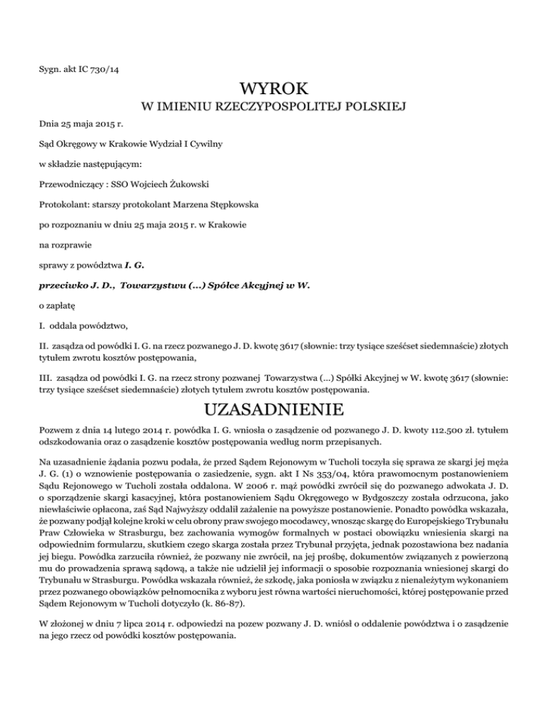 Sygn. akt IC 730/14 WYROK W IMIENIU RZECZYPOSPOLITEJ POLSKIEJ Dnia 25 maja 2015 r. Sąd Okręgowy w Krakowie Wydział I Cywilny w składzie następującym: Przewodniczący : SSO Wojciech Żukowski Protokolant: starszy protokolant Marzena Stępkowska po rozpoznaniu w dniu 25 maja 2015 r. w Krakowie na rozprawie sprawy z powództwa I. G. przeciwko J. D., Towarzystwu (...) Spółce Akcyjnej w W. o zapłatę I. oddala powództwo, II. zasądza od powódki I. G. na rzecz pozwanego J. D. kwotę 3617 (słownie: trzy tysiące sześćset siedemnaście) złotych tytułem zwrotu kosztów postępowania, III. zasądza od powódki I. G. na rzecz strony pozwanej Towarzystwa (...) Spółki Akcyjnej w W. kwotę 3617 (słownie: trzy tysiące sześćset siedemnaście) złotych tytułem zwrotu kosztów postępowania. UZASADNIENIE Pozwem z dnia 14 lutego 2014 r. powódka I. G. wniosła o zasądzenie od pozwanego J. D. kwoty 112.500 zł. tytułem odszkodowania oraz o zasądzenie kosztów postępowania według norm przepisanych. Na uzasadnienie żądania pozwu podała, że przed Sądem Rejonowym w Tucholi toczyła się sprawa ze skargi jej męża J. G. (1) o wznowienie postępowania o zasiedzenie, sygn. akt I Ns 353/04, która prawomocnym postanowieniem Sądu Rejonowego w Tucholi została oddalona. W 2006 r. mąż powódki zwrócił się do pozwanego adwokata J. D. o sporządzenie skargi kasacyjnej, która postanowieniem Sądu Okręgowego w Bydgoszczy została odrzucona, jako niewłaściwie opłacona, zaś Sąd Najwyższy oddalił zażalenie na powyższe postanowienie. Ponadto powódka wskazała, że pozwany podjął kolejne kroki w celu obrony praw swojego mocodawcy, wnosząc skargę do Europejskiego Trybunału Praw Człowieka w Strasburgu, bez zachowania wymogów formalnych w postaci obowiązku wniesienia skargi na odpowiednim formularzu, skutkiem czego skarga została przez Trybunał przyjęta, jednak pozostawiona bez nadania jej biegu. Powódka zarzuciła również, że pozwany nie zwrócił, na jej prośbę, dokumentów związanych z powierzoną mu do prowadzenia sprawą sądową, a także nie udzielił jej informacji o sposobie rozpoznania wniesionej skargi do Trybunału w Strasburgu. Powódka wskazała również, że szkodę, jaka poniosła w związku z nienależytym wykonaniem przez pozwanego obowiązków pełnomocnika z wyboru jest równa wartości nieruchomości, której postępowanie przed Sądem Rejonowym w Tucholi dotyczyło (k. 86-87). W złożonej w dniu 7 lipca 2014 r. odpowiedzi na pozew pozwany J. D. wniósł o oddalenie powództwa i o zasądzenie na jego rzecz od powódki kosztów postępowania. Pozwany zarzucił, że powódka nie wykazała zasadności oraz wysokości dochodzonego roszczenia, wskazując jednocześnie na brak adekwatnego związku przyczynowego między niewłaściwym opłaceniem przez niego skargi kasacyjnej a szkodą powódki. Według pozwanego nawet gdyby skarga została właściwie opłacona, to nie oznacza to, że byłaby rozpoznana przez Sąd Najwyższy, który mógł nie podzielić stanowiska powódki wyrażonego w skardze kasacyjnej, w przypadku przyjęcia skargi kasacyjnej do rozpoznania, nie musiała ona zostać uwzględniona, tym samym powódka nie wykazała, by w przypadku prawidłowego opłacenia skargi kasacyjnej doszło do jej rozpoznania przez Sąd Najwyższy, a nadto, by rozpoznanie to, przyniosło jej korzystny wynik. Pozwany wskazał, że Trybunał w Strasburgu uznał, że nie doszło do naruszenia praw i wolności zawartych w Konwencji Praw Człowieka i jej protokołach dodatkowych, a nadto podał, że dokumenty związane ze sprawą przedmiotowej skargi kasacyjnej zostały powódce wydane w dniu 30 marca 2007 r., co zostało przez powódkę własnoręcznie pokwitowane. Pozwany wskazał również, że wszystkie koszty poniesione przez powódkę w związku ze skargą kasacyjną zostały jej zwrócone, tym samym powódka nie ma żadnych podstaw do dochodzenia odszkodowania z tytułu niewłaściwego opłacenia skargi kasacyjnej. W złożonej w dniu 22 grudnia 2014 r. odpowiedzi na pozew strona pozwana Towarzystwo (...) S.A. w W. wniosła o oddalenie powództwa i o zasądzenie od powódki zwrotu kosztów postępowania, w tym kosztów zastępstwa procesowego. Według pozwanego Ubezpieczyciela w przedmiotowej sprawie nie jest możliwe stwierdzenie kumulatywnego wystąpienia wszelkich przesłanek odpowiedzialności odszkodowawczej po stronie adwokata J. D., w szczególności nie jest możliwe stwierdzenie istnienia szkody w majątku powódki oraz adekwatnego związku przyczynowego, pomiędzy brakiem wniesienia opłaty od skargi kasacyjnej wniesionej od postanowienia Sądu Okręgowego w Bydgoszczy II Wydział Cywilny-Odwoławczy z dnia 24 listopada 2005 roku, sygn. akt II Ca 604/05 a uprawomocnieniem się niekorzystnego dla męża powódki J. G. (1) orzeczenia. Jednocześnie strona pozwana podkreśliła, że dla przyjęcia zaistnienia szkody, prawdopodobieństwo uzyskania korzystnego wyniku sprawy, winno być wykazane w stopniu nawet nie tyle wysokim, co wystarczająco wysokim na podstawie hipotetycznego przebiegu zdarzeń, którego ocena opierać się powinna na rozsądku, doświadczeniu życiowym, wiedzy i logice. W ocenie pozwanego Ubezpieczyciela w sprawie prowadzonej przed Sądem Okręgowym w Bydgoszczy nie sposób przyjąć istnienia jakichkolwiek podstaw do wniesienia skargi kasacyjnej w oparciu o przepis art. 379 k.p.c. z uwagi na nieważność postępowania, nie występuje również istotne zagadnienie prawne, a z okoliczności sprawy nie wynika, by skarga kasacyjna była oczywiście uzasadniona, co oznacza, że w przedmiotowej sprawie nie sposób stwierdzić, jakoby w ogóle mogło dojść do przyjęcia skargi kasacyjnej do rozpoznania, nawet w przypadku jej skutecznego wniesienia. Sąd ustalił następujący stan faktyczny: Postanowieniem z dnia 3 kwietnia 2002 r. Sąd Rejonowy w Tucholi (sygn. akt I Ns 299/01) orzekł, że Skarb Państwa nabył z dniem 1 s